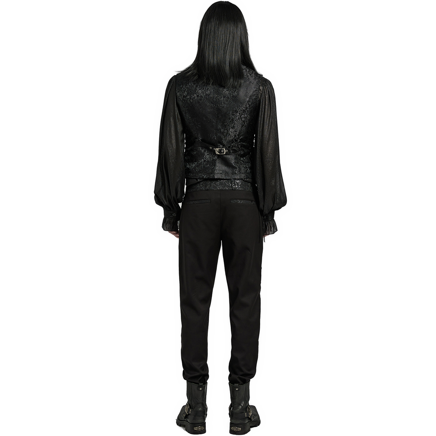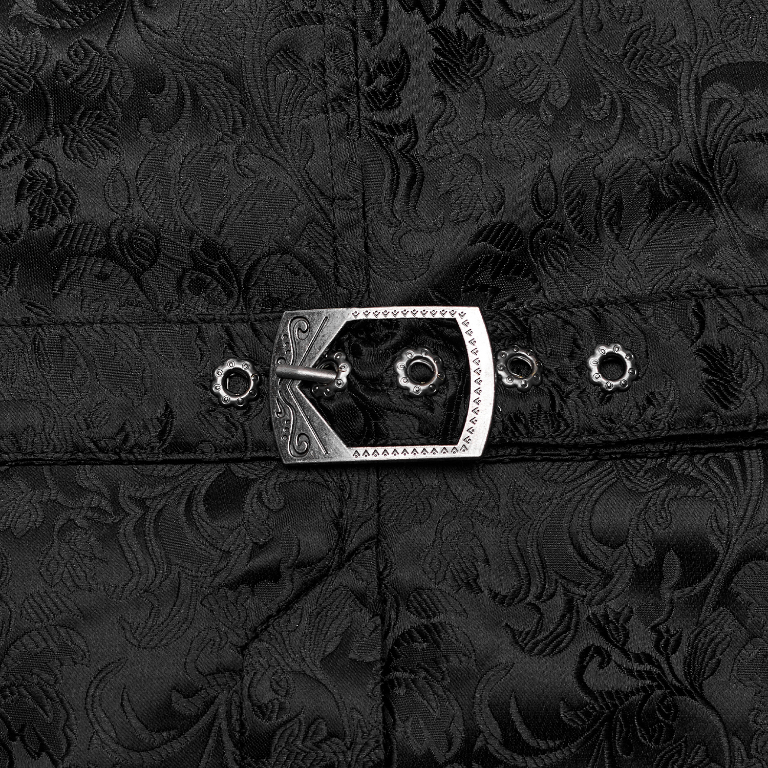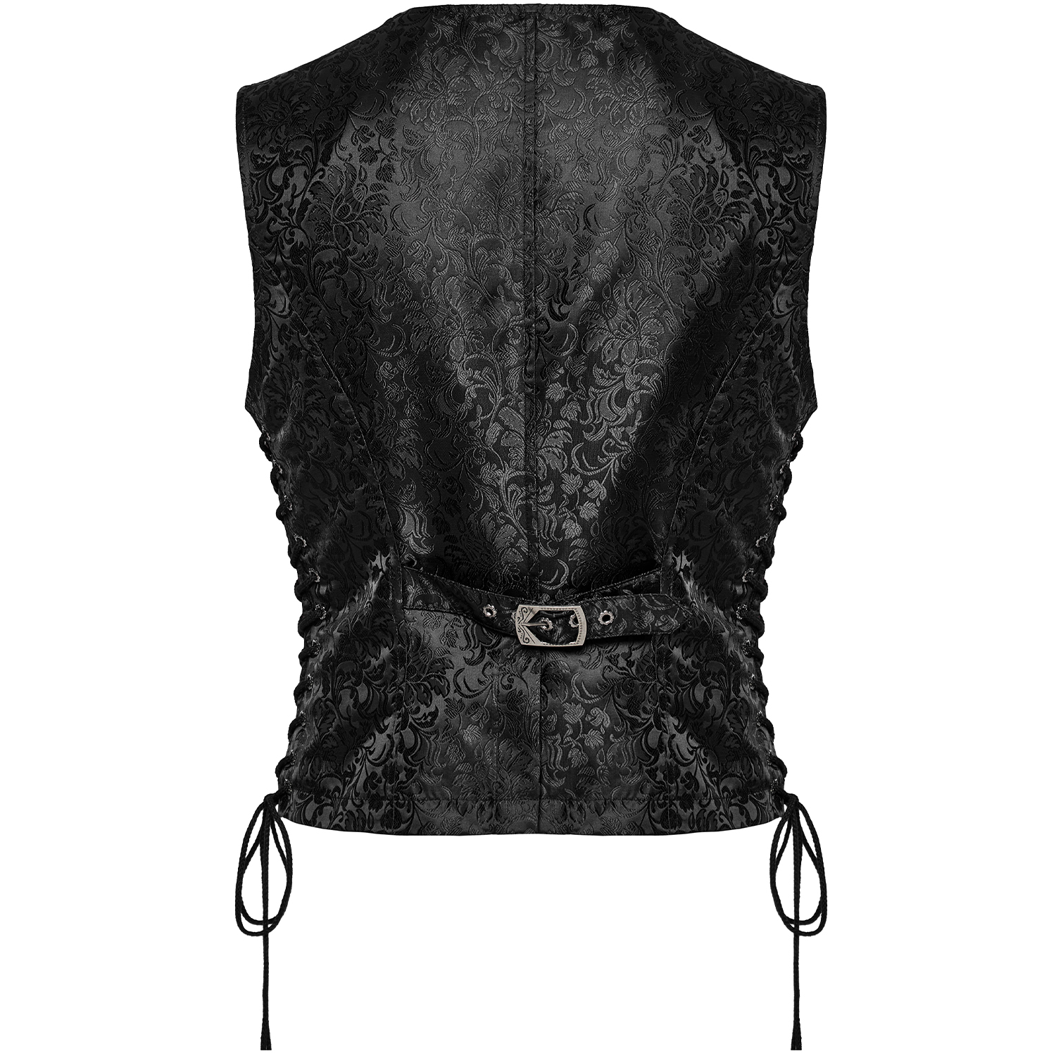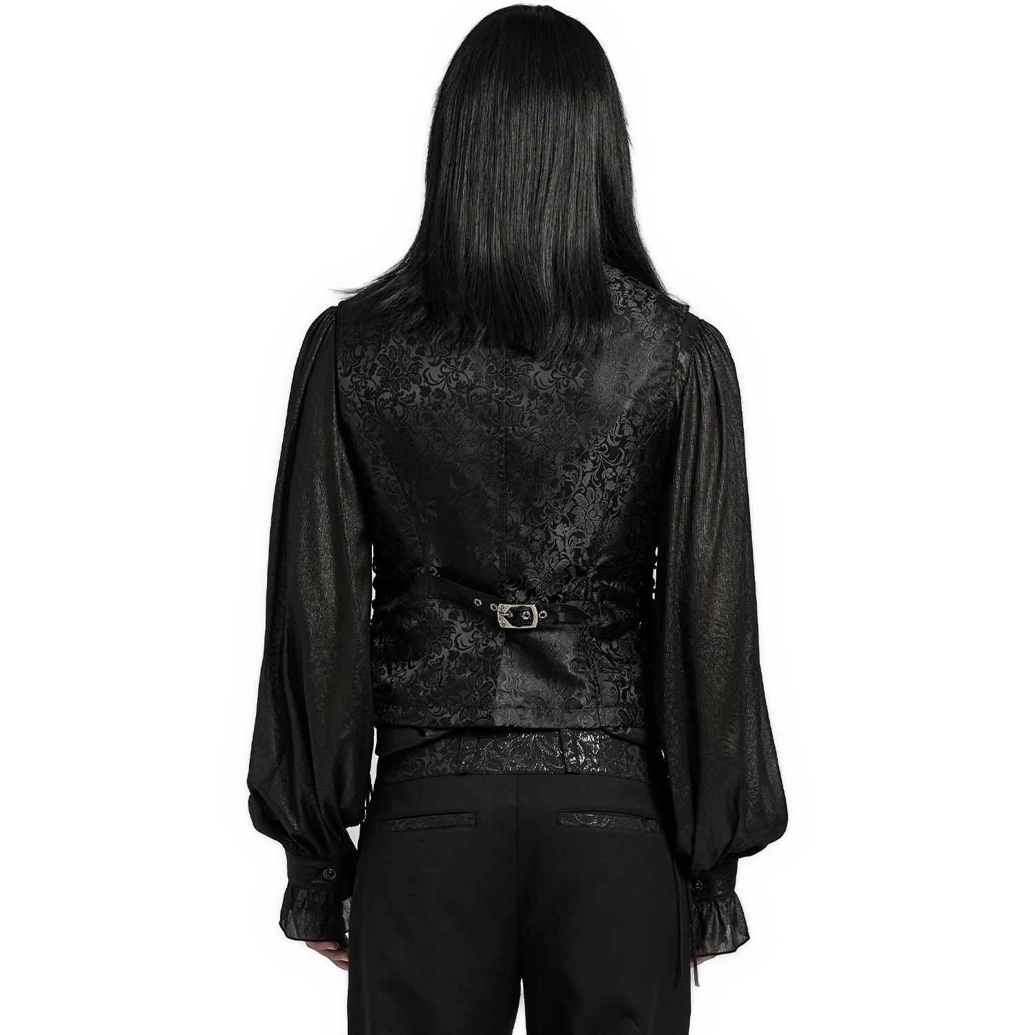Gilet damassé noir-gris pour hommes de style gothique victorien, orné de sangles en ruban de satin sur la fermeture frontale et de boutons noirs estampés. • Sangle au dos avec boucle argentée...