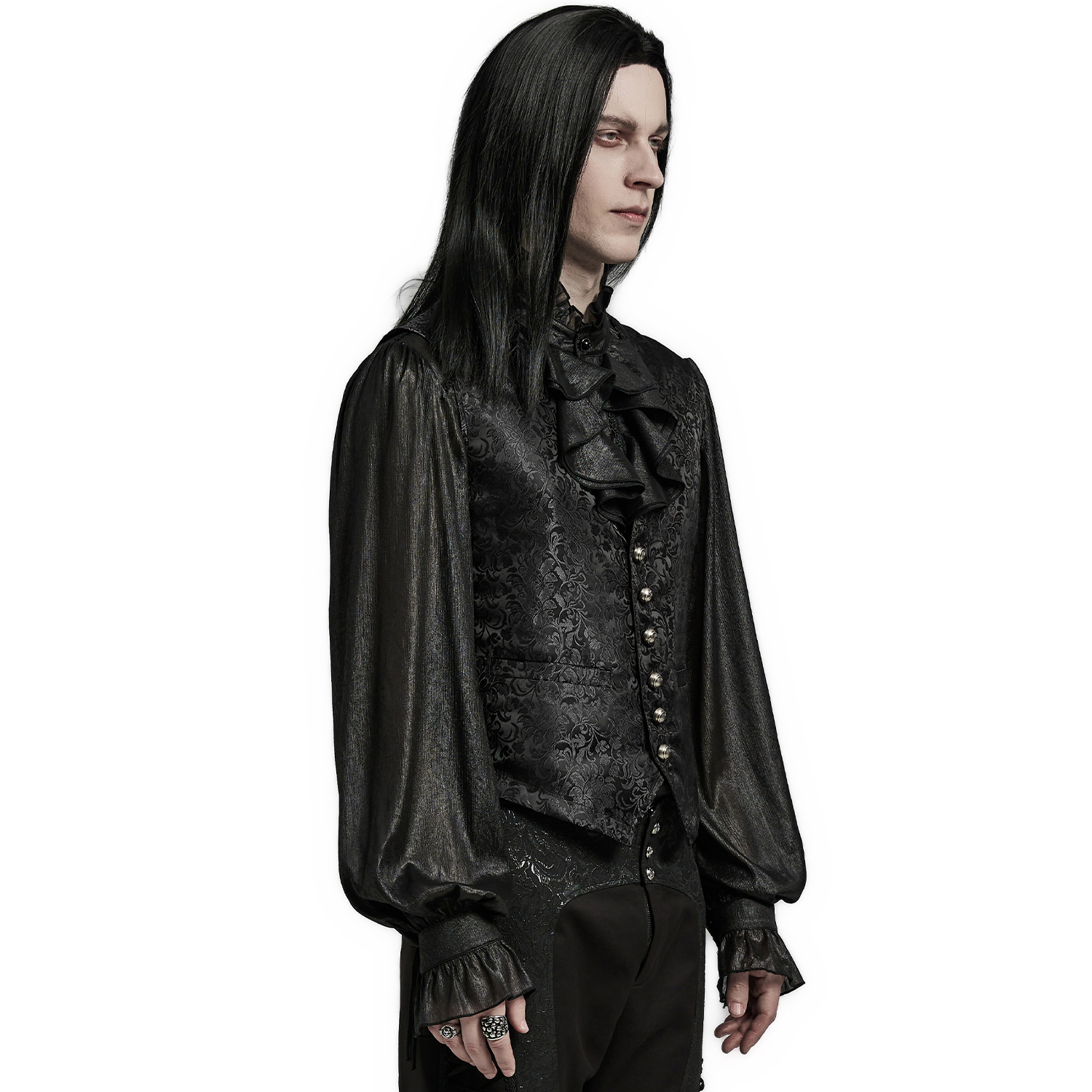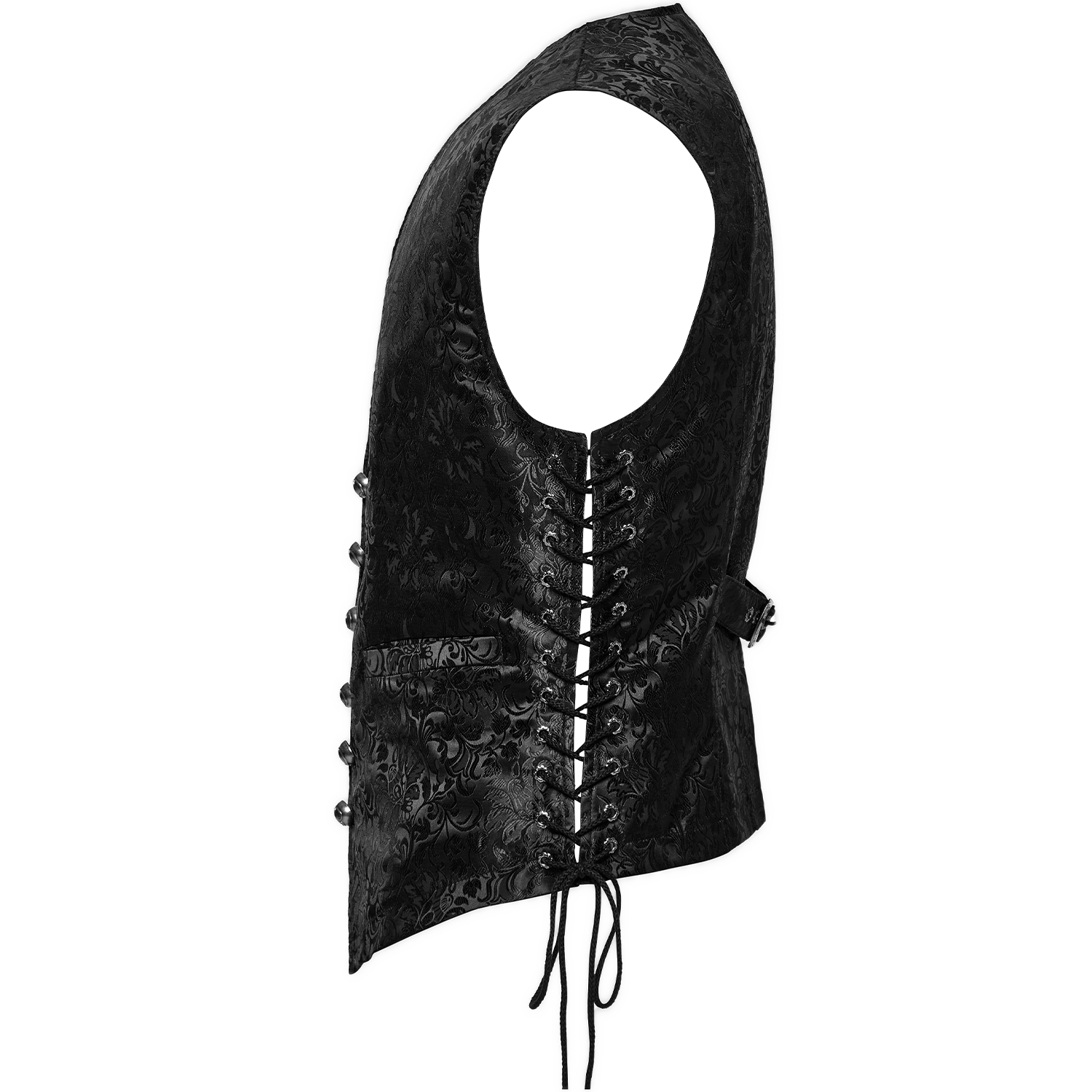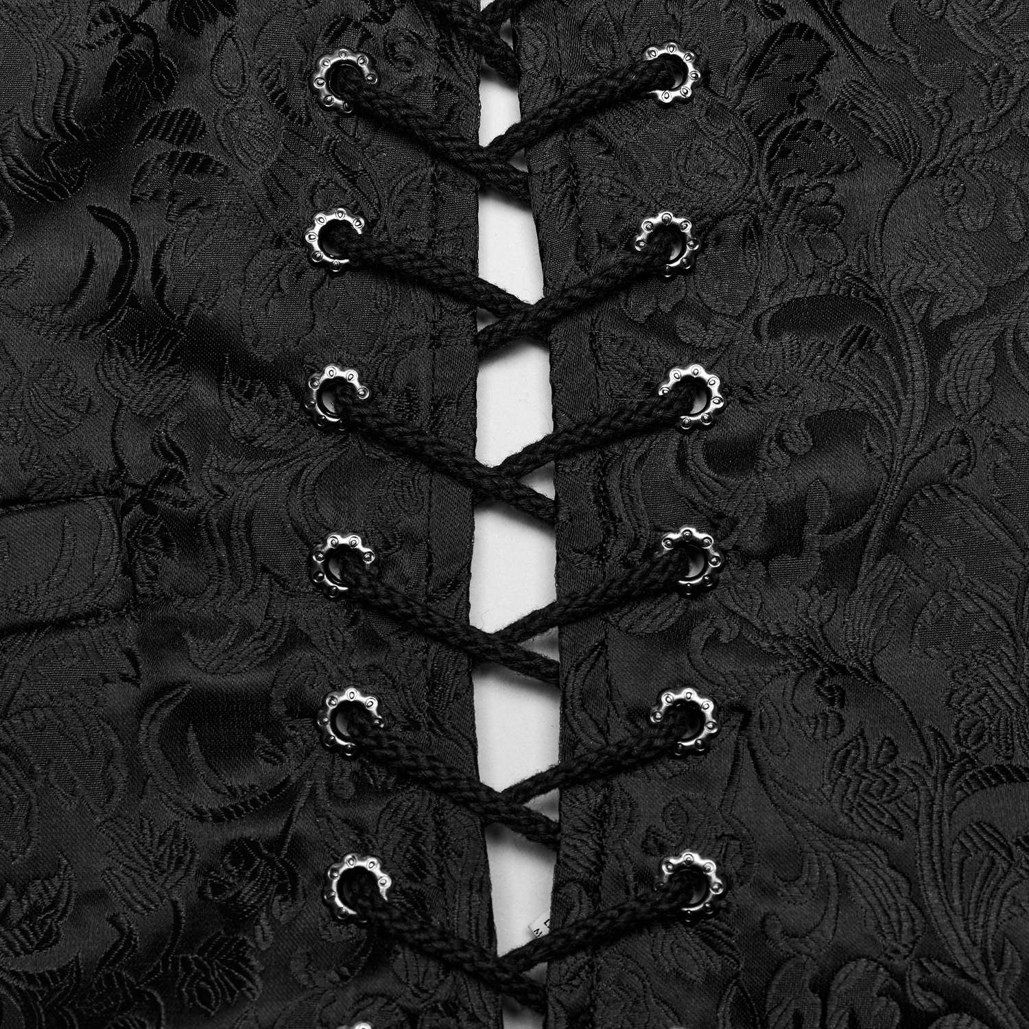 Gilet gothique victorien en jacquard noir • Motif a un effet 3D • Coupe croisée sur le devant • Huit boutons cousus à la main • Chaînette décorative sur une bande de dentelle • Deux poches plaquées...