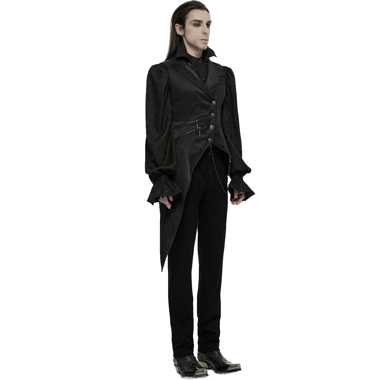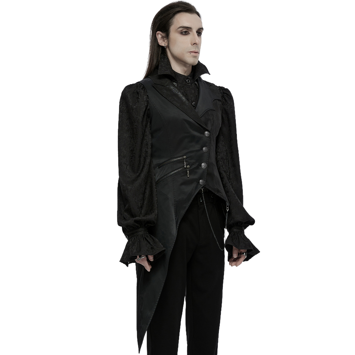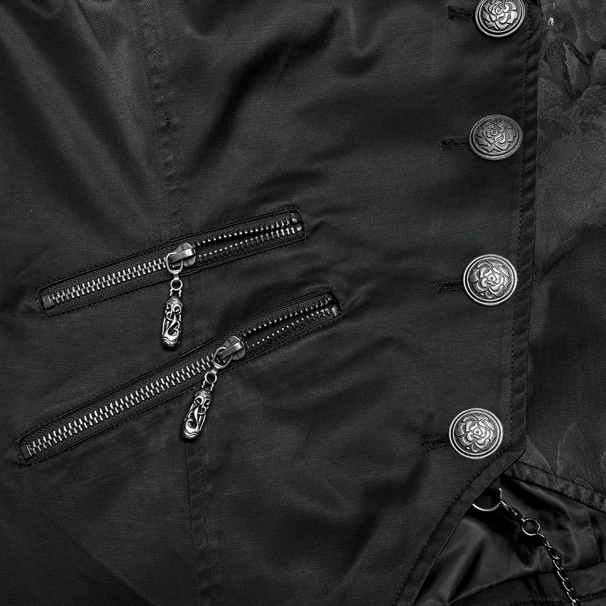 Gilet gothique victorien en jacquard noir • Motif a un effet 3D • Coupe croisée sur le devant • Huit boutons cousus à la main • Chaînette décorative sur une bande de dentelle • Deux poches plaquées...