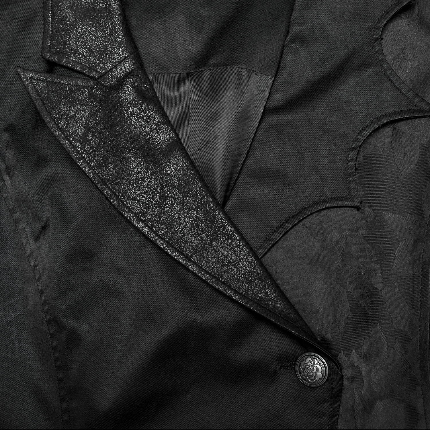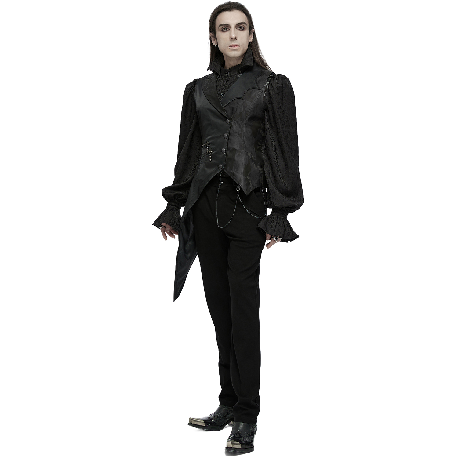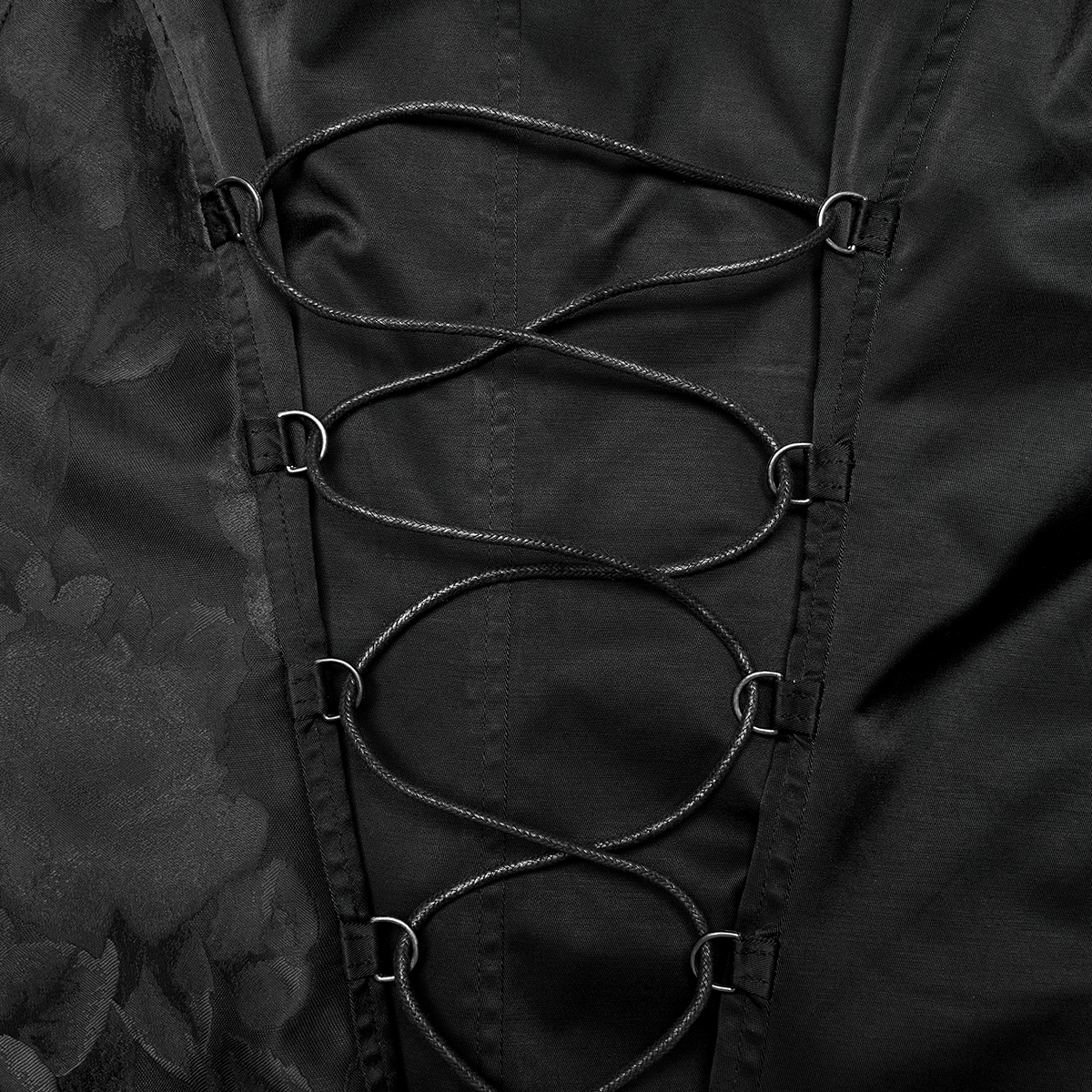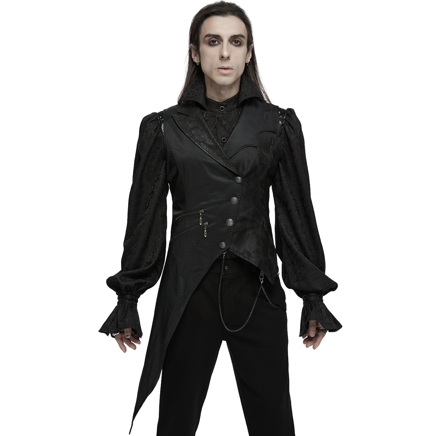 Gilet gothique victorien en jacquard noir • Motif a un effet 3D • Coupe croisée sur le devant • Huit boutons cousus à la main • Chaînette décorative sur une bande de dentelle • Deux poches plaquées...