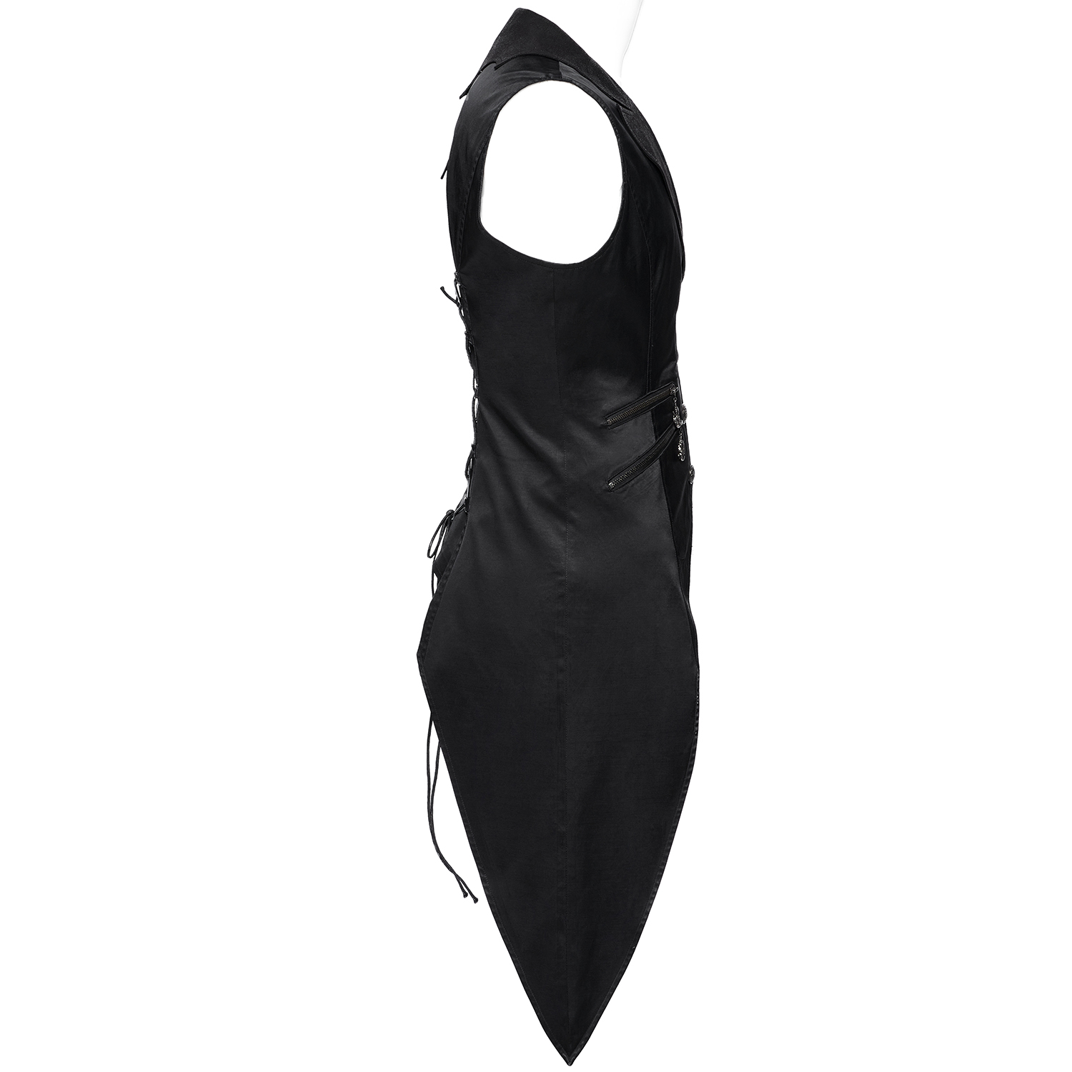 Gilet pour homme gothique noir avec détails en cuir synthétique et fermeture à crochet à l'avant. • Panneaux en cuir végétal synthétique sur les épaules et les poches • Fermeture par crochets...