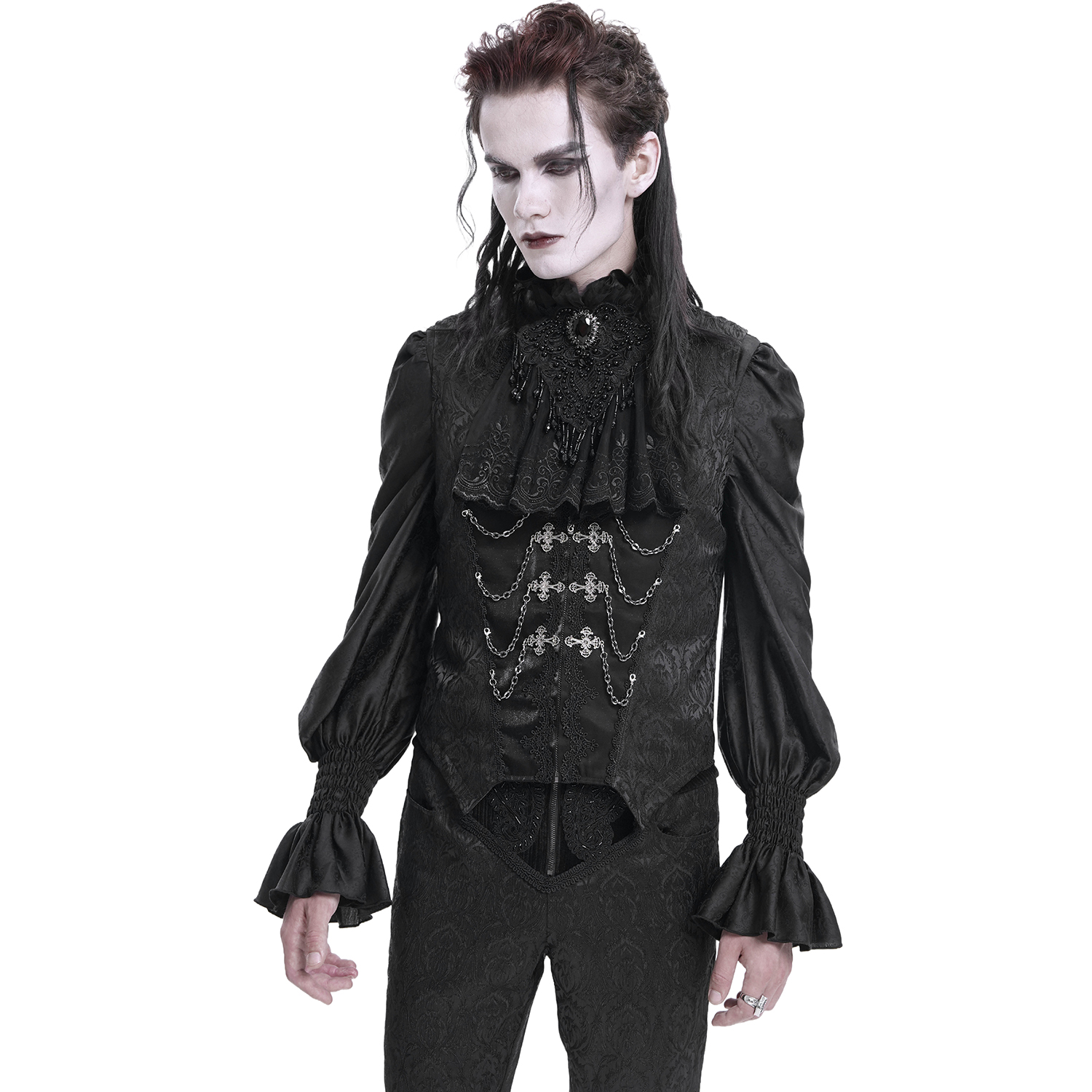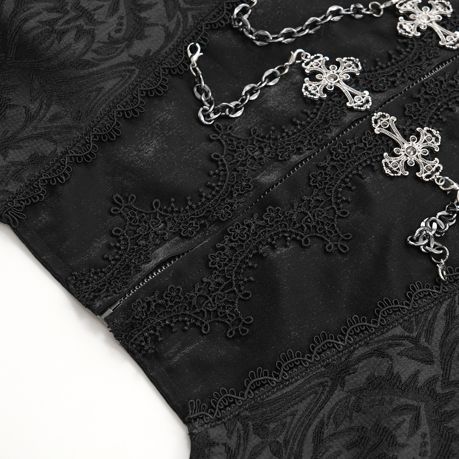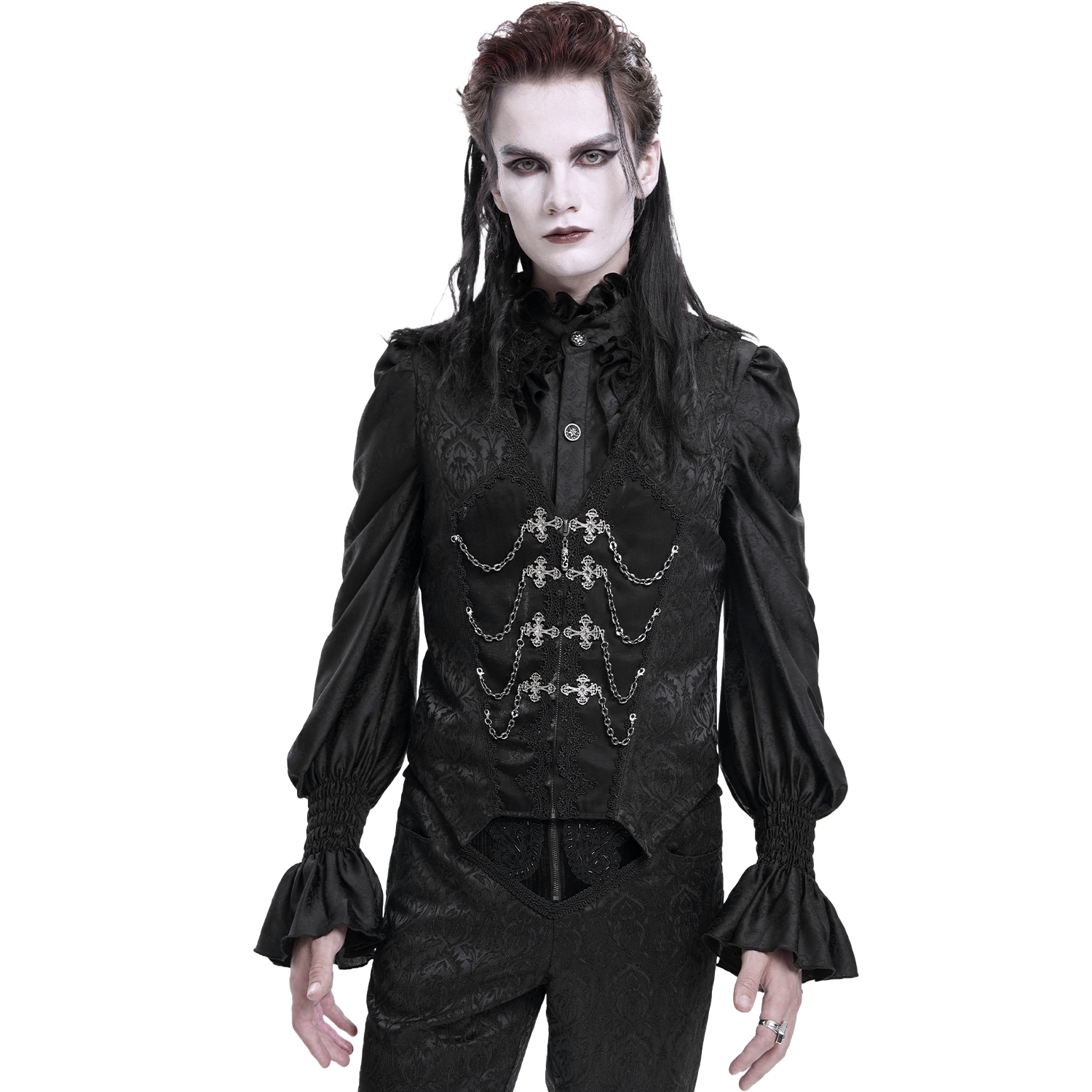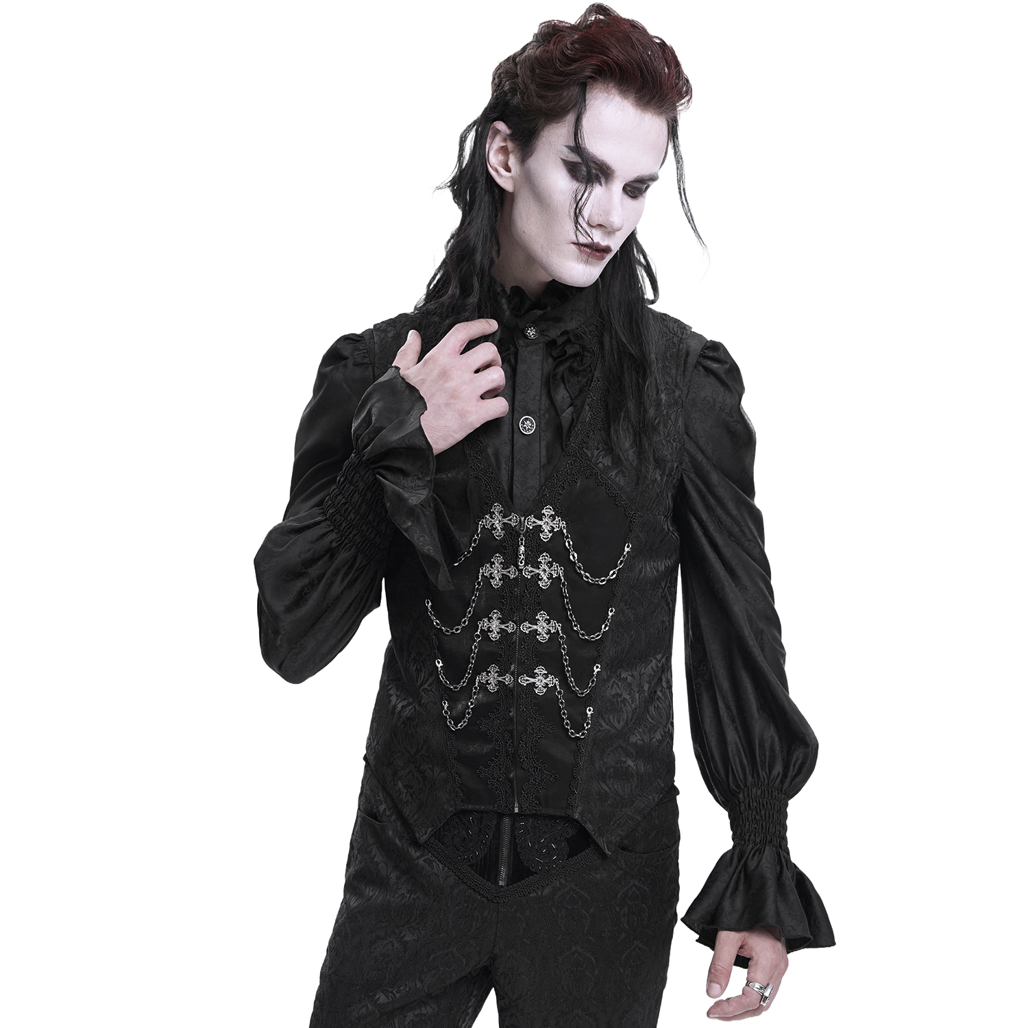 • En jacquard noir • Col haut à volants • Volants et dentelle délicate sur la poitrine • Chaînettes amovibles avec croix, perles et pierres noires • Boutons métalliques gravés • Manches...