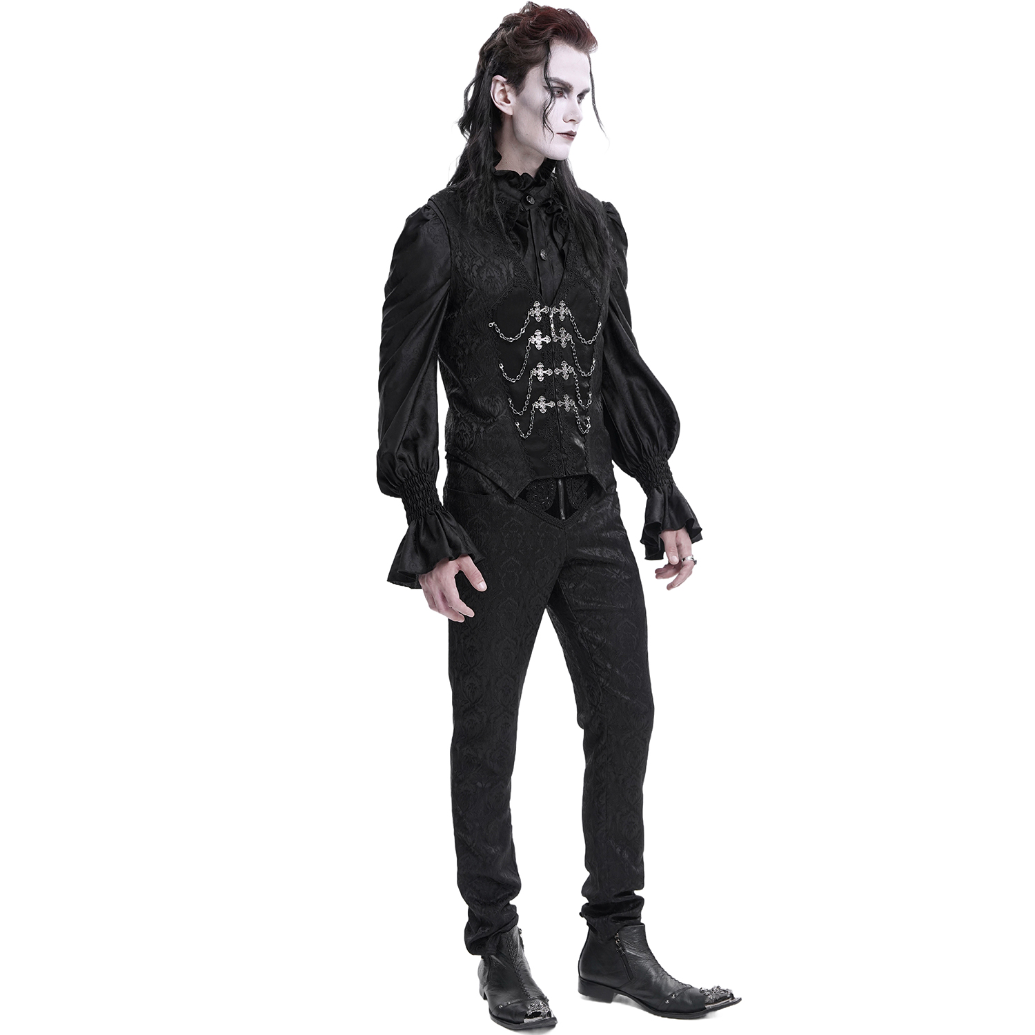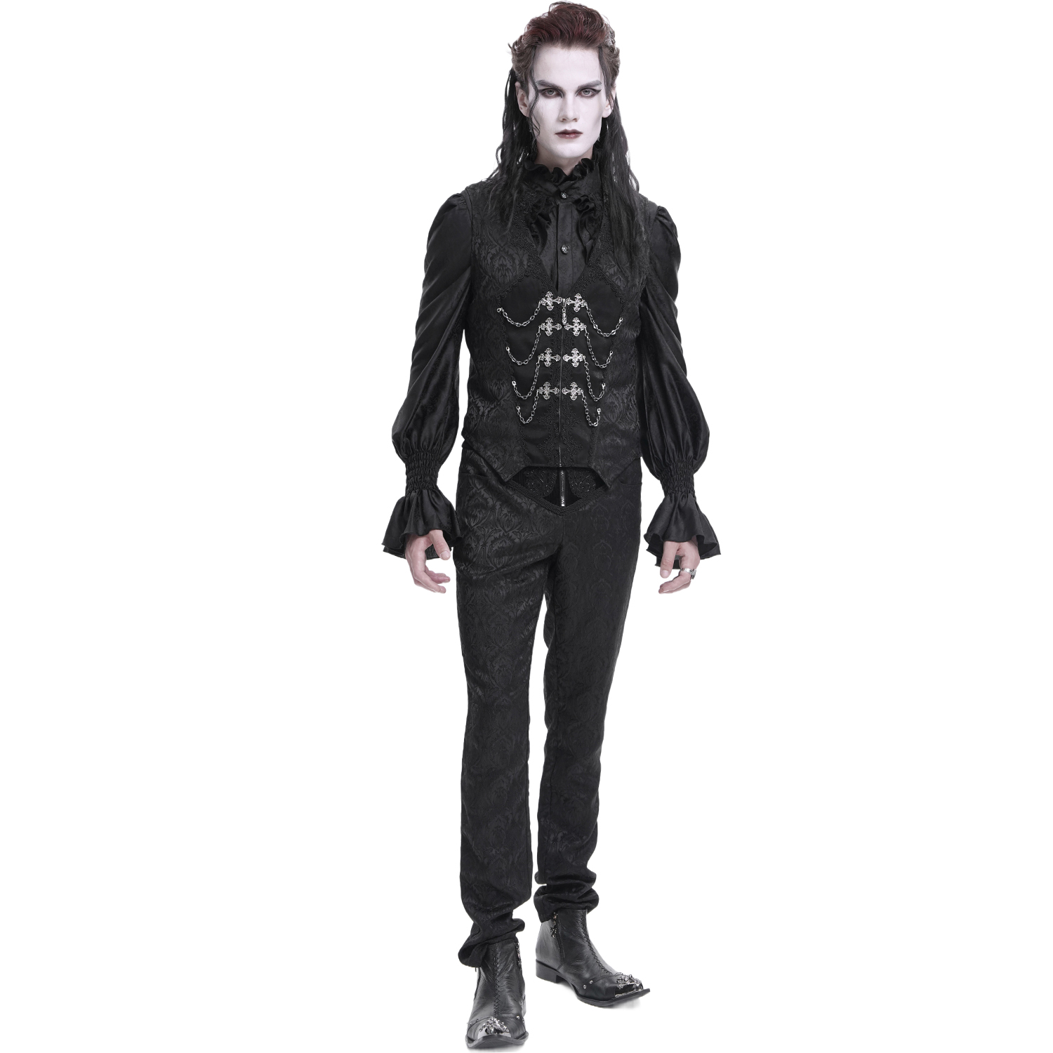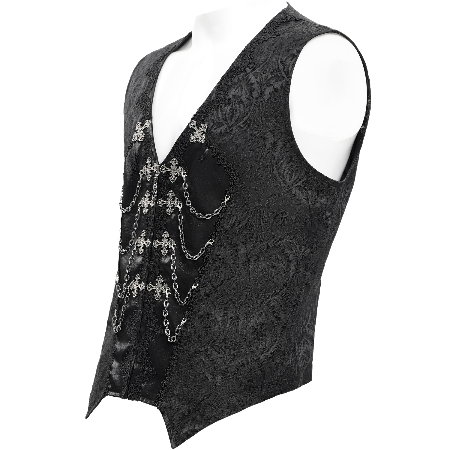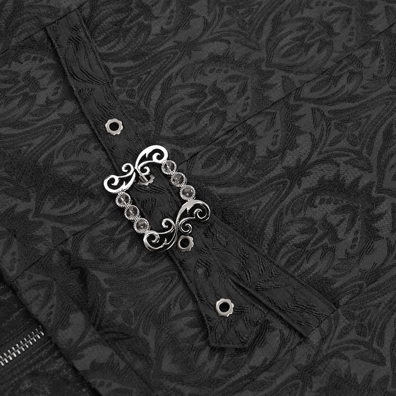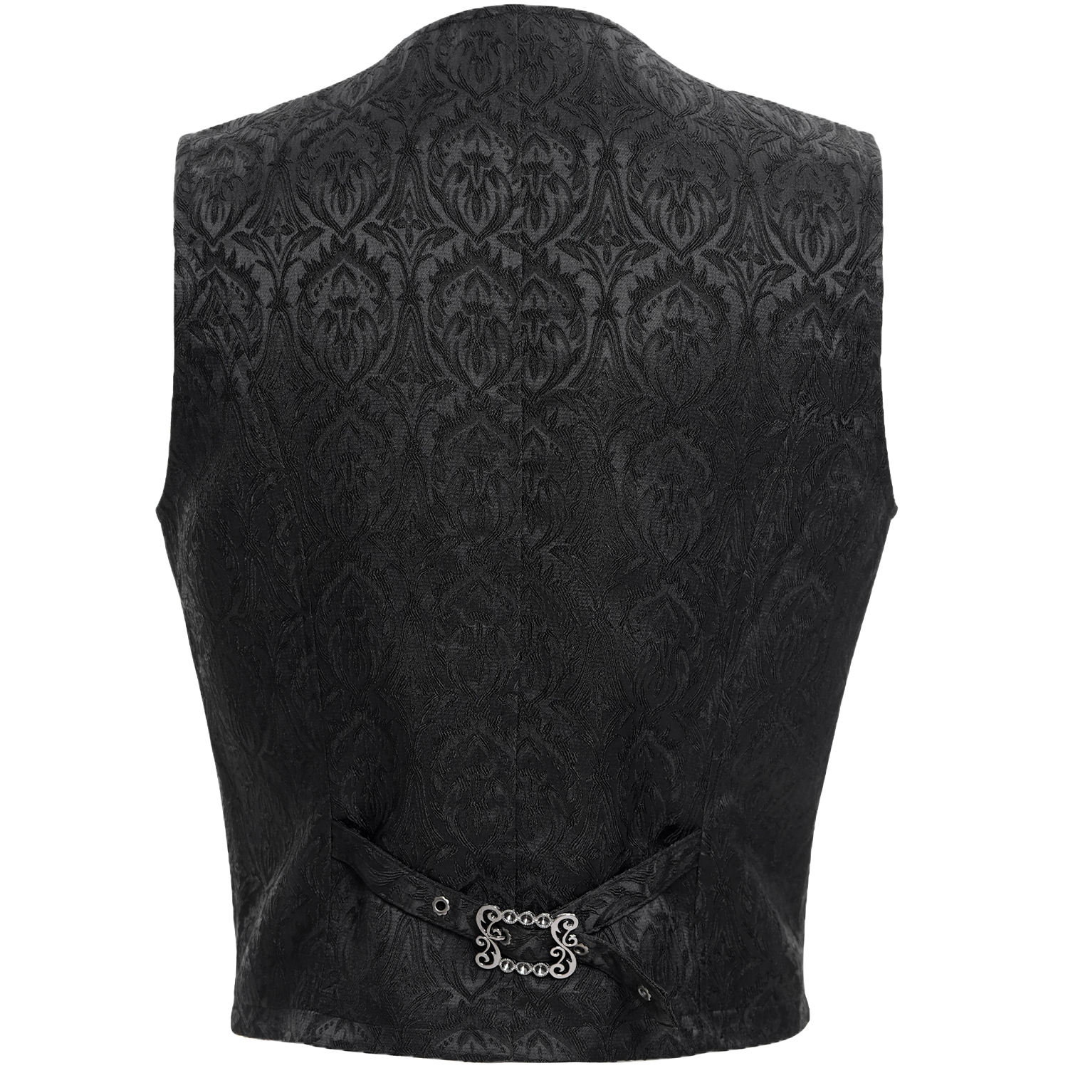Gilet noir classique de style gothique pour hommes, à fermeture croisée • Trois boutons en oblique recouverts de tissu • Tissu à motif floral et fines rayures • Deux poches • Sangle et boucle...