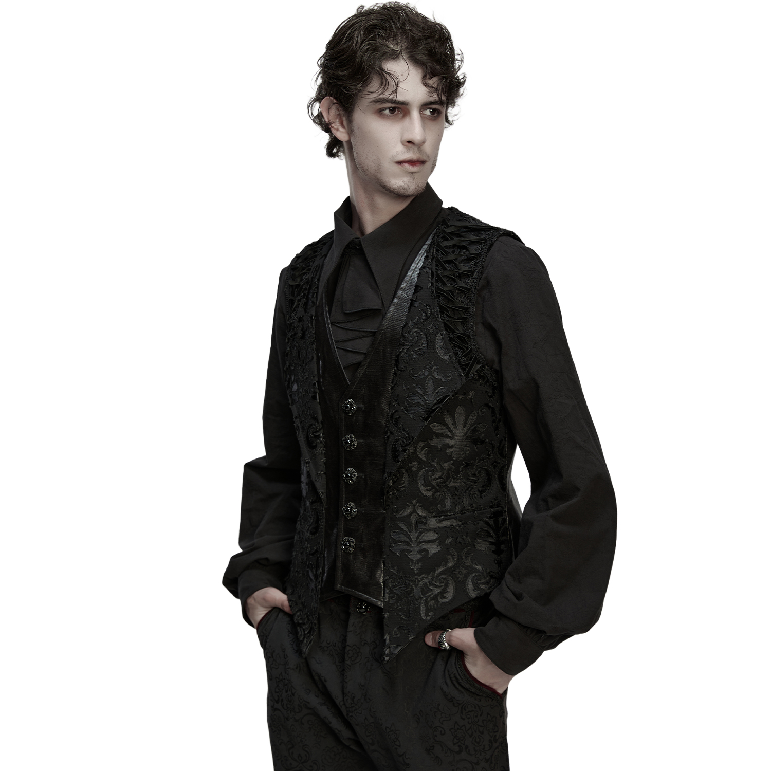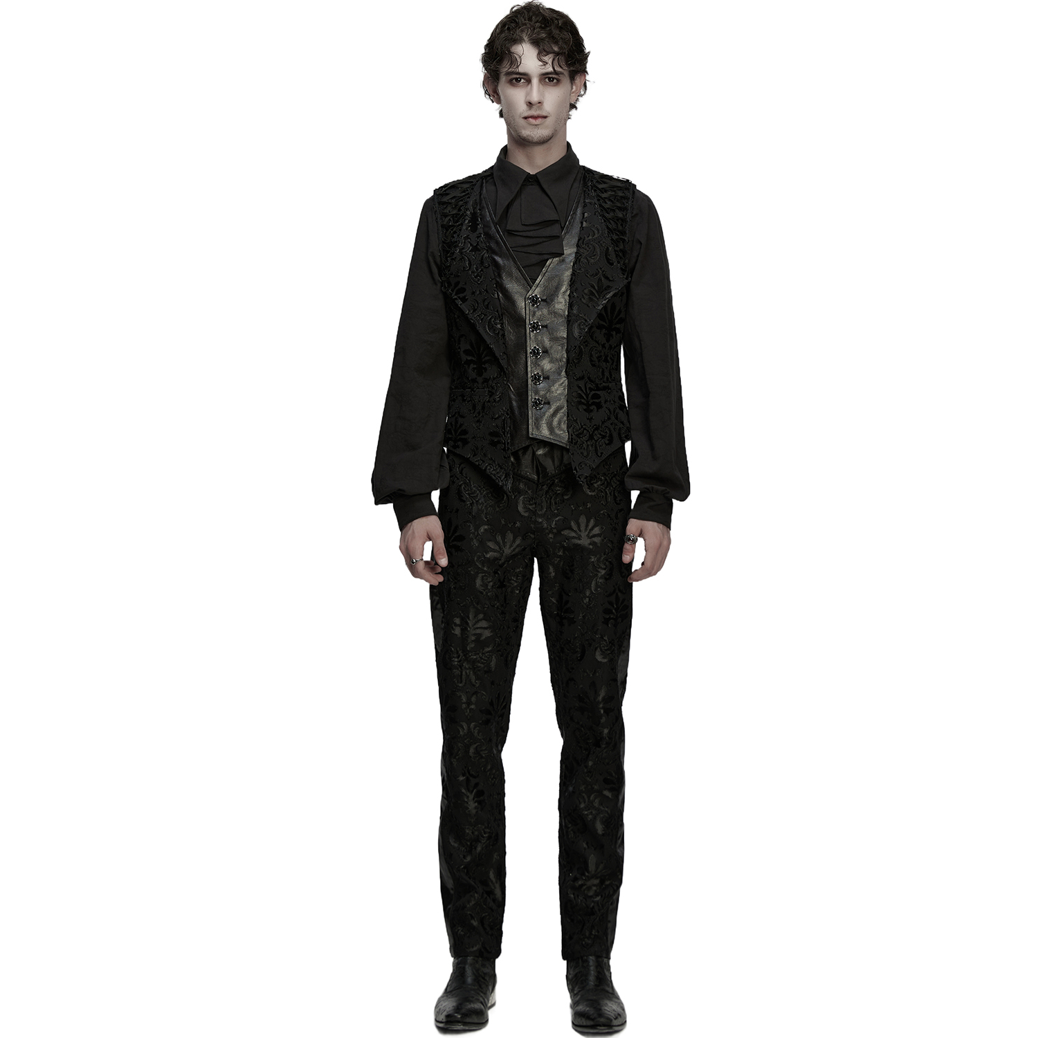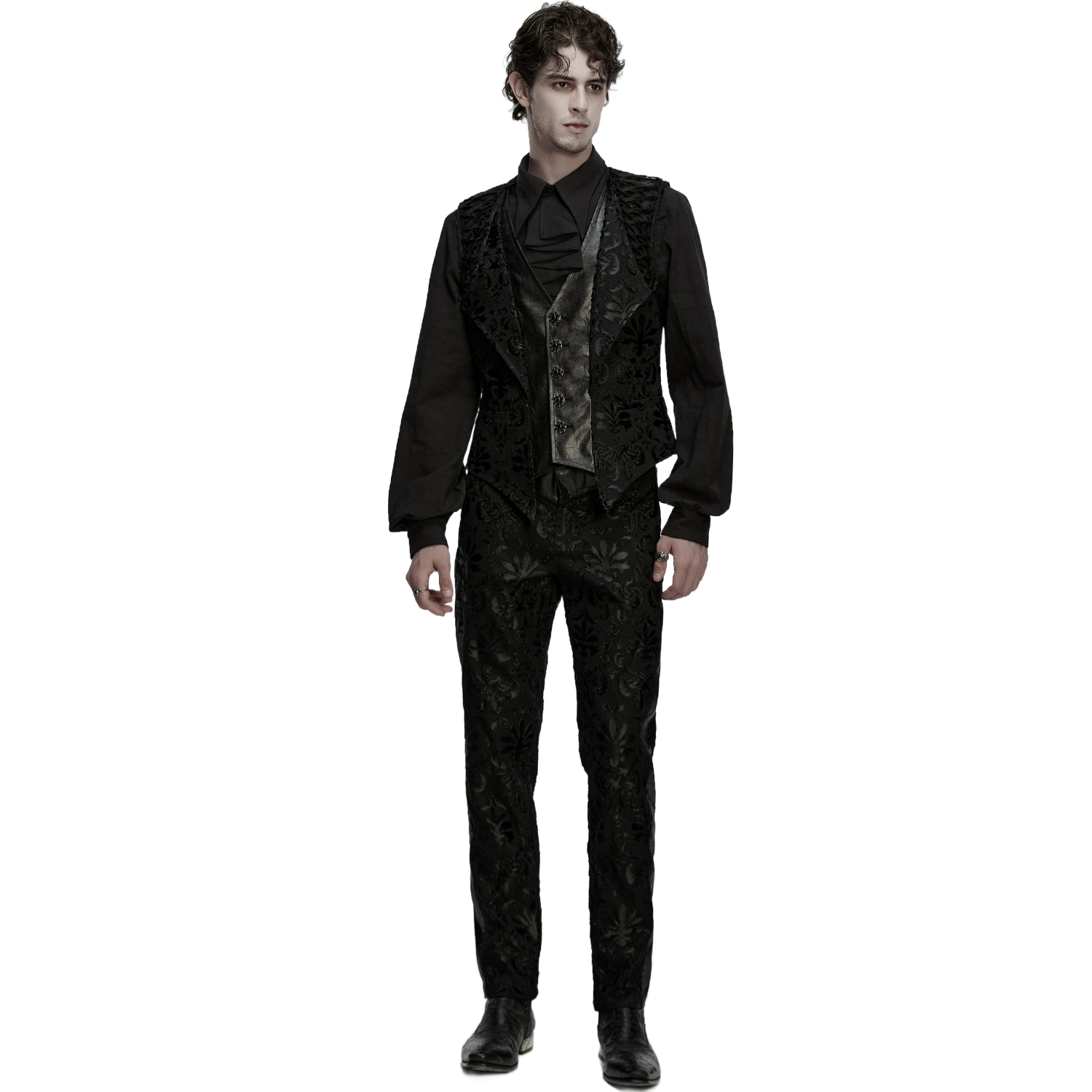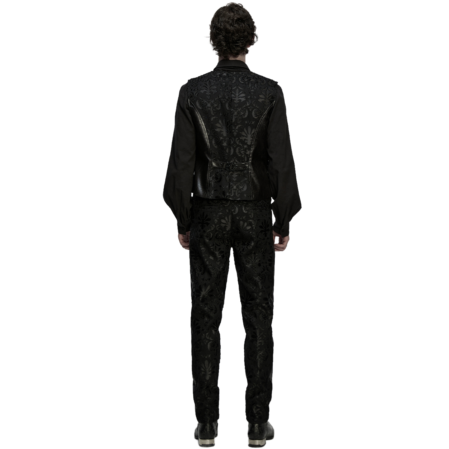 Pantalon style vampire gothique pour hommes. • En jacquard noir imprimé de motifs floraux • Quatre poches, deux devant et deux derrière • Fermeture à glissière métallique • Ceinture en...