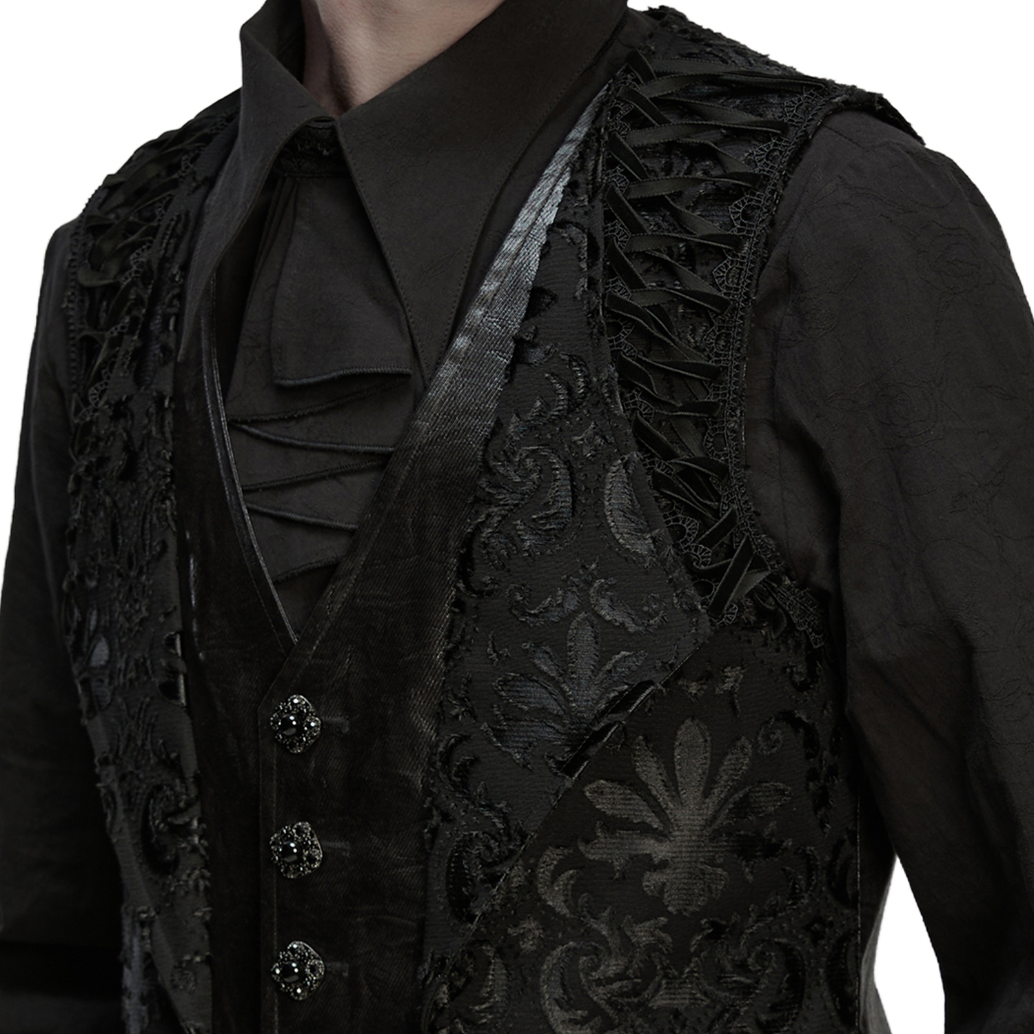 Gilet damassé noir-gris pour hommes de style gothique victorien, orné de sangles en ruban de satin sur la fermeture frontale et de boutons noirs estampés. • Sangle au dos avec boucle argentée...