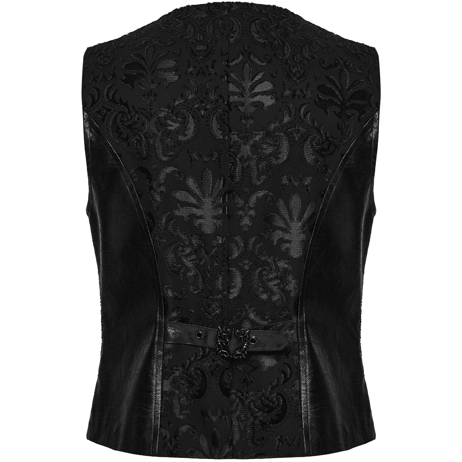 Gilet pour homme gothique noir avec détails en cuir synthétique et fermeture à crochet à l'avant. • Panneaux en cuir végétal synthétique sur les épaules et les poches • Fermeture par crochets...