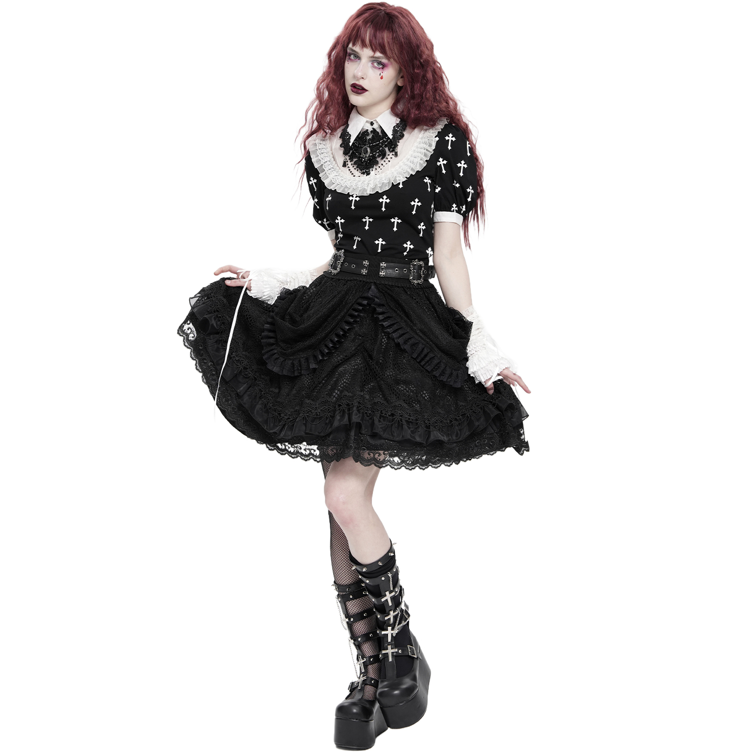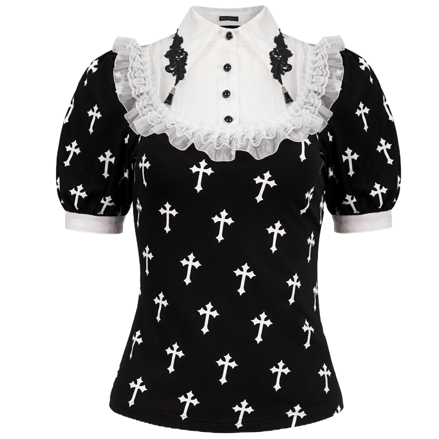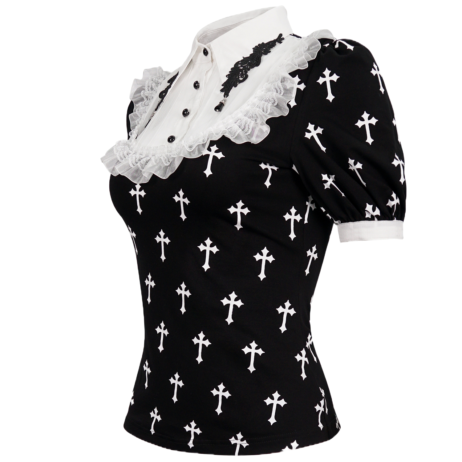 • Encolure haute avec bordure en dentelle et pierres noires