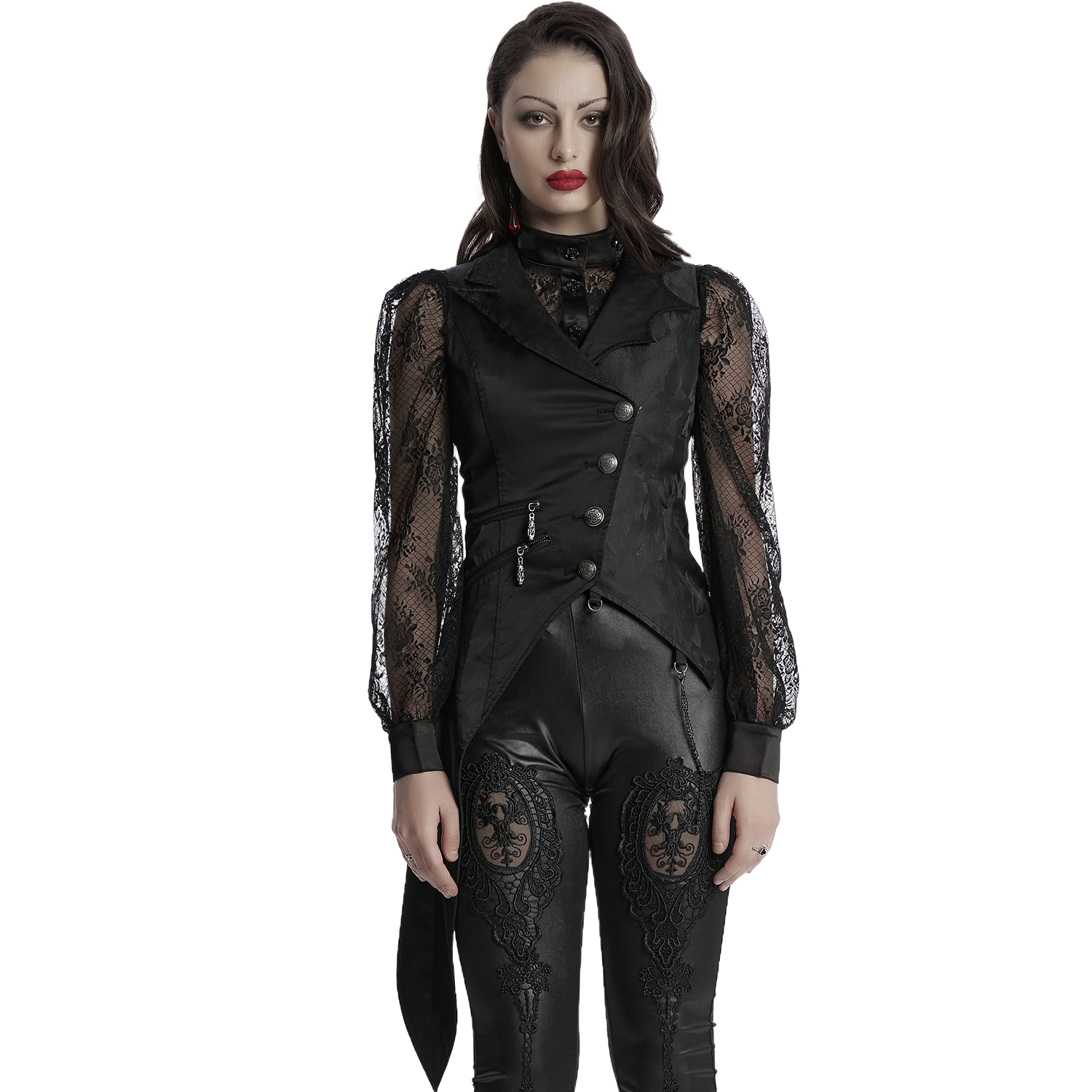 • Haut ajusté en dentelle noire transparente • Coupe asymétrique • Froncé en diagonale avec laçage sur le devant pour l'ajuster selon vos envies • Col montant et manches en dentelle à volants •...