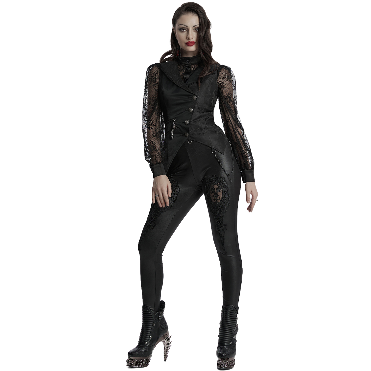 Superbe haut gothique sans manches • Fermeture à glissière apparente sur le devant • Tirette de la glissière en forme de cercueil • Double boucles sur chaque épaule • Logo métallique de la...