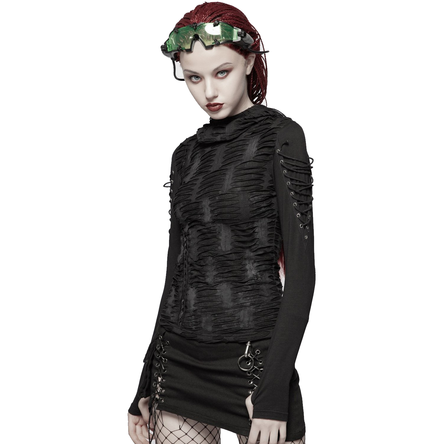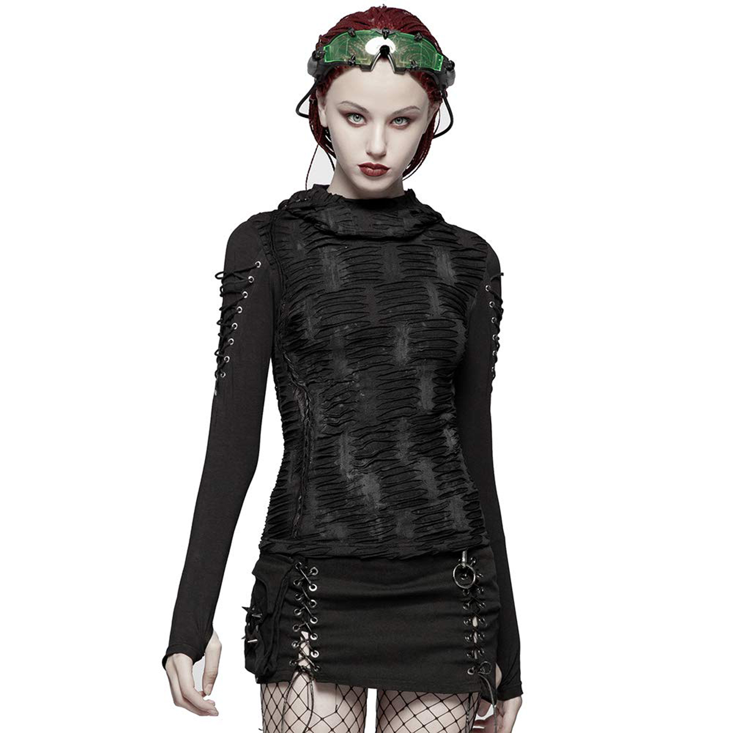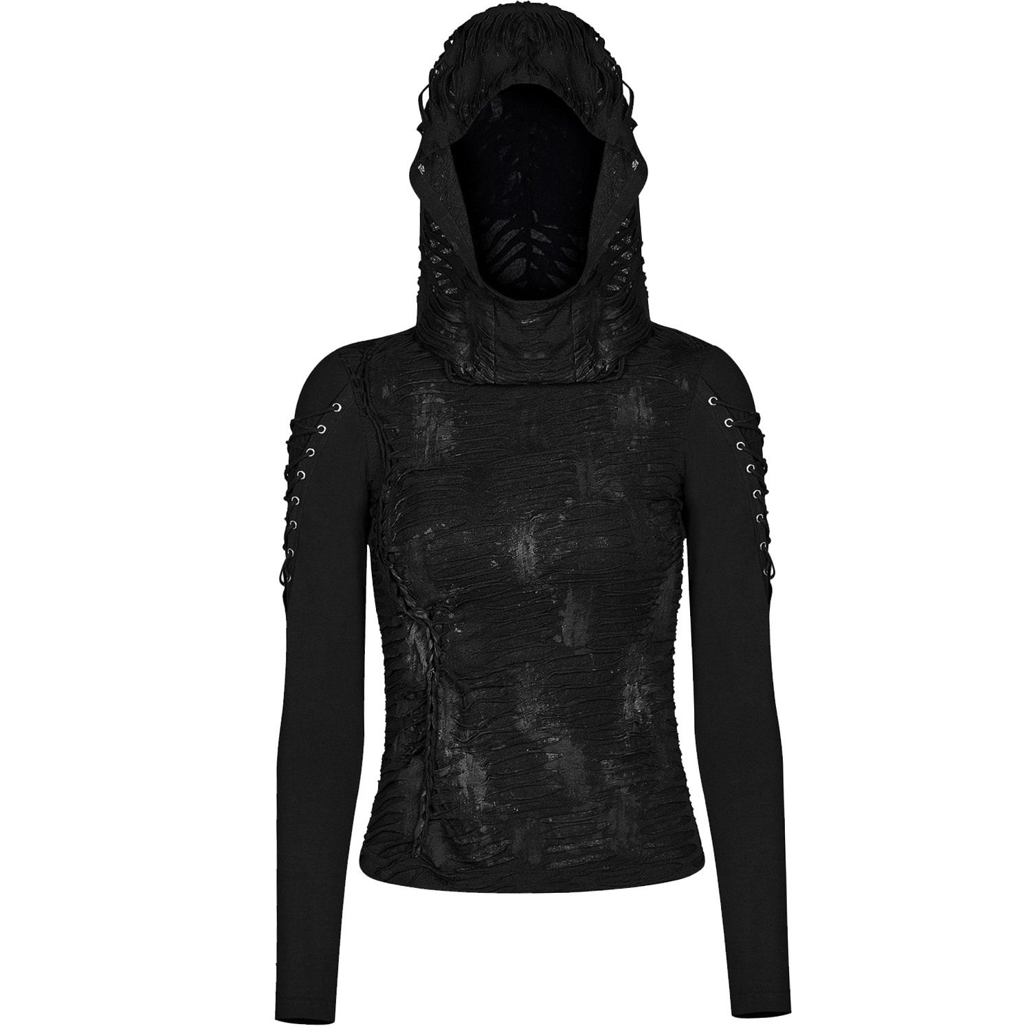 Haut à manches longues de style gothique post-apocalyptique et industriel avec capuche et épaules lacées.
