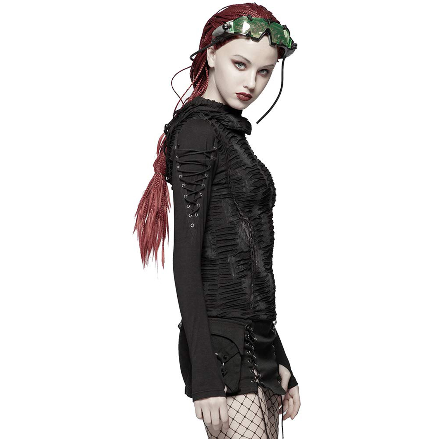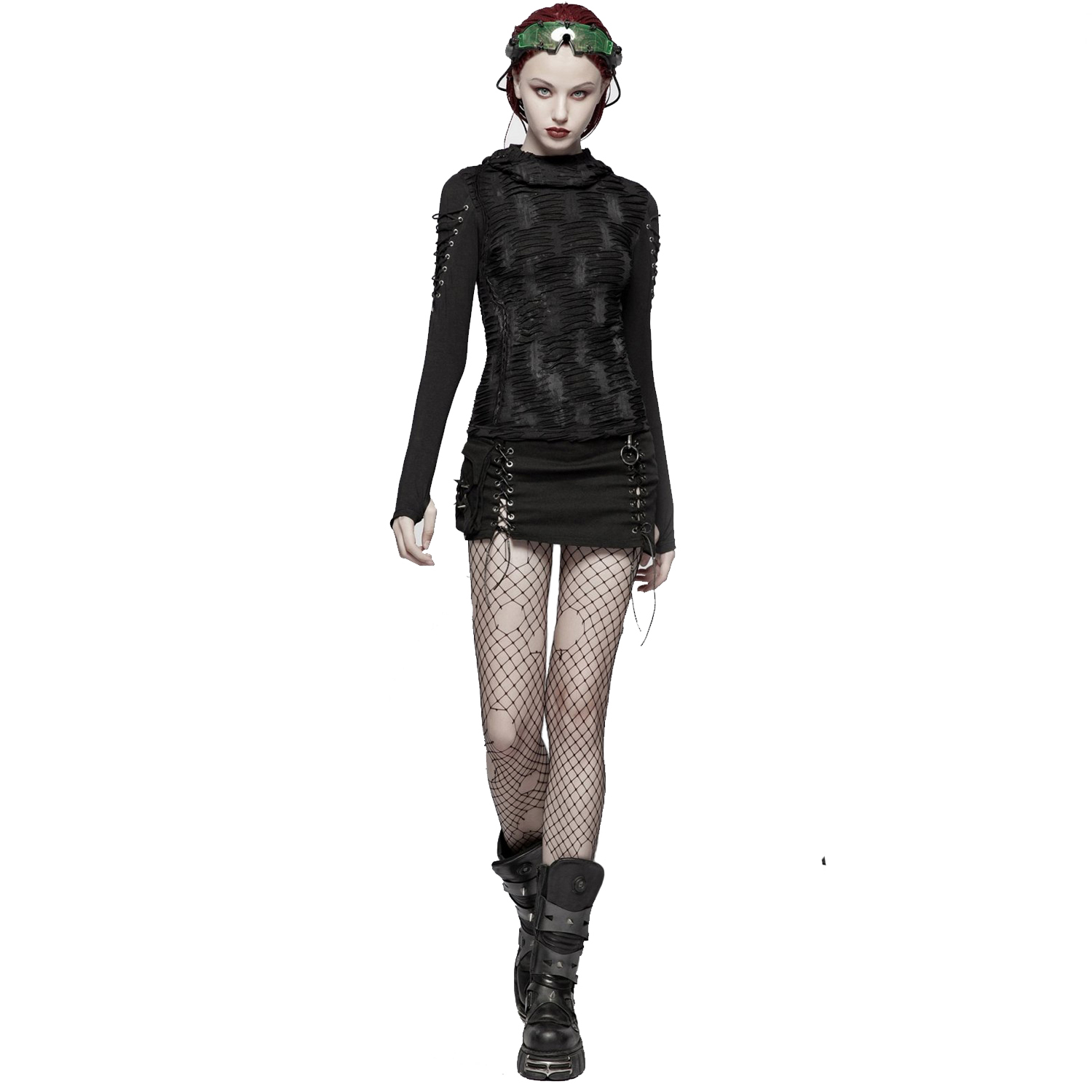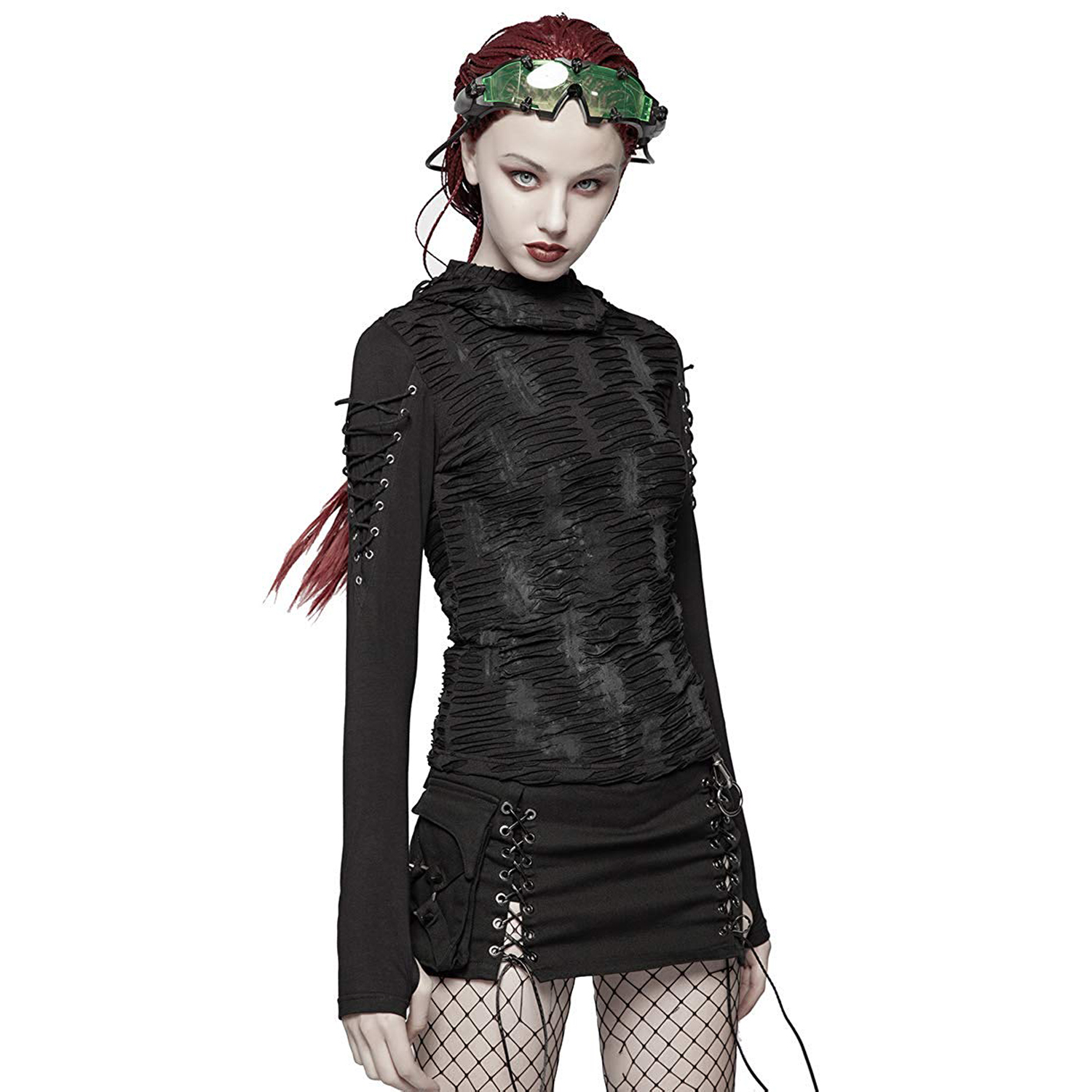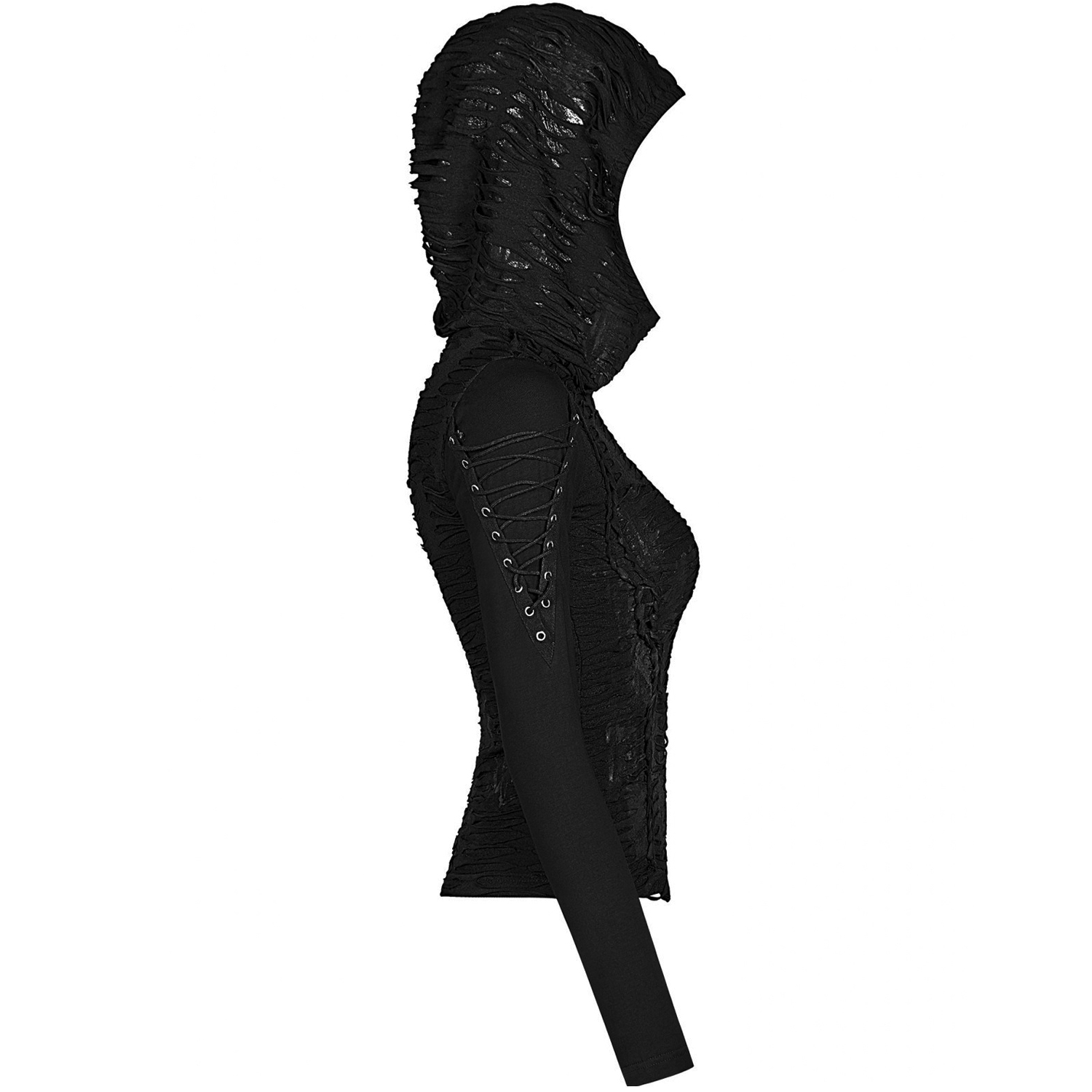 Haut à manches longues de style gothique post-apocalyptique et industriel avec capuche et épaules lacées.