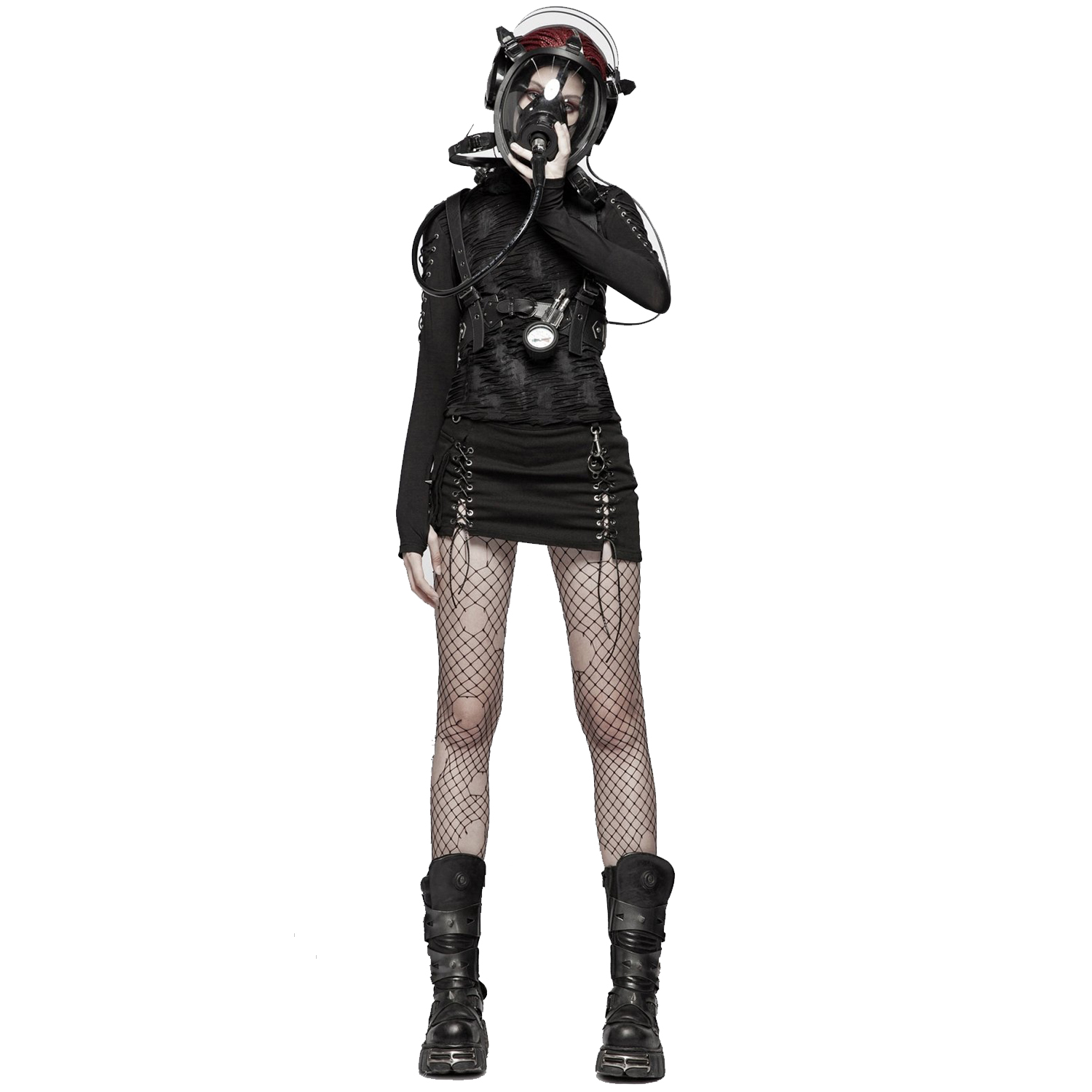 Top manches longues décolleté • Conception asymétrique avec une épaule dénudée • Col irrégulier • Cordes sur l'épaule gauche et dans le dos, avec ornements en métal • Pendentifs en forme de skulls...
