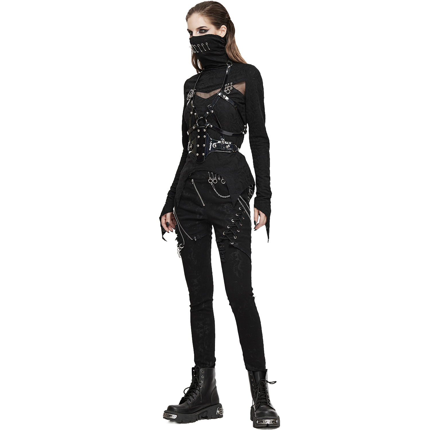• En tissu élastique avec effet usé et déchiré • Partie supérieure ornée de lanières et d'œillets en similicuir • Épingles à nourrice et chaînette amovibles • Fermeture à glissière avec bouton...