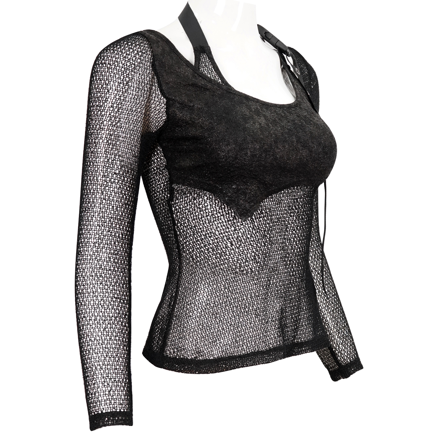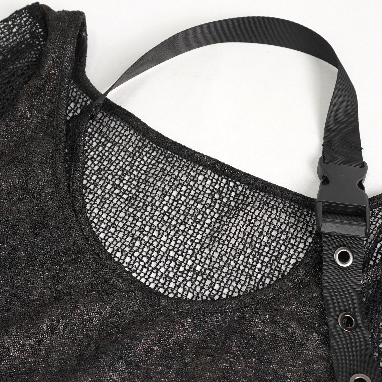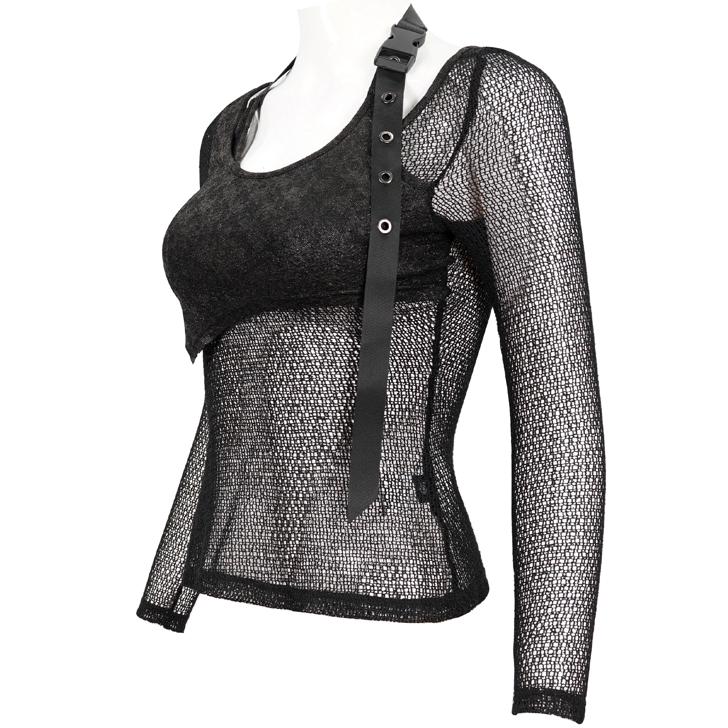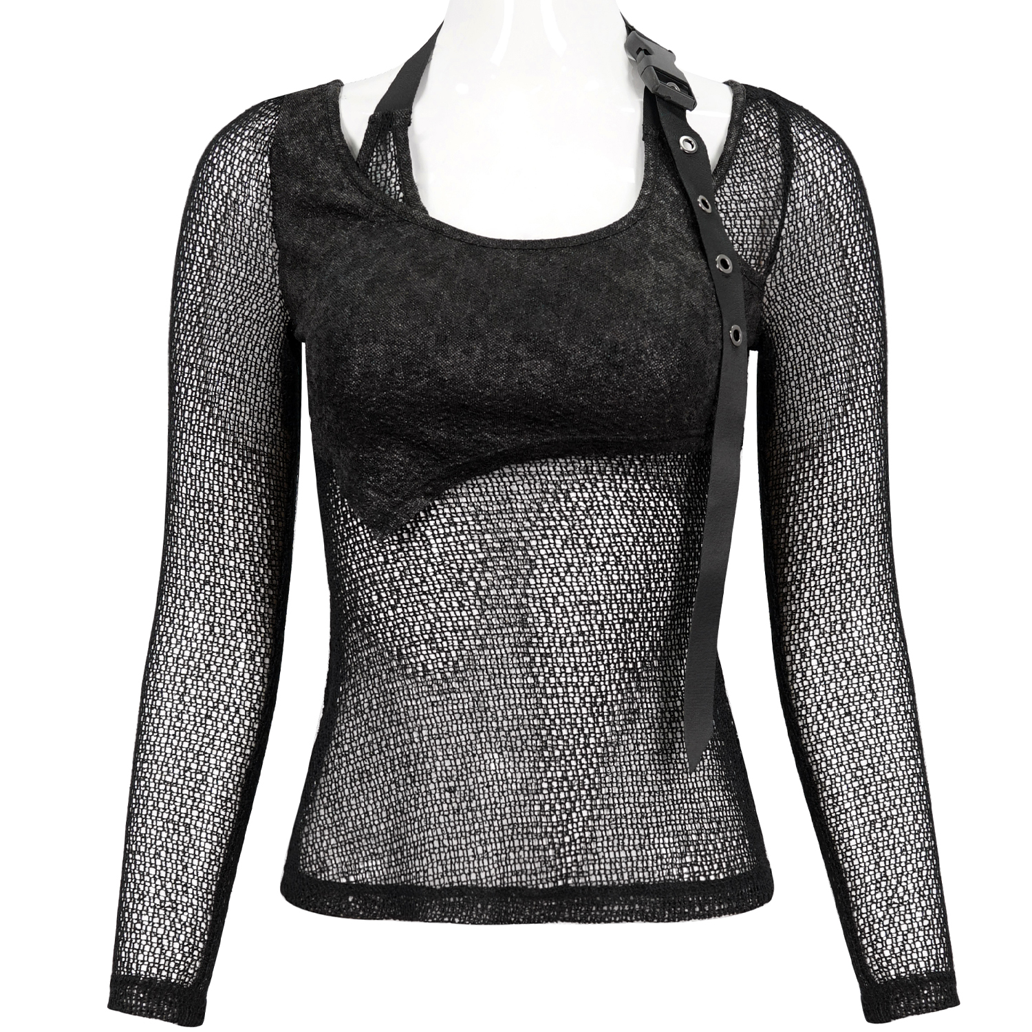 T-shirt punk sexy en résille élastique noire • En maille losange et élastique • Décoration de sangles élastiques en maille avec de petits clous argentés • Conception ajustée pour un style hyper...