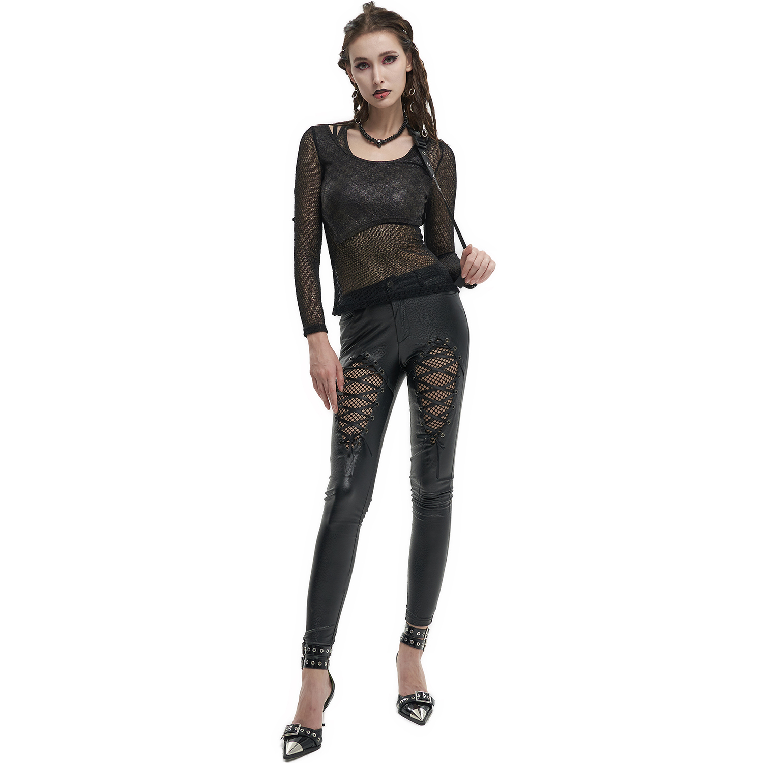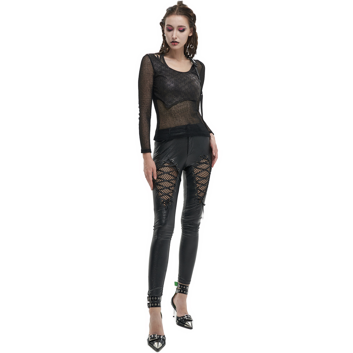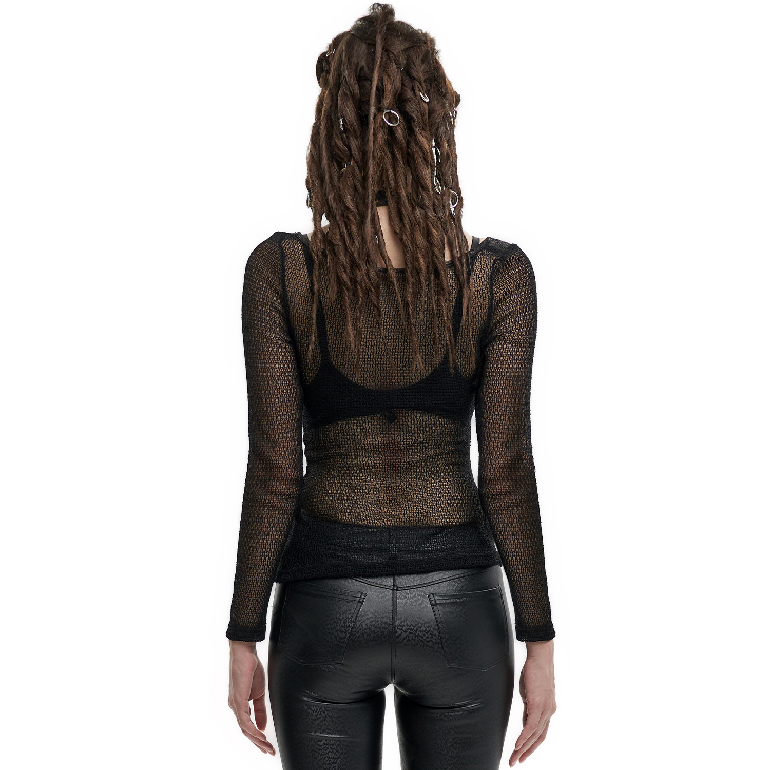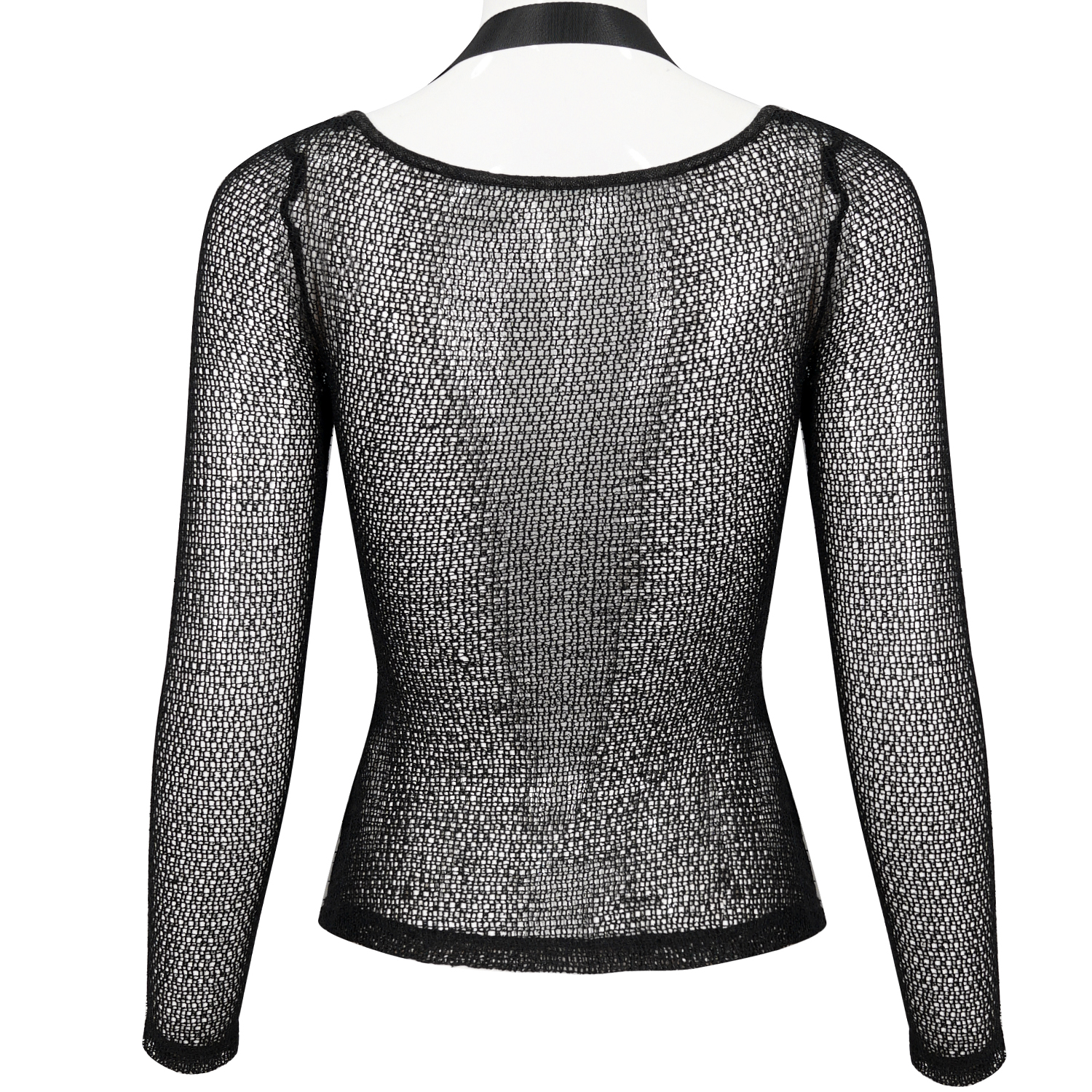 T-shirt punk sexy en résille élastique noire • En maille losange et élastique • Décoration de sangles élastiques en maille avec de petits clous argentés • Conception ajustée pour un style hyper...