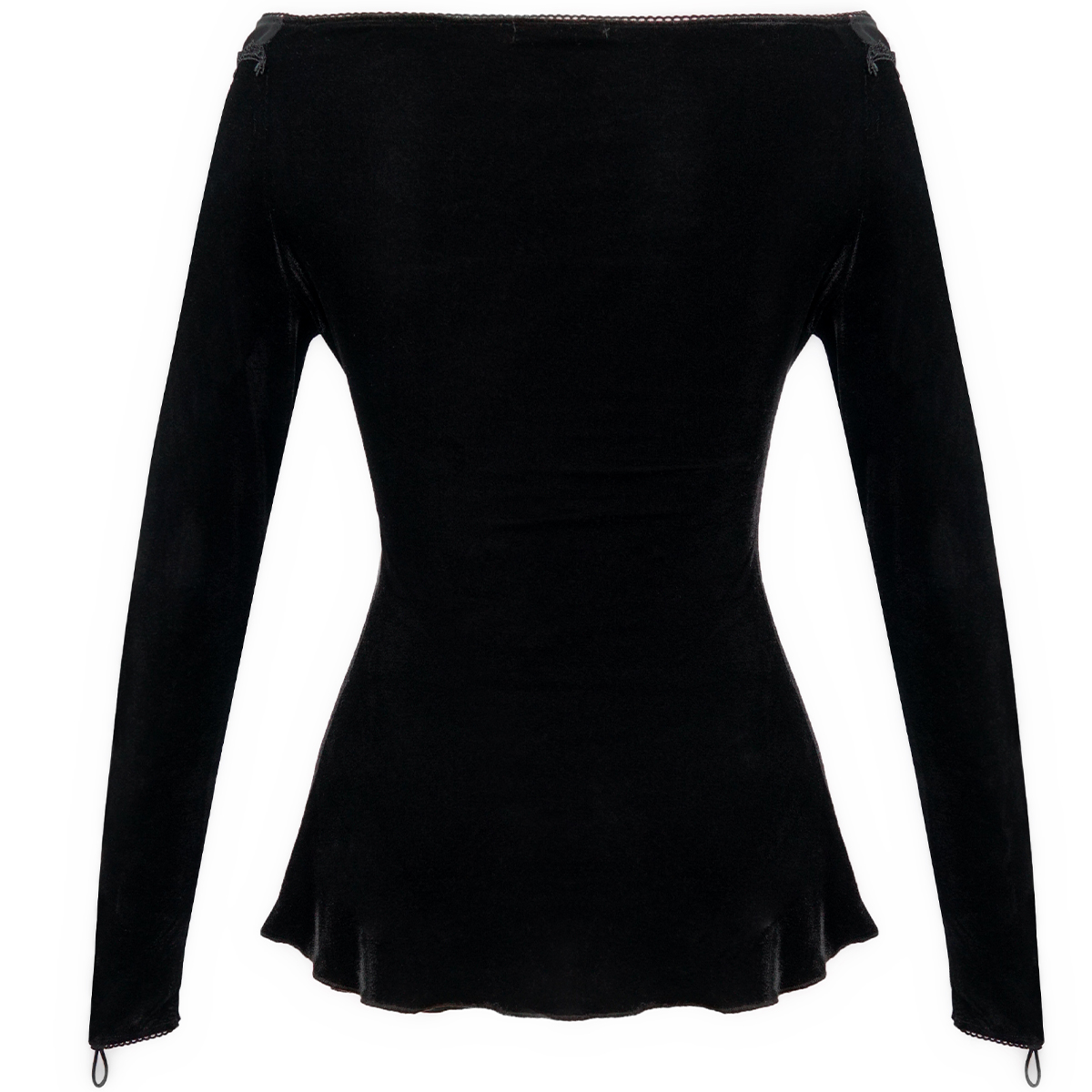 Top noir à manches longues pour femmes, de style gothique, à col haut avec découpes au niveau de la poitrine, asymétrique sur le côté avec broche d'épaule amovible. • Ourlet asymétrique sur le...