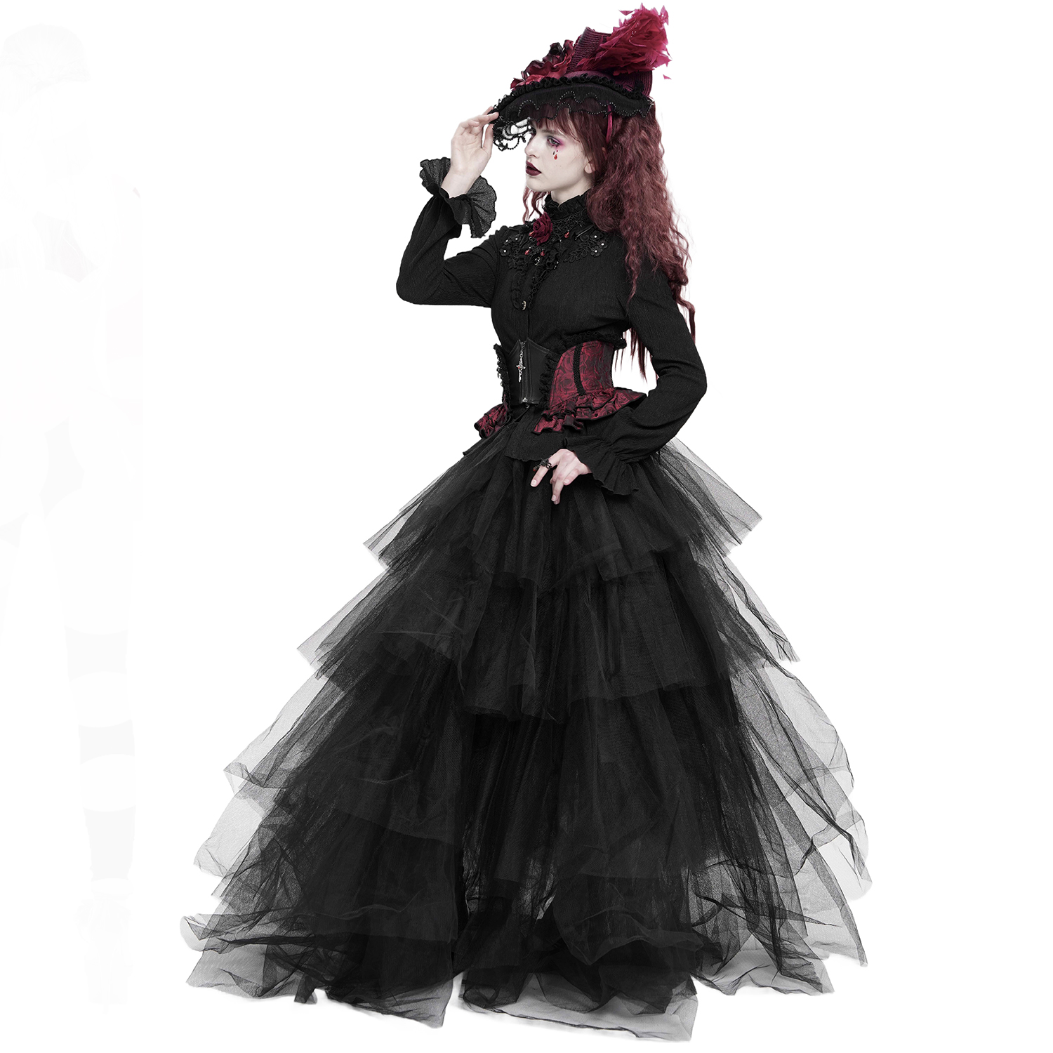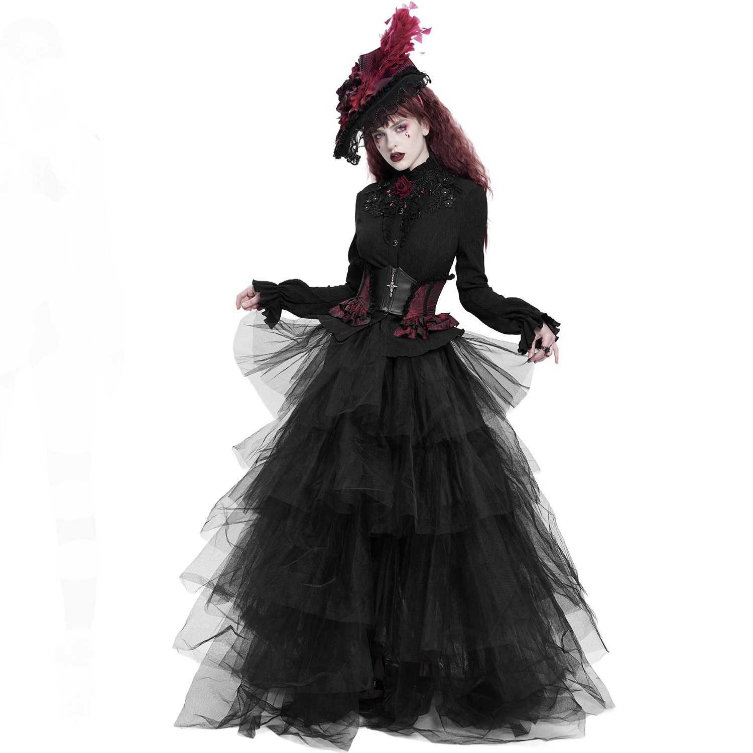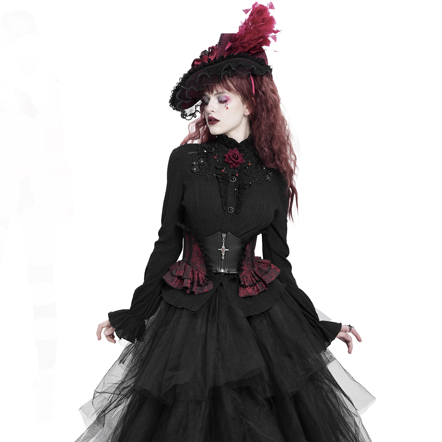 • En coton de qualité, agréable à porter • Encolure bateau • Poignets et encolure bordés de dentelle • Manches évasées • Décoré d'un cercueil en velours bordeaux avec une croix noire, bordé de...