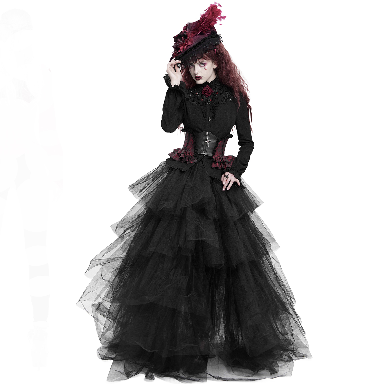 • En velours élastique réfléchissant noir et rouge • Épissé avec de la mousseline de soie • Col haut avec dentelle noire • Manches lanternes • Dentelle superposée sur la poitrine • Galons brodés...