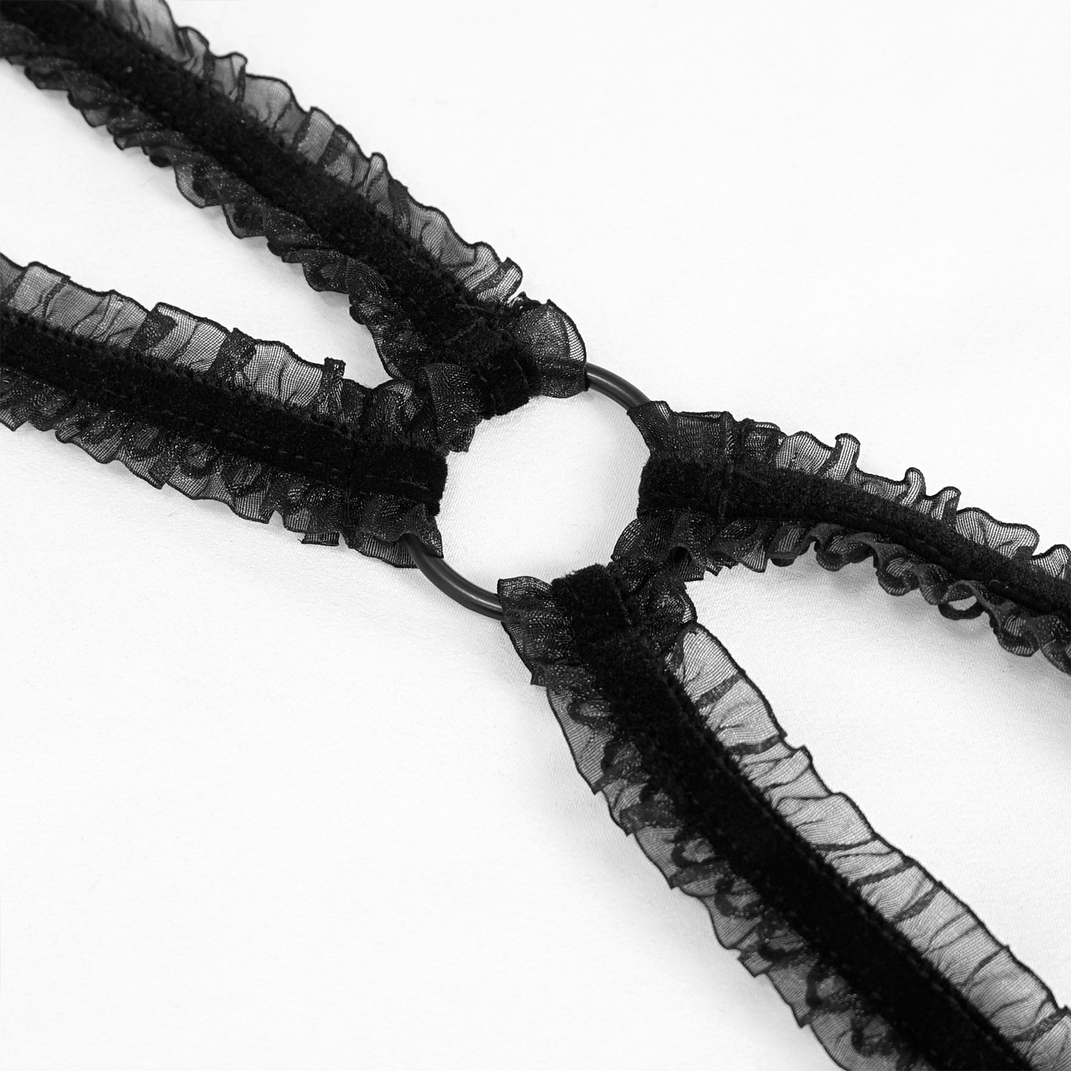 • En velours noir avec une bonne élasticité • Bretelles se nouant dans la nuque • Dentelle à volants sur le soutien-gorge • Laçage décoratif entre les bonnets du soutien-gorge • Dentelle florale...