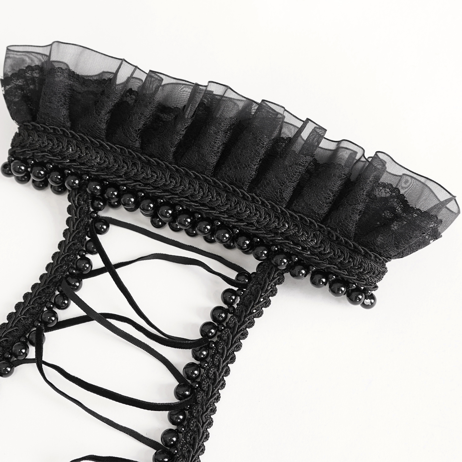 • Col haut avec dentelle froncée, agrémenté de perles noires, se ferme par boutons pressions dans la nuque