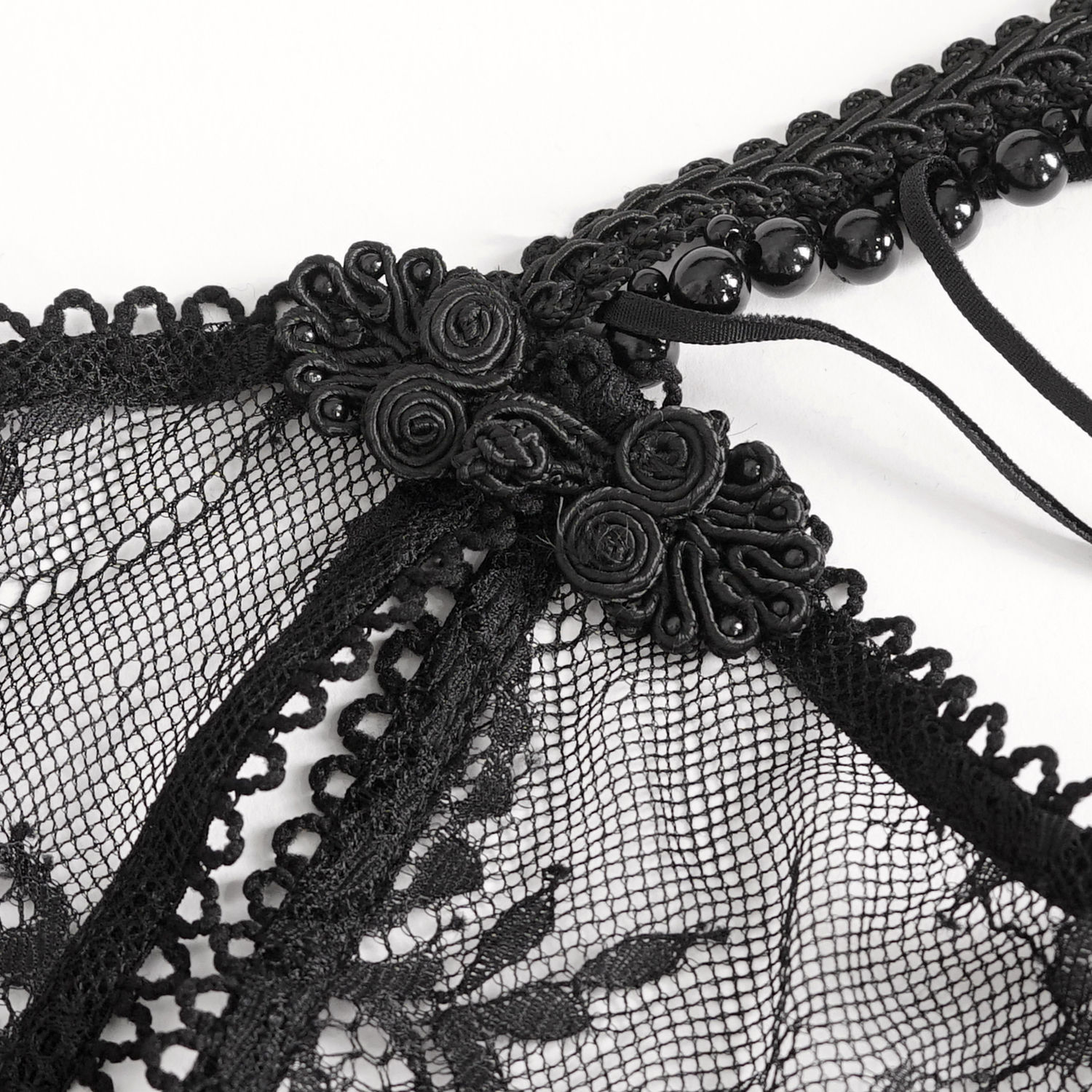 • En velours noir avec une bonne élasticité • Bretelles se nouant dans la nuque • Dentelle à volants sur le soutien-gorge • Laçage décoratif entre les bonnets du soutien-gorge • Dentelle florale...