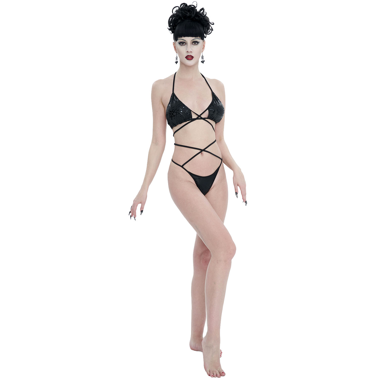 • Maillot de bain une pièce • Imprimé avec un motif gothique pentagramme • Haut conçu avec des bandes élastiques pour former un pentagramme • Laçages de chaque côté pour un ajustement parfait •...