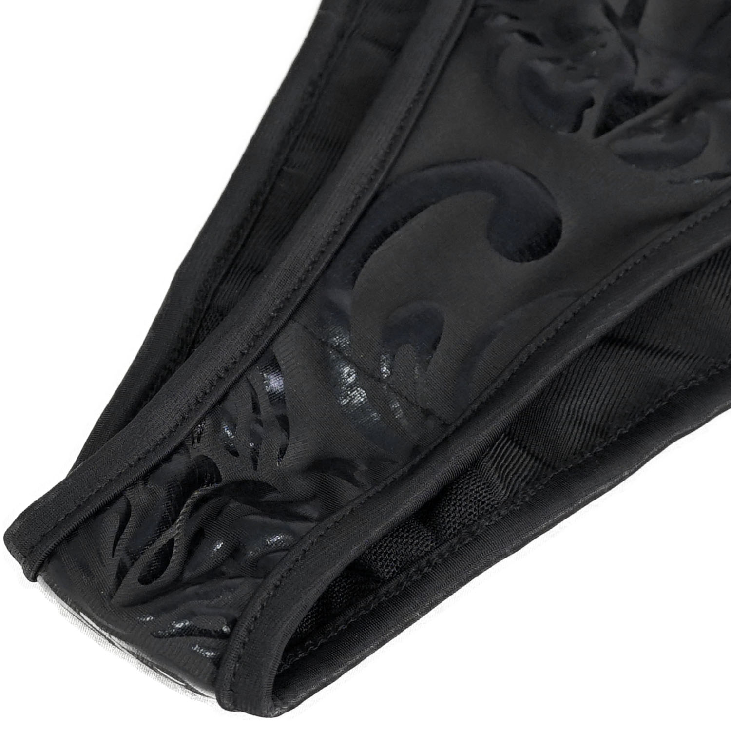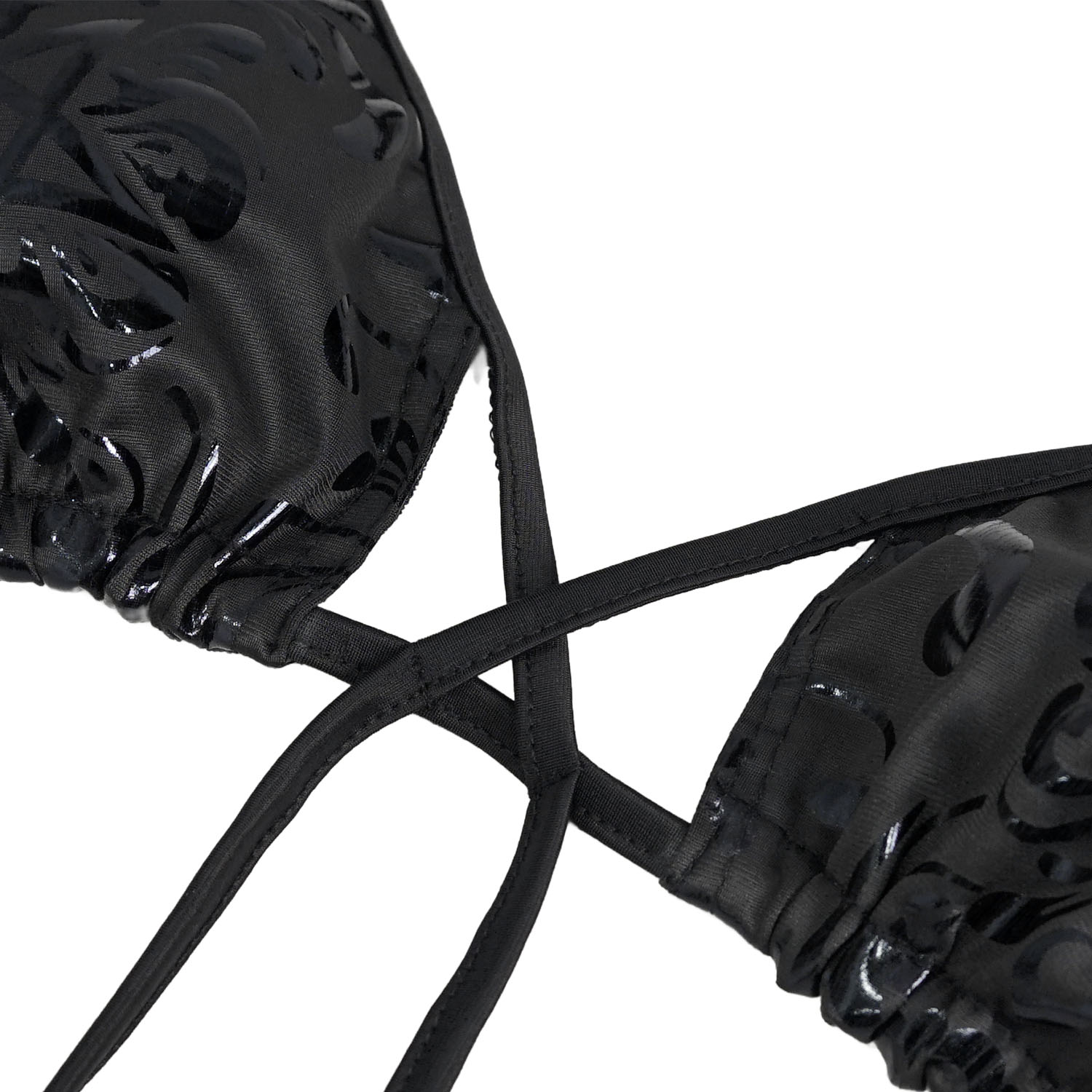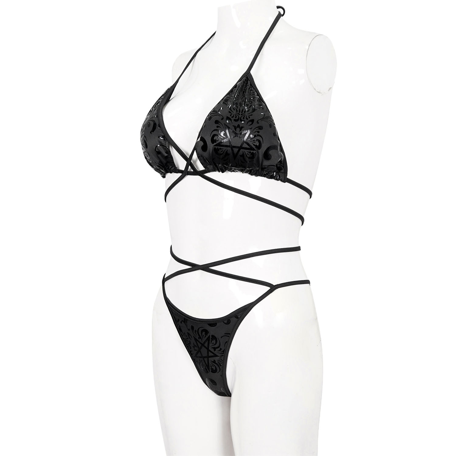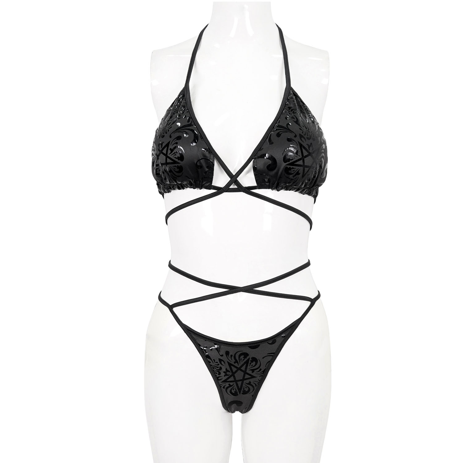 • Bikini gothique confectionné dans un tissu imprimé avec un motif gothique floral et pentagramme • Réalisé selon un procédé spécial imitant le cuir verni • Longs rubans effet bondage sur le haut...