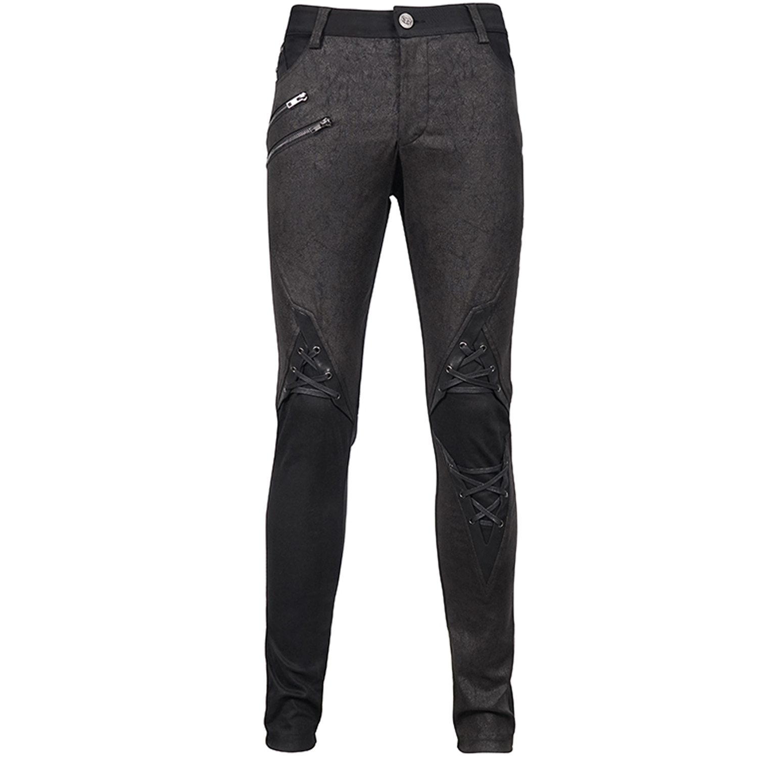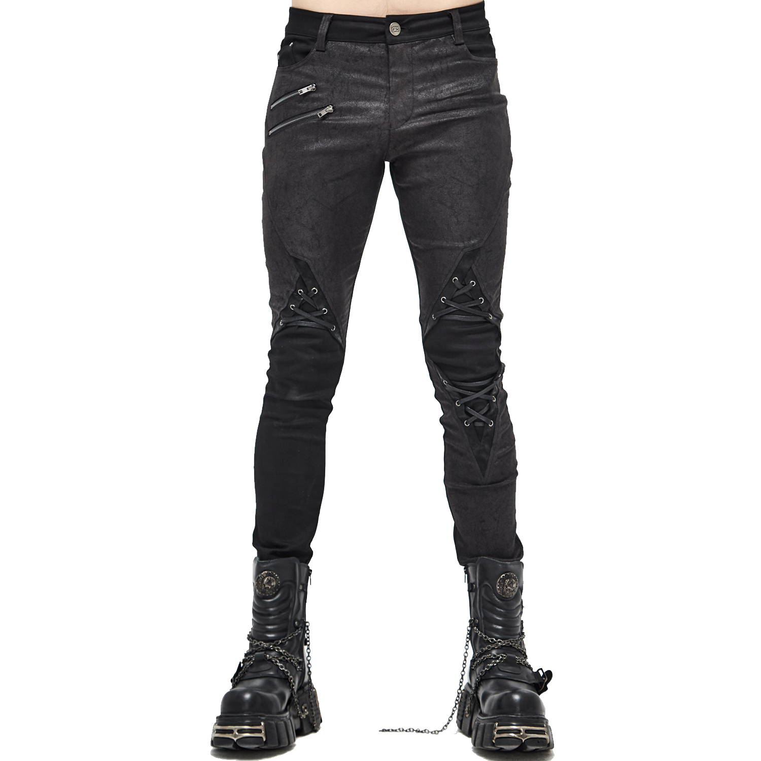 • En coton extensible et enduit, aspect cuir • Poches avant zippées • Poches arrières rivetées • Laçages de chaque côté • Clous pyramidaux au-dessus des genoux • Fermeture à glissière dissimulée •...
