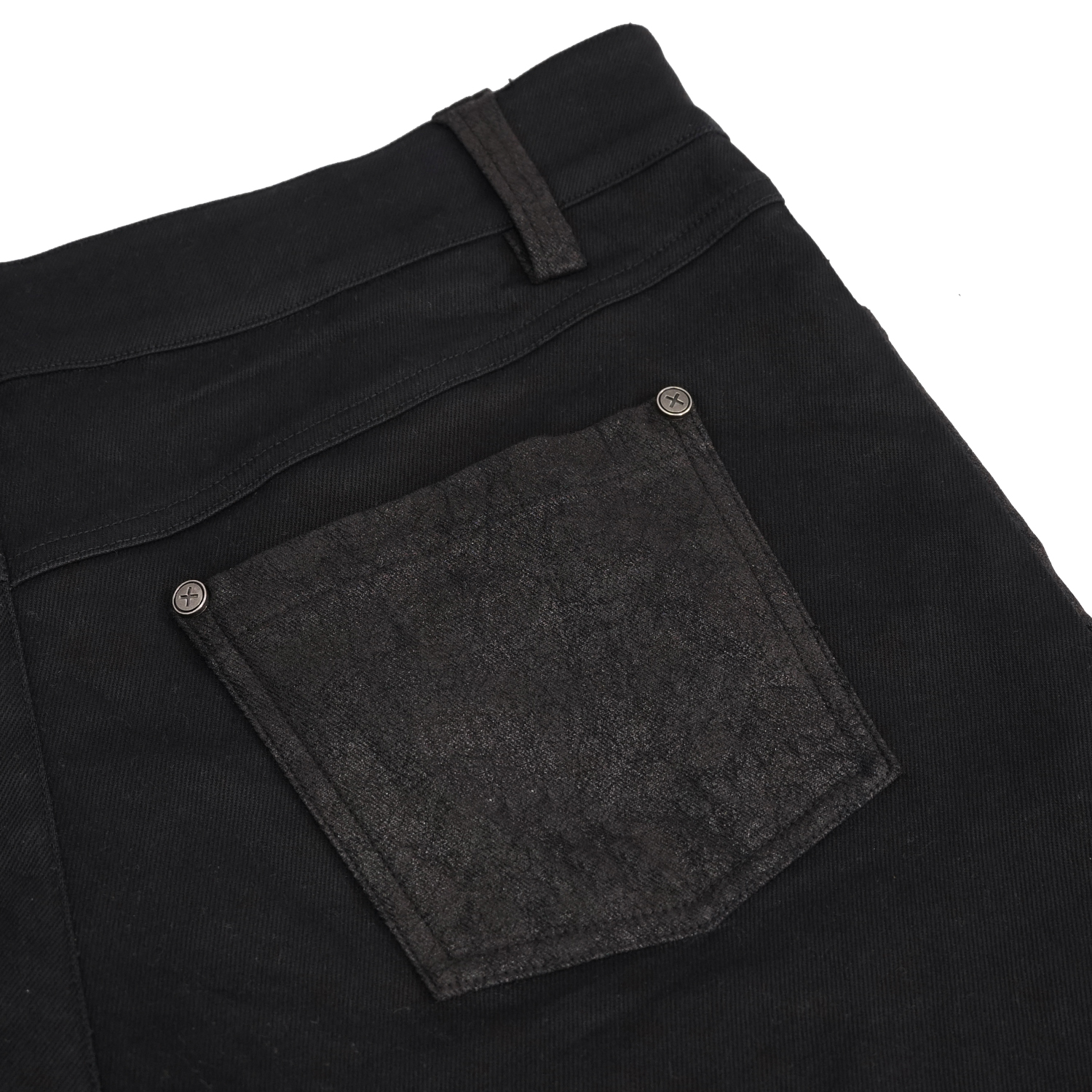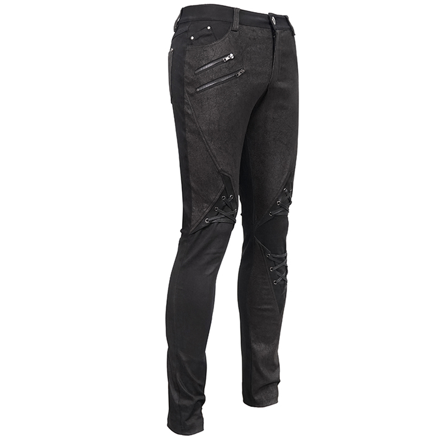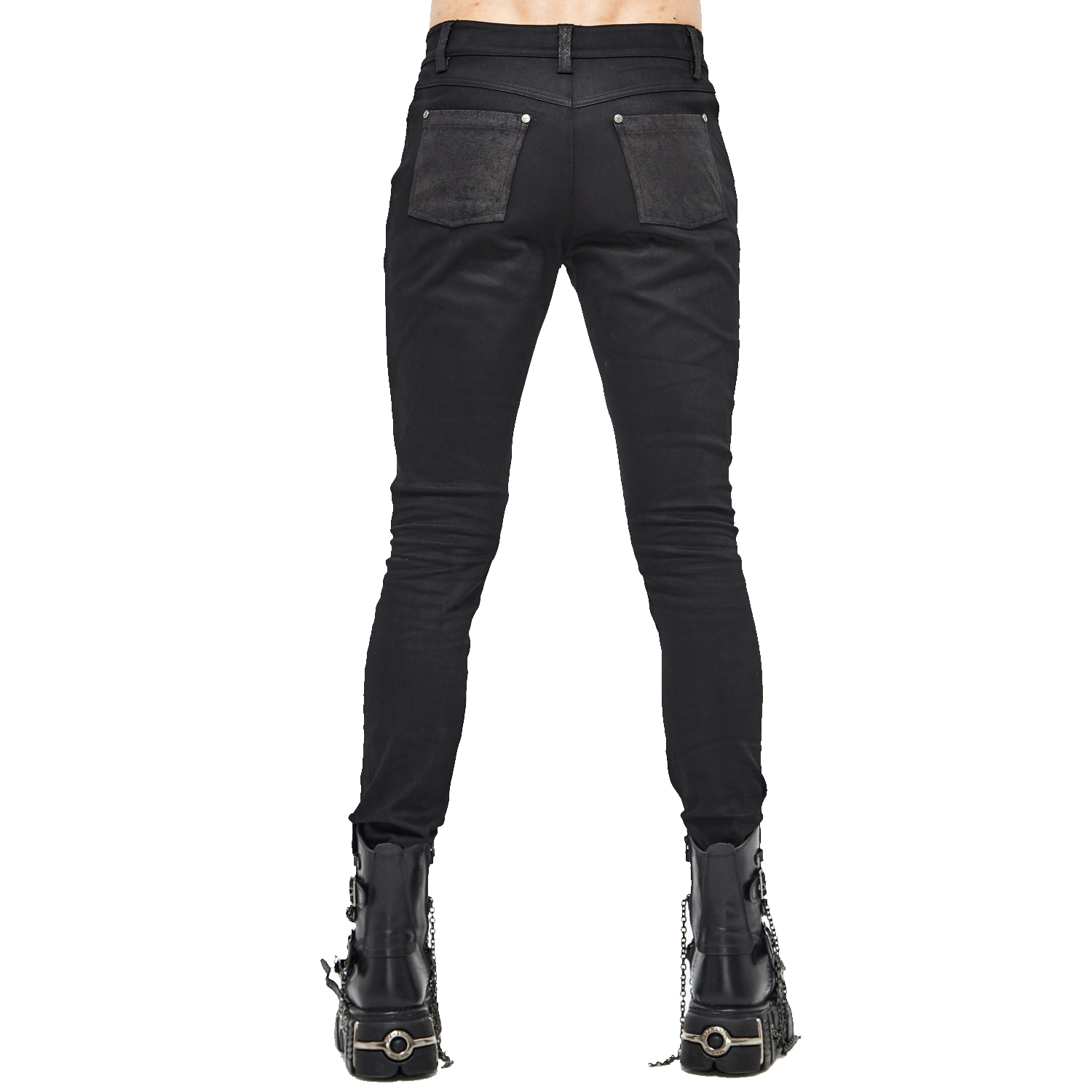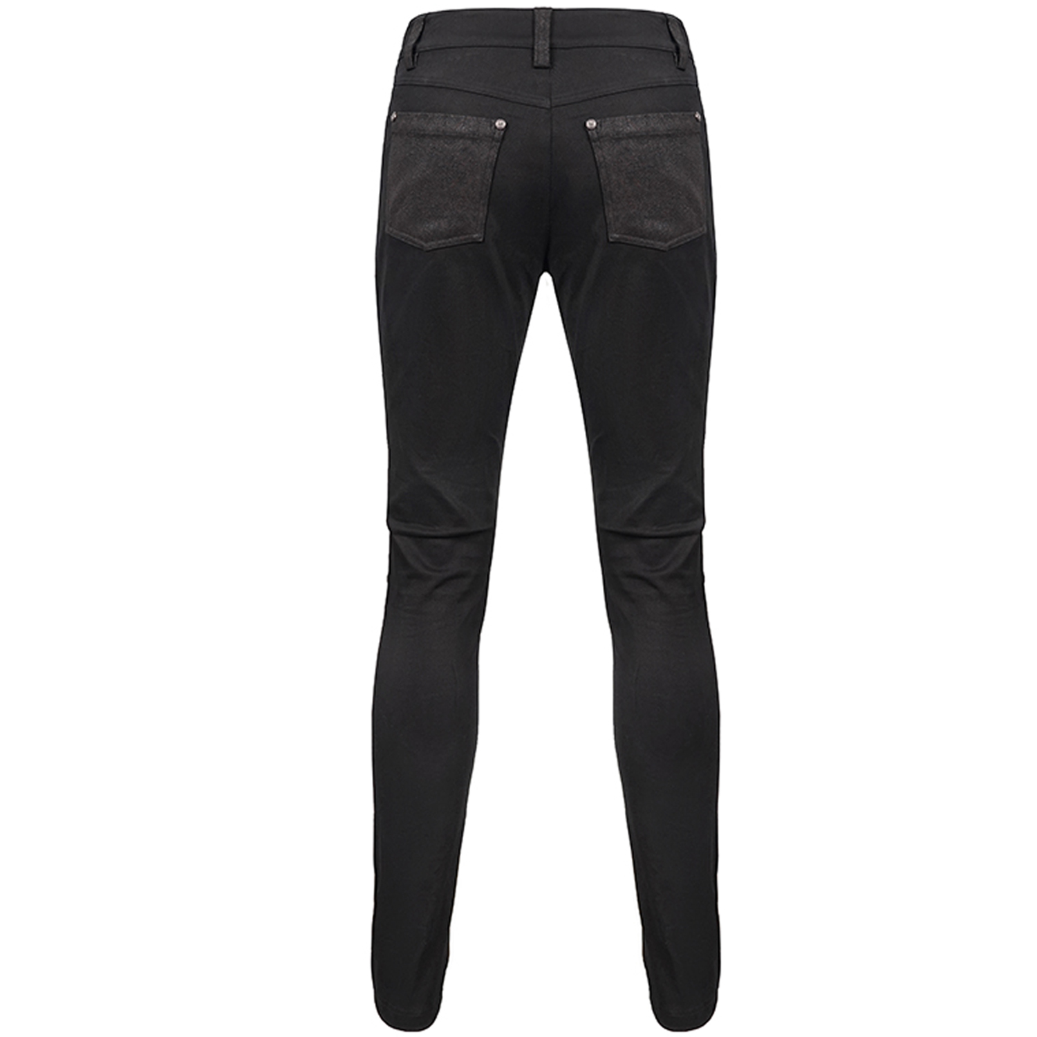 Pantalon noir pour homme gothique en tissu extensible avec détails en cuir synthétique et clous noirs. • Fermeture à glissière avec bouton Skull. • 99% Coton, 1% Autres fibres By Punk Rave...