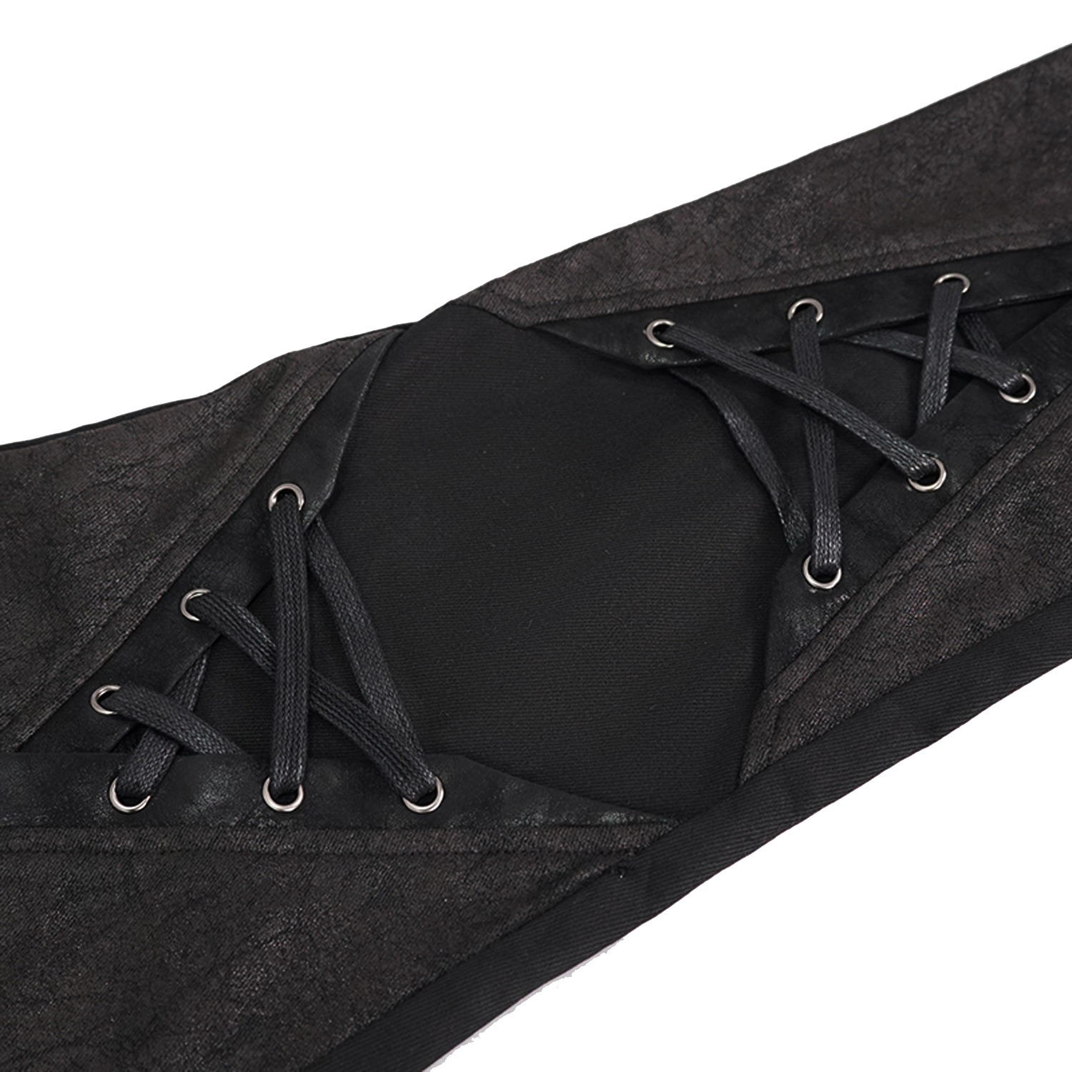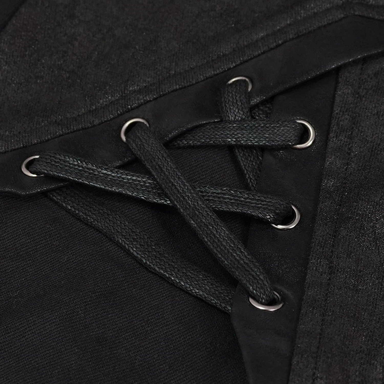 • En tissu sergé épissé avec un motif toile d'araignée • Simili cuir craquelé noir des deux côtés, décoré d'œillets et de lacets épais en coton • Panneau avant divisé de manière symétrique et...
