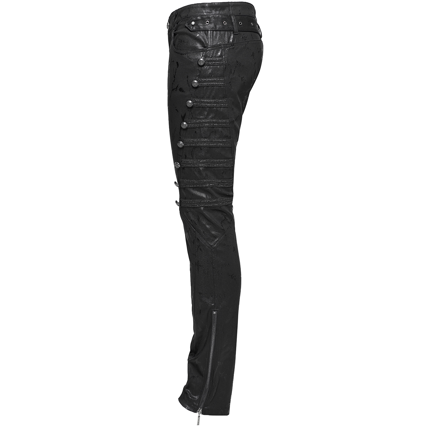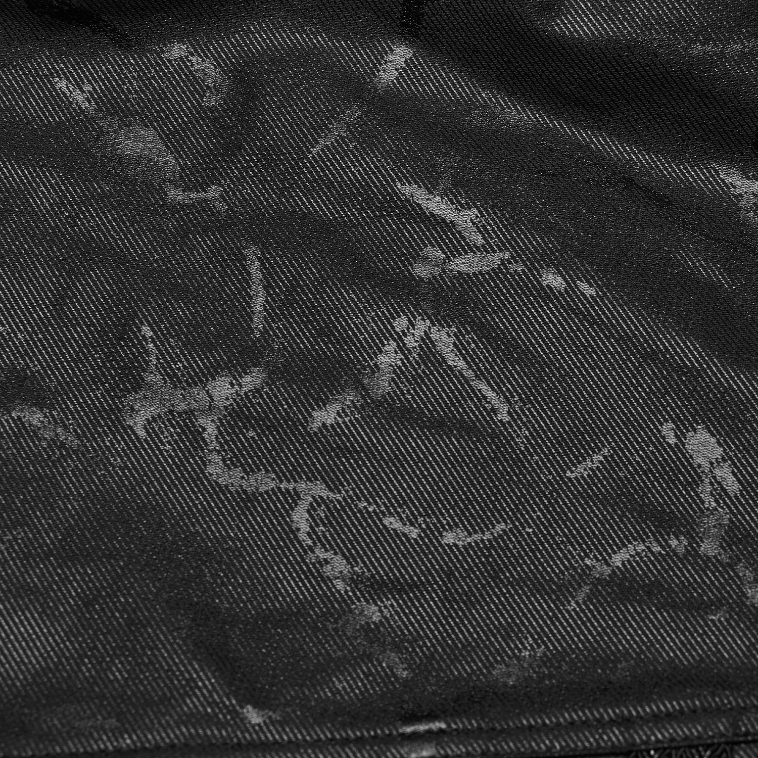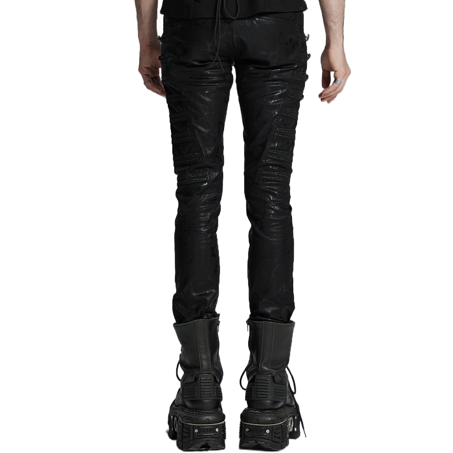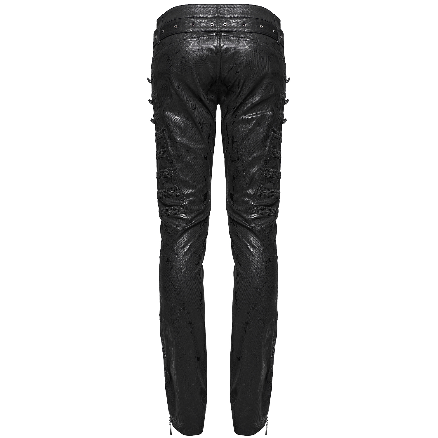 Pantalon noir slim de style post-apocalyptique pour hommes avec peinture en caoutchouc grise irrégulière, détails en résille vieillis et sangles. • Façade ornée d'imprimés gris-blanc irréguliers et...