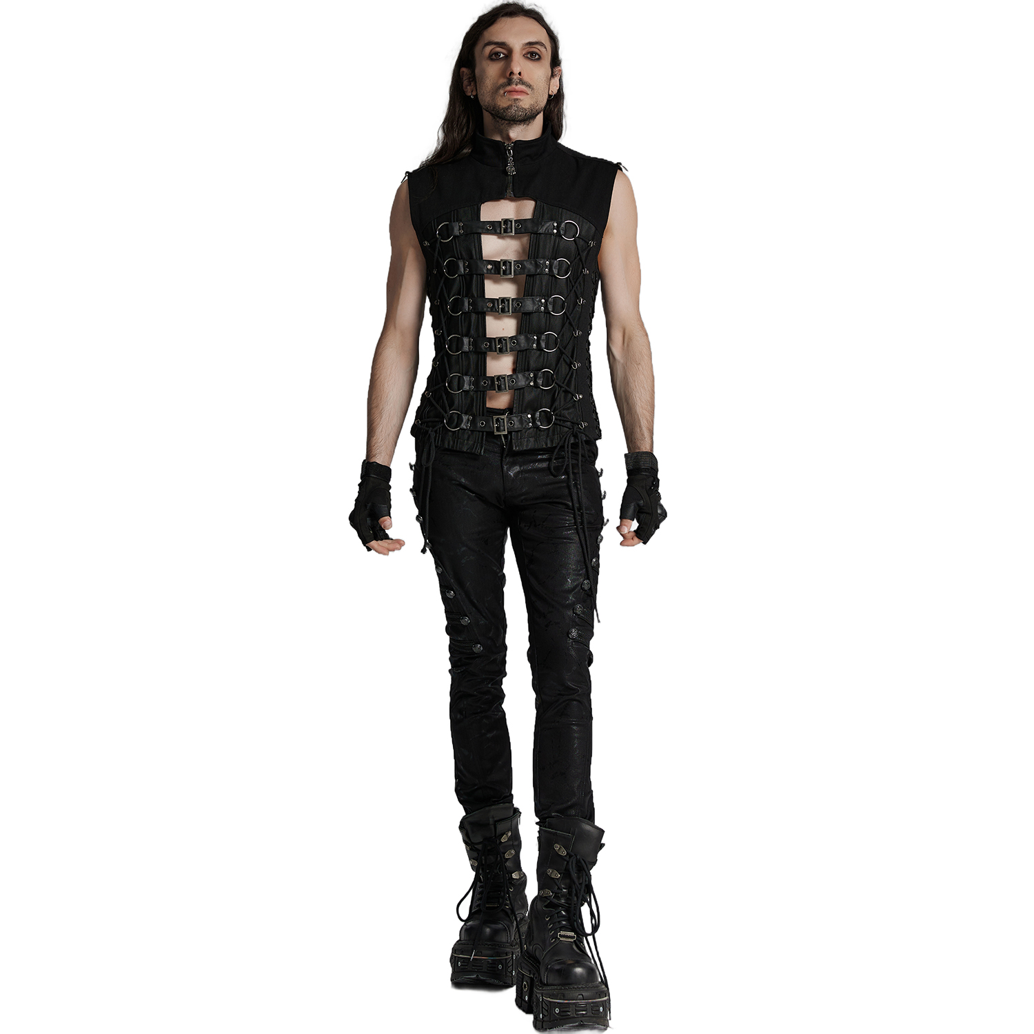 Pantalon homme déchiré de style gothique post-apocalyptique • En denim extensible et durable • Deux poches plus une poche profonde à l'avant • Deux poches à l'arrière • Points fantaisie...