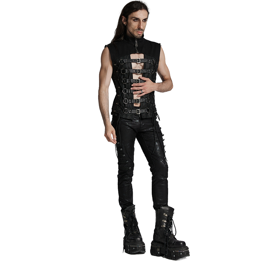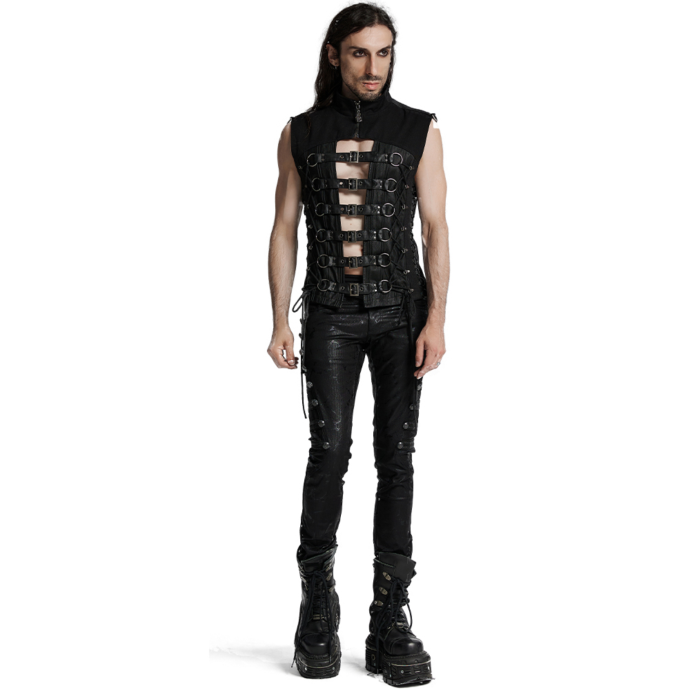 Jeans de style Dieselpunk pour hommes • En coton de qualité supérieure et extensible • Sangles en similicuir noir à clous métalliques • Patchs cousus avec œillets métalliques et anneaux en D •...