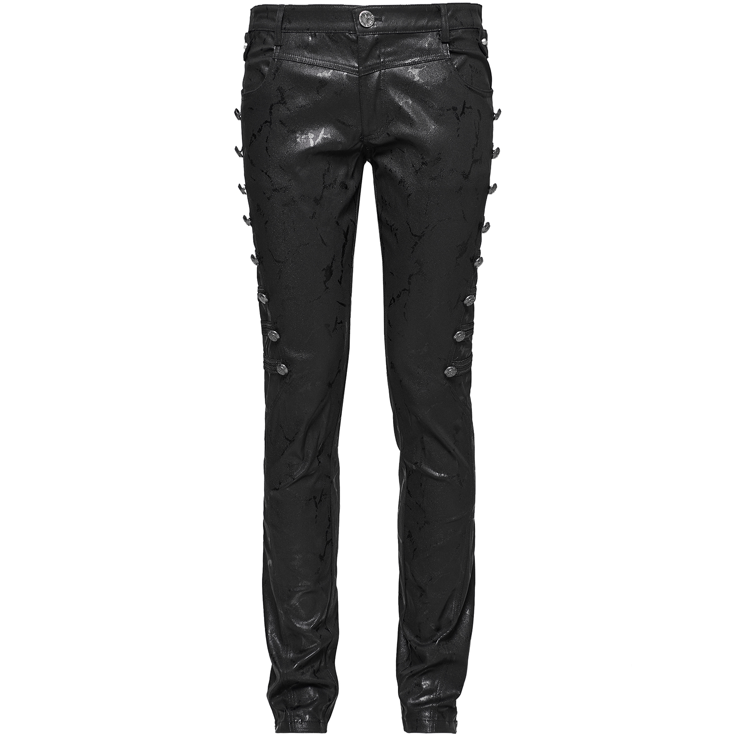 Pantalon skinny en simili cuir pour hommes. • En tissu élastique en similicuir à texture grossière • Coupe classique skinny • Fermeture à glissière et bouton sur le devant • Convient pour un usage...