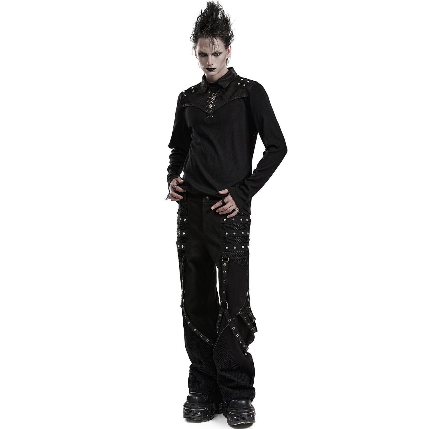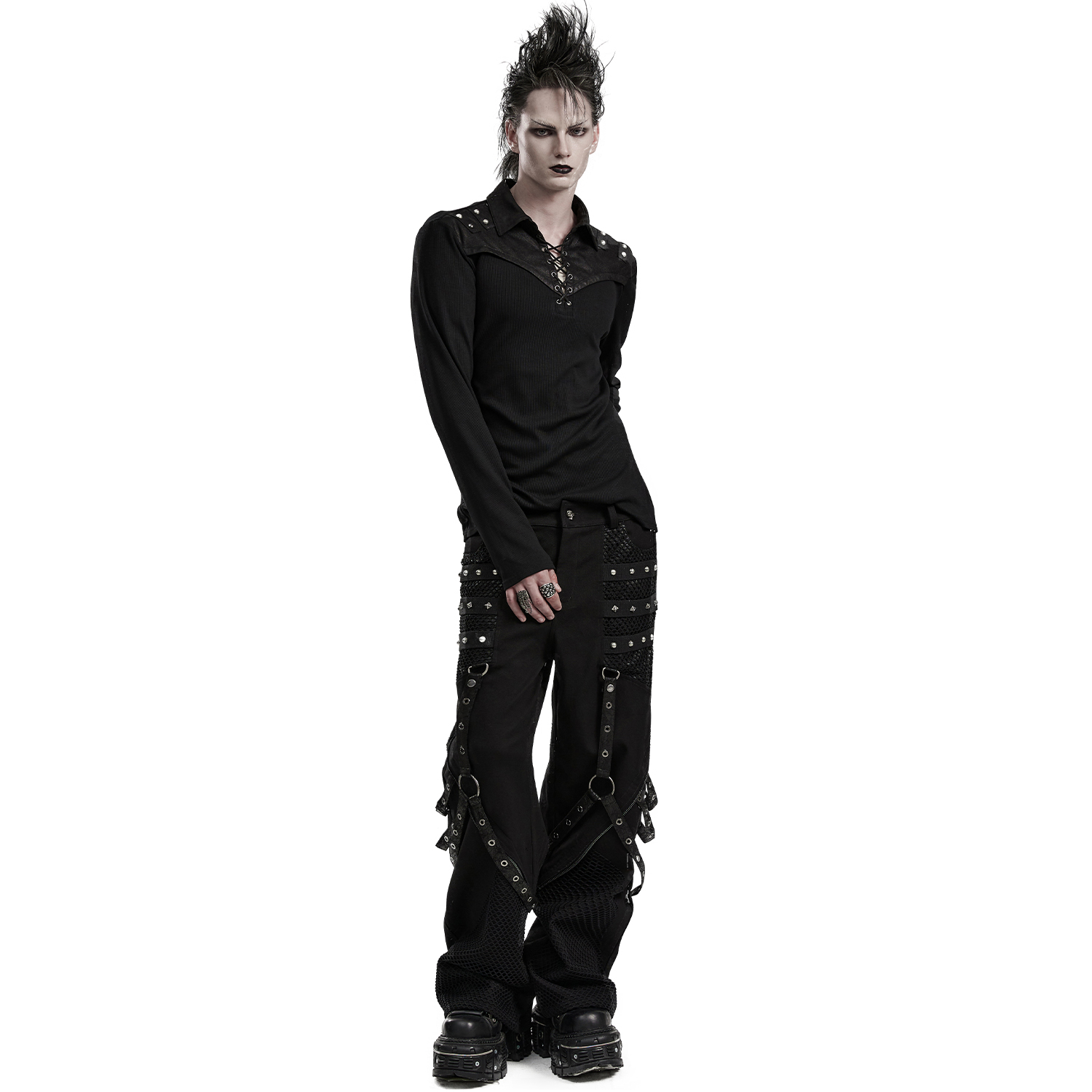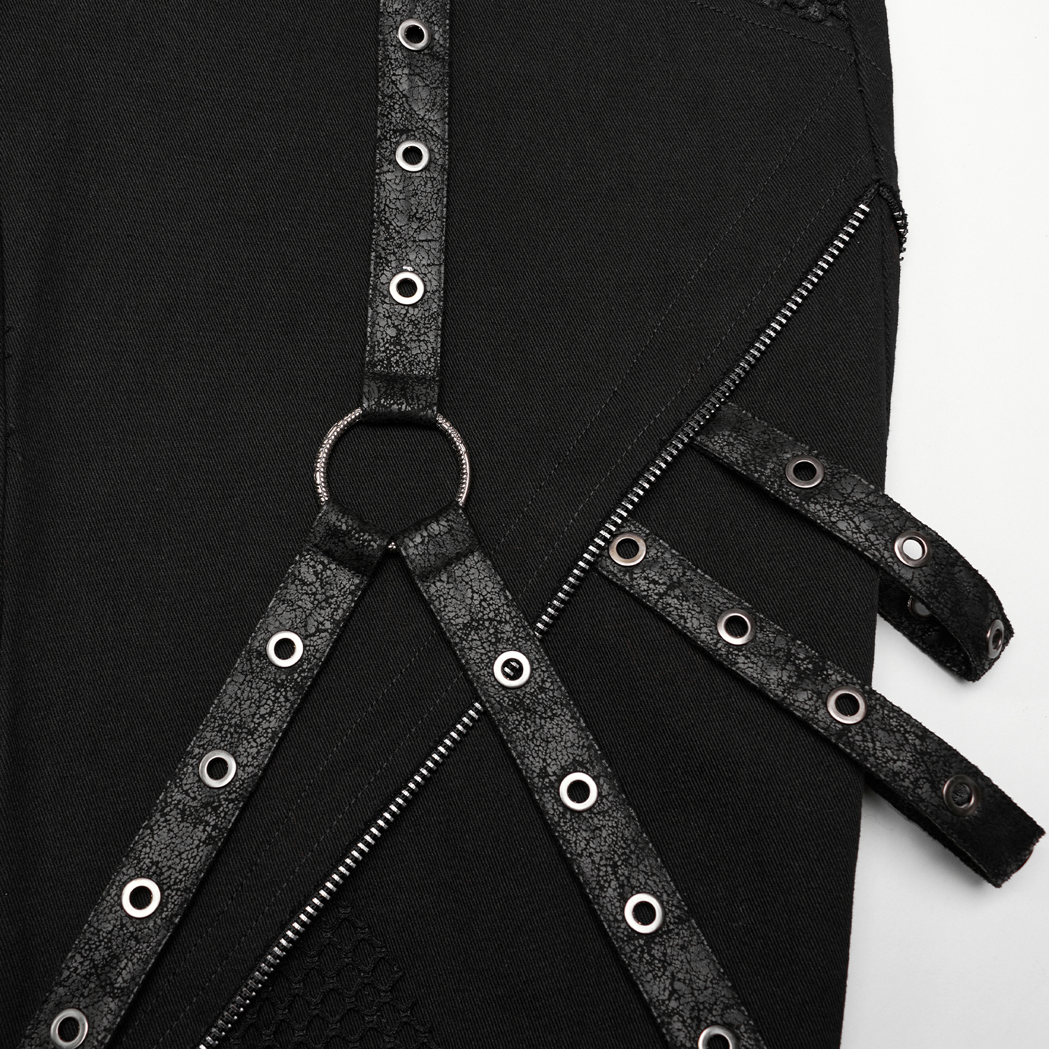 Jeans de style Dieselpunk pour hommes • En coton de qualité supérieure et extensible • Sangles en similicuir noir à clous métalliques • Patchs cousus avec œillets métalliques et anneaux en D •...