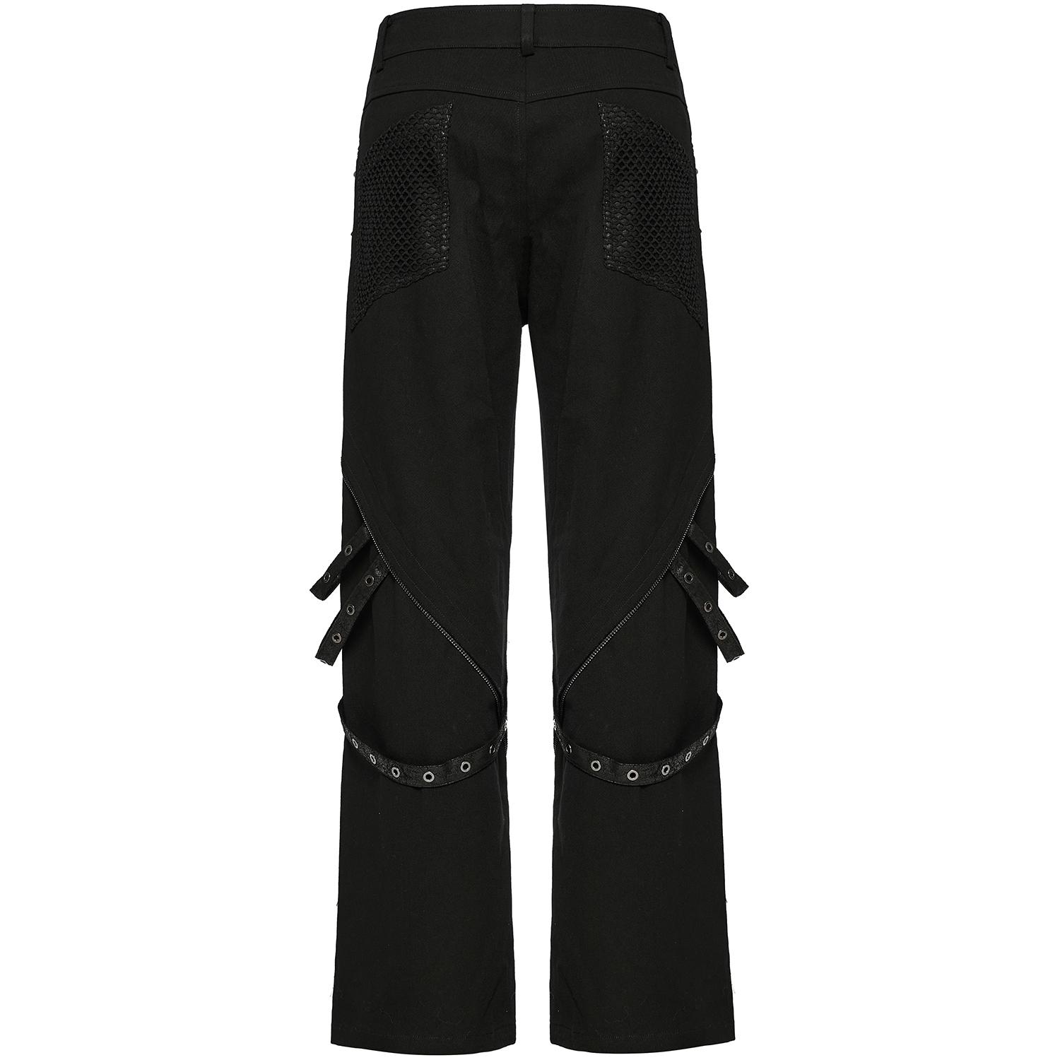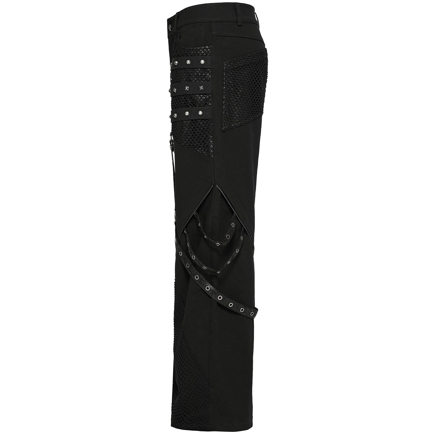 Pantalon noir slim de style post-apocalyptique pour hommes avec peinture en caoutchouc grise irrégulière, détails en résille vieillis et sangles. • Façade ornée d'imprimés gris-blanc irréguliers et...