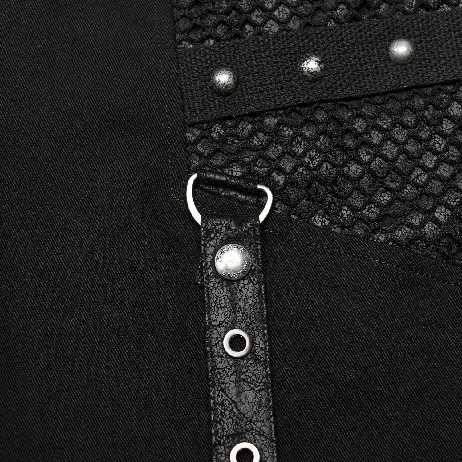 • En sergé extensible et similicuir craquelé • Bandes en similicuir noir au niveau des jambes • Sangle en coton avec rivets et clous pyramidaux métalliques sur les poches avant • Résille sur les...