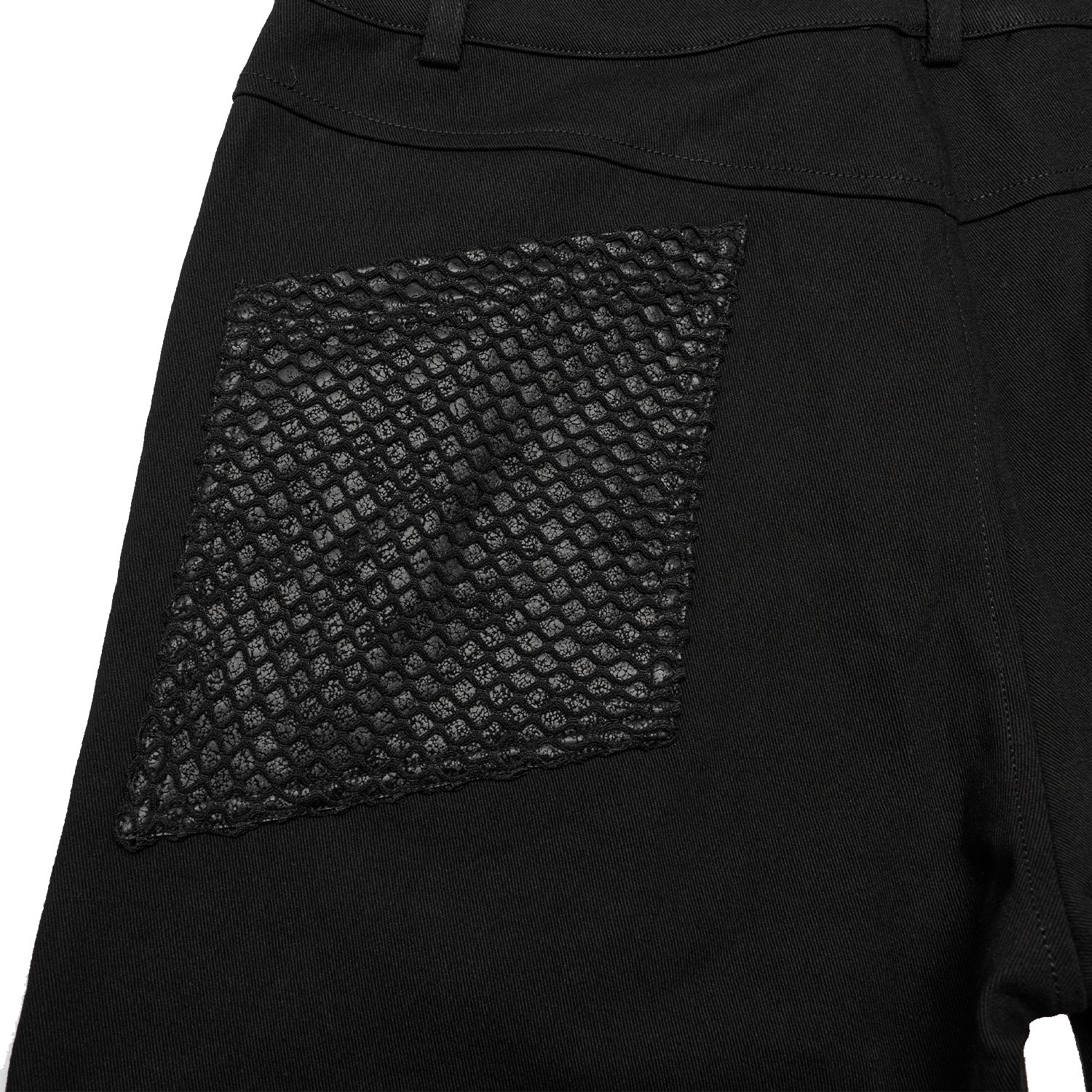 Pantalon en jean de style post apocalyptique pour hommes. • En coton stretch effet vieilli et délavé noir jais • Similicuir grainé doux • Panneaux latéraux en similicuir à l'avant et de la taille à...