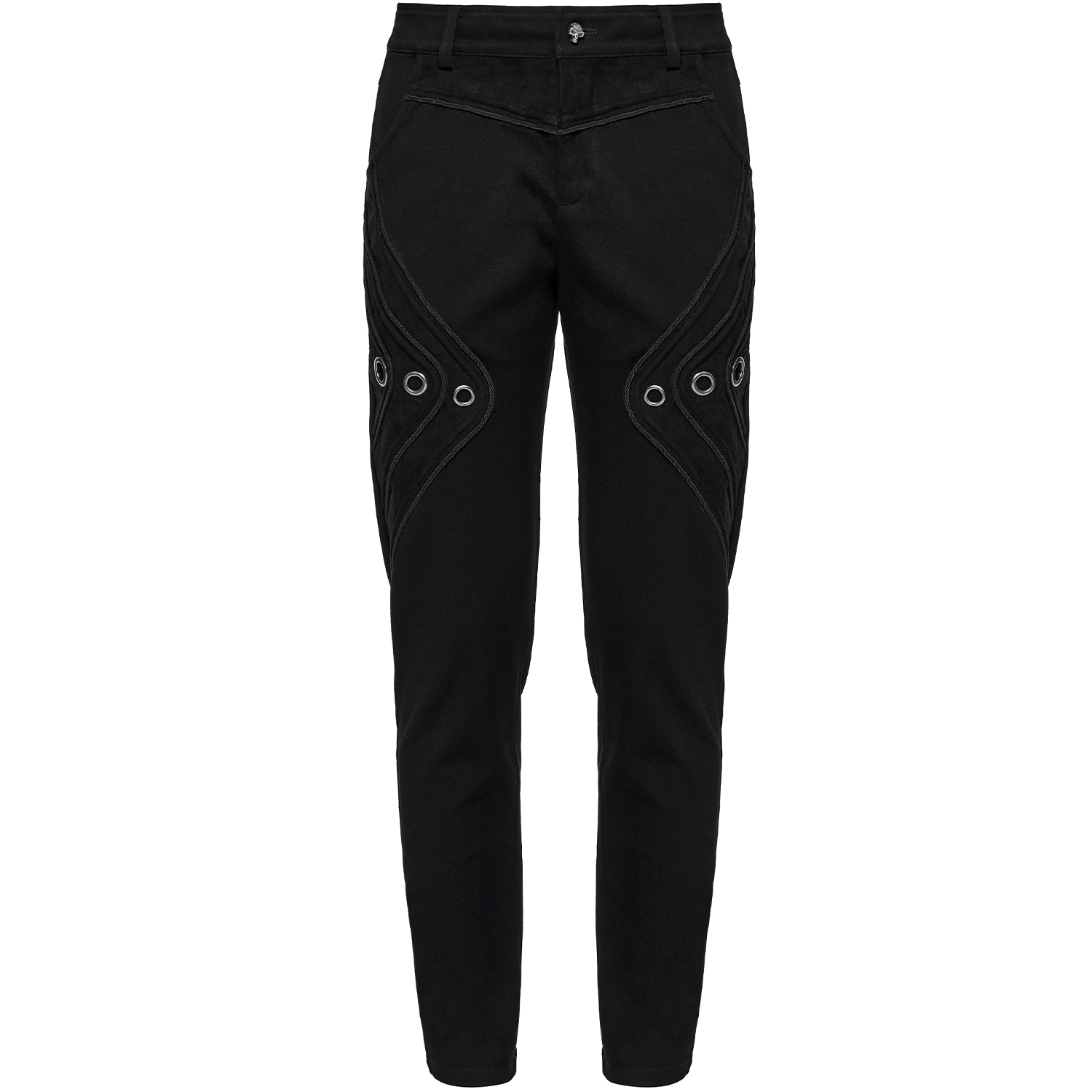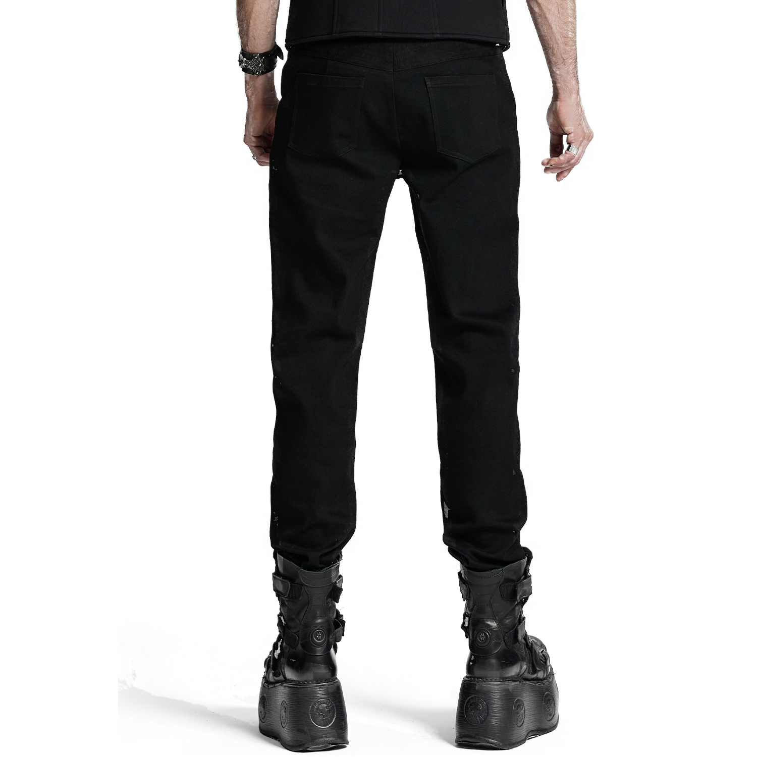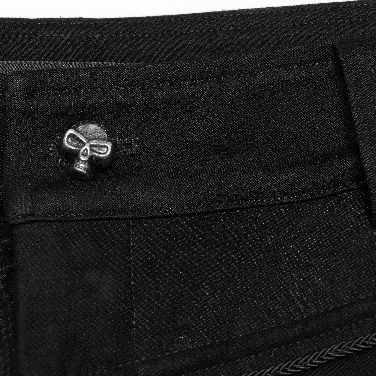 Pantalon noir pour homme gothique en tissu extensible avec détails en cuir synthétique et clous noirs. • Fermeture à glissière avec bouton Skull. • 99% Coton, 1% Autres fibres By Punk Rave...