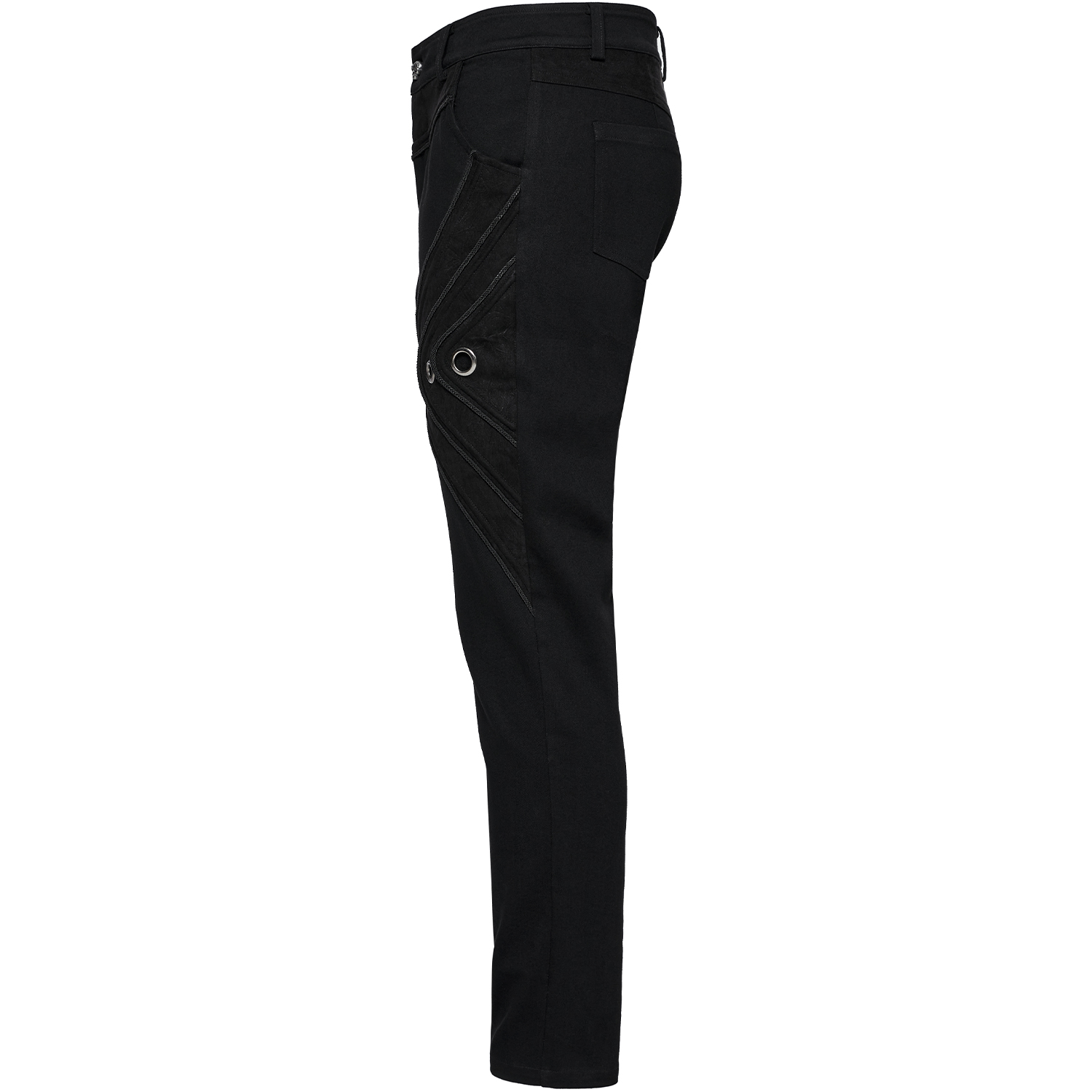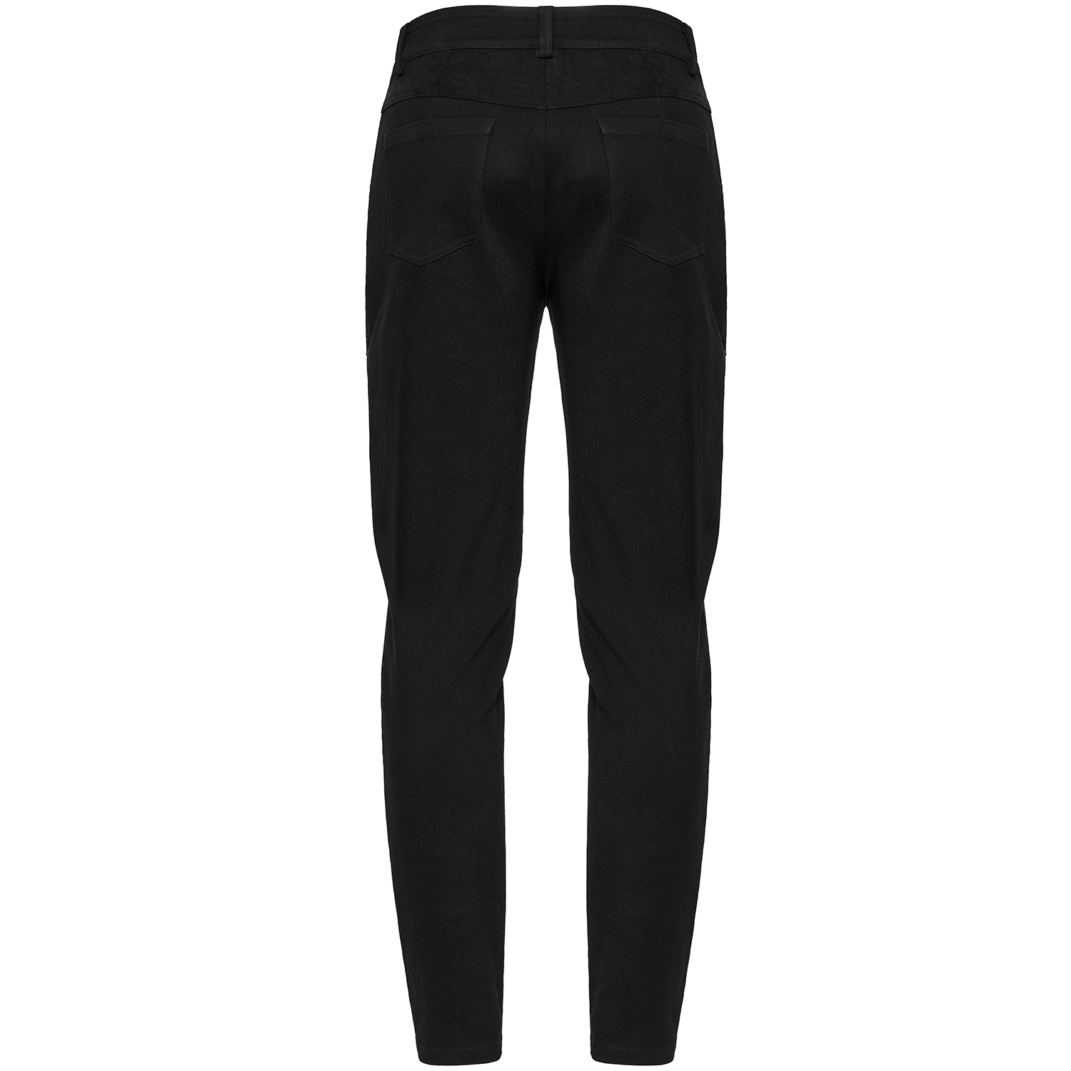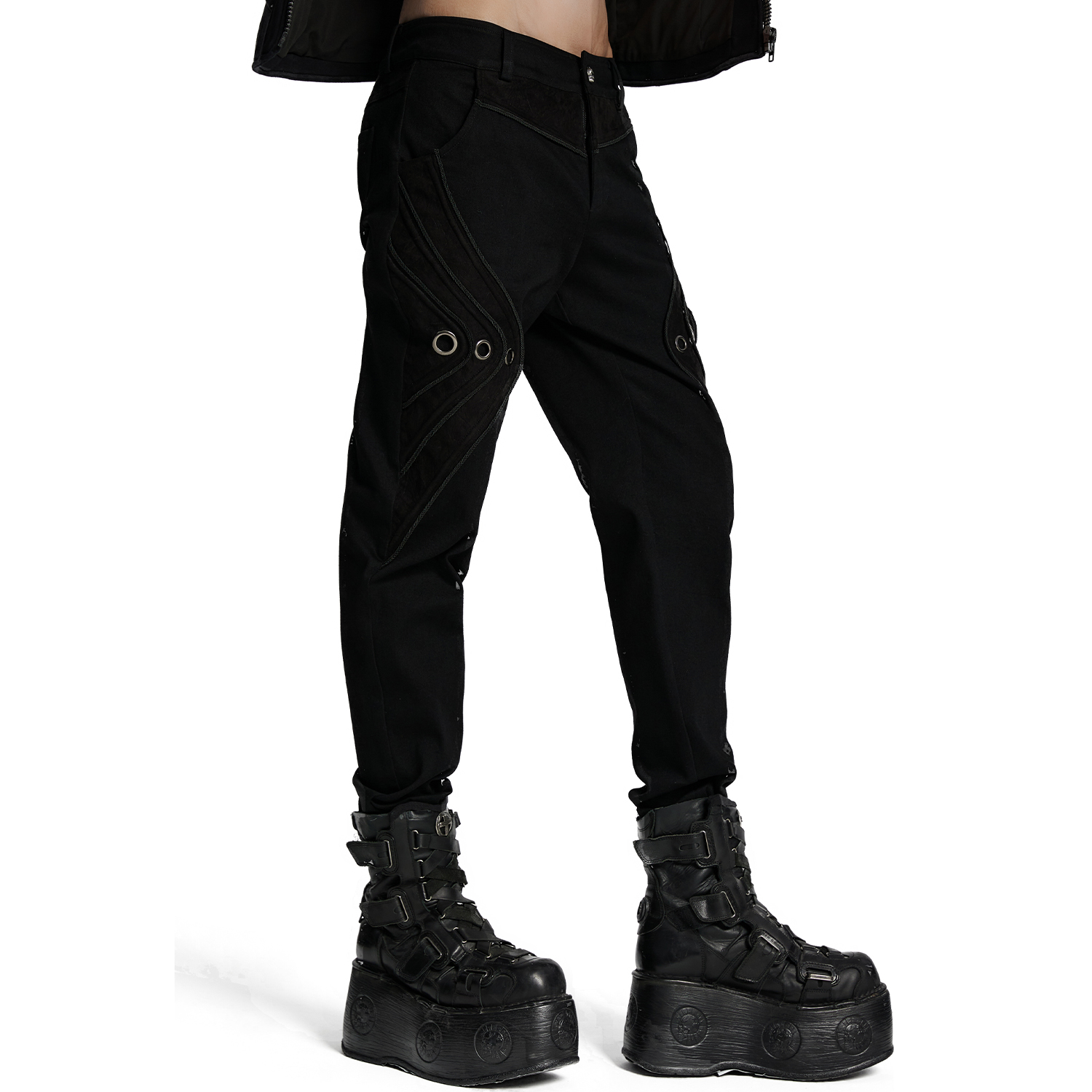 Pantalon noir pour homme gothique en tissu extensible avec détails en cuir synthétique et clous noirs. • Fermeture à glissière avec bouton Skull. • 99% Coton, 1% Autres fibres By Punk Rave...