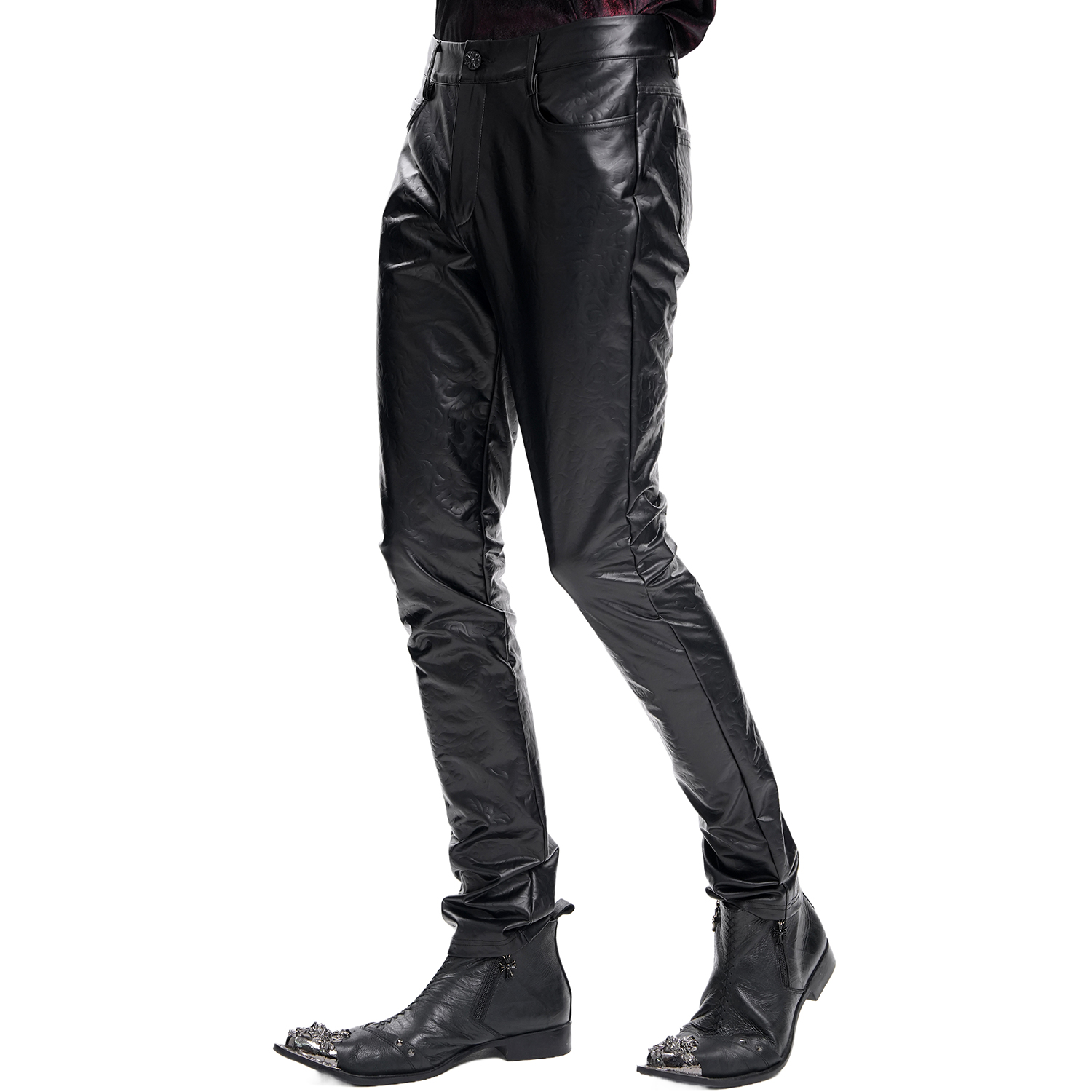Pantalon noir pour homme gothique en tissu extensible avec détails en cuir synthétique et clous noirs. • Fermeture à glissière avec bouton Skull. • 99% Coton, 1% Autres fibres By Punk Rave...