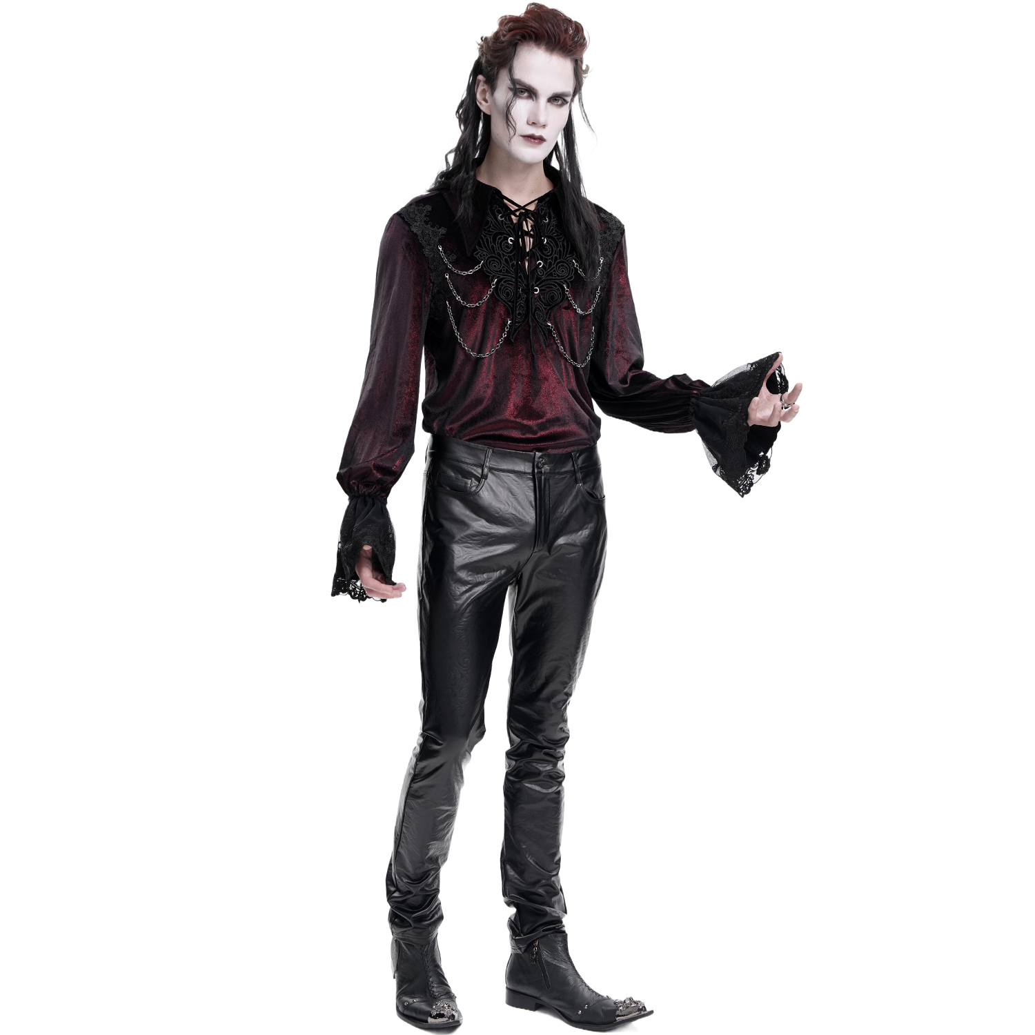 • En velours bordeaux à manches longues • Laçage au niveau de l'encolure avec broderies • Broderies sur le bord des manches • Chaînettes amovibles • Manches amples • Poignets en dentelle • Deux...