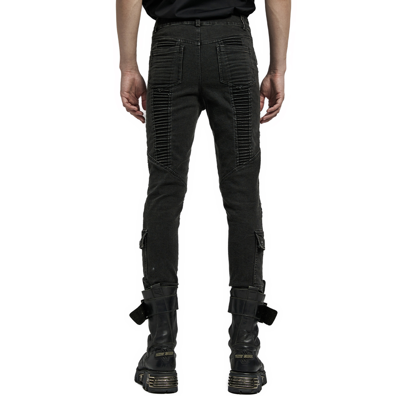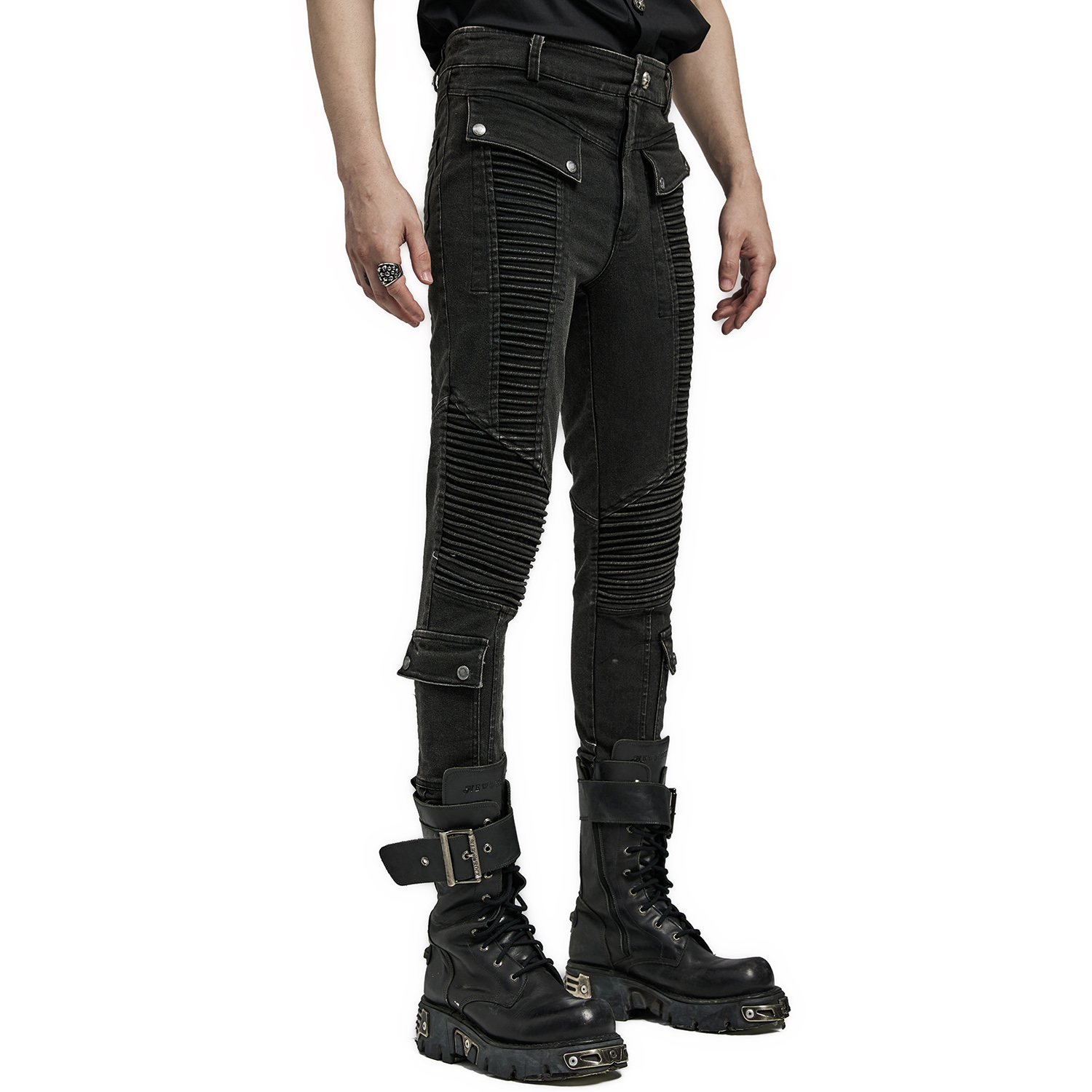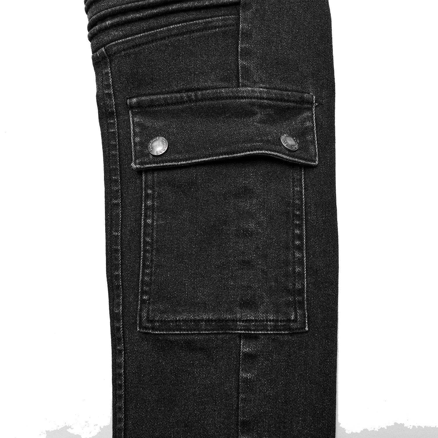 Pantalon noir gothique pour homme avec surpiqûres, patchs et zip. • Cinq poches : deux devant, deux derrière et une poche zippée à rabat sur le côté droit de la cuisse. • Fermeture à glissière...