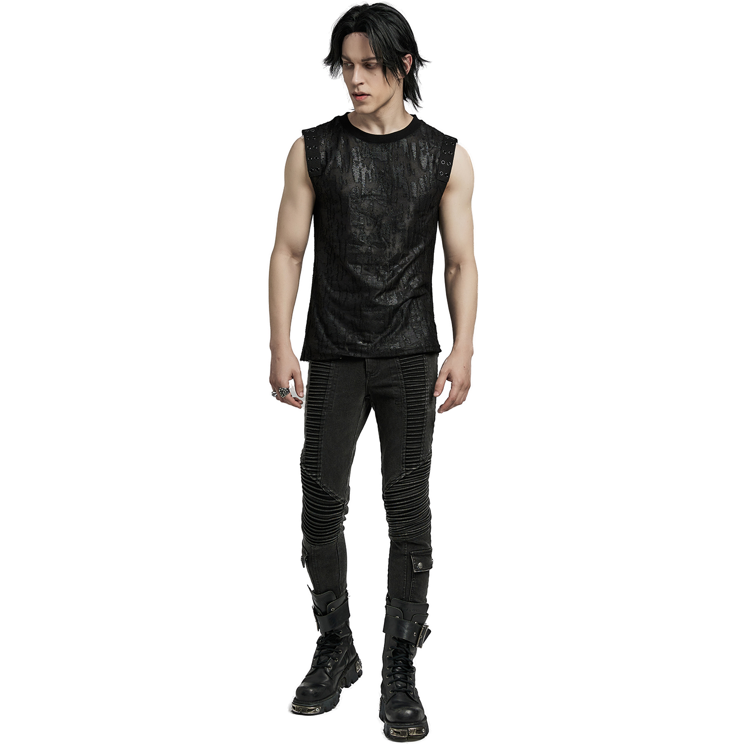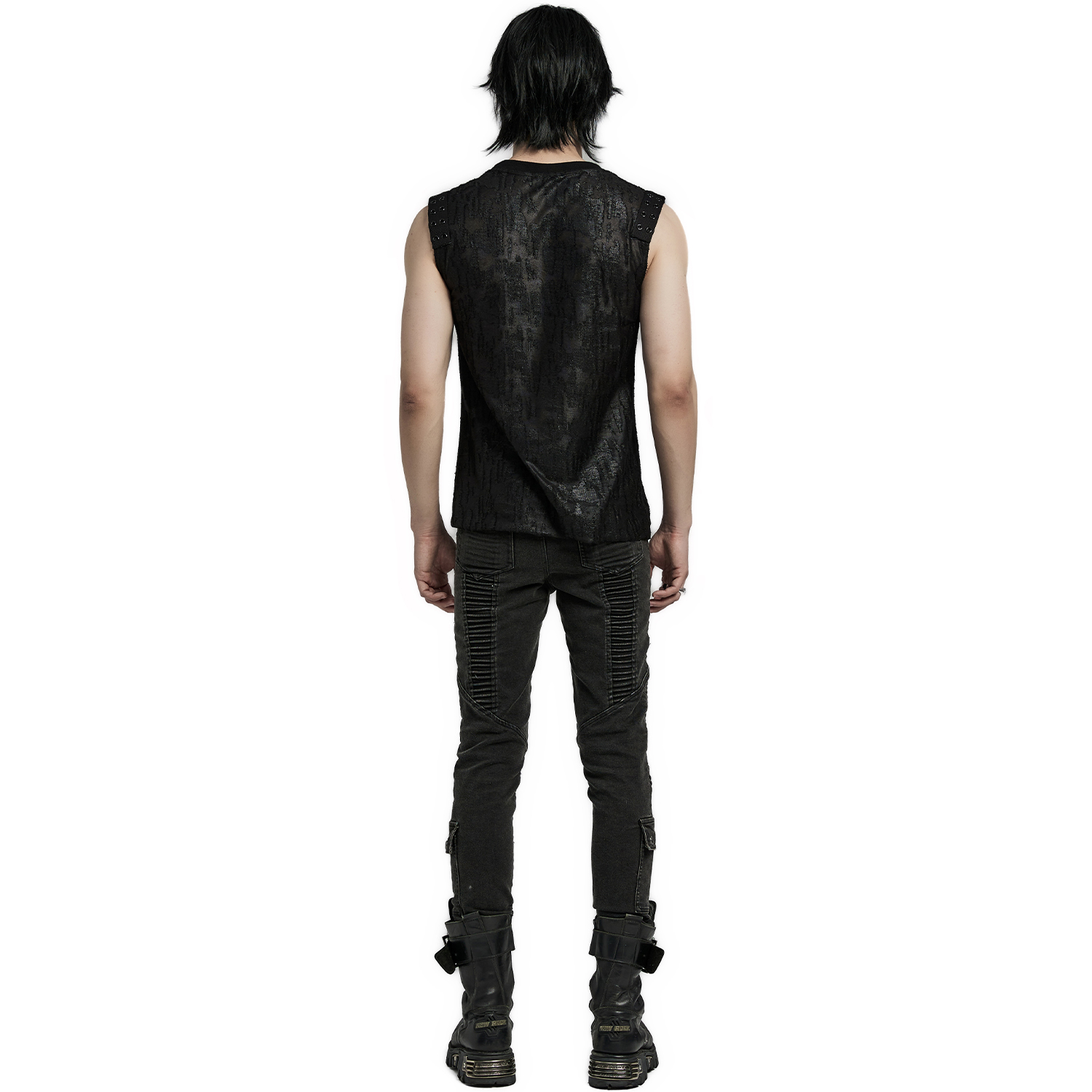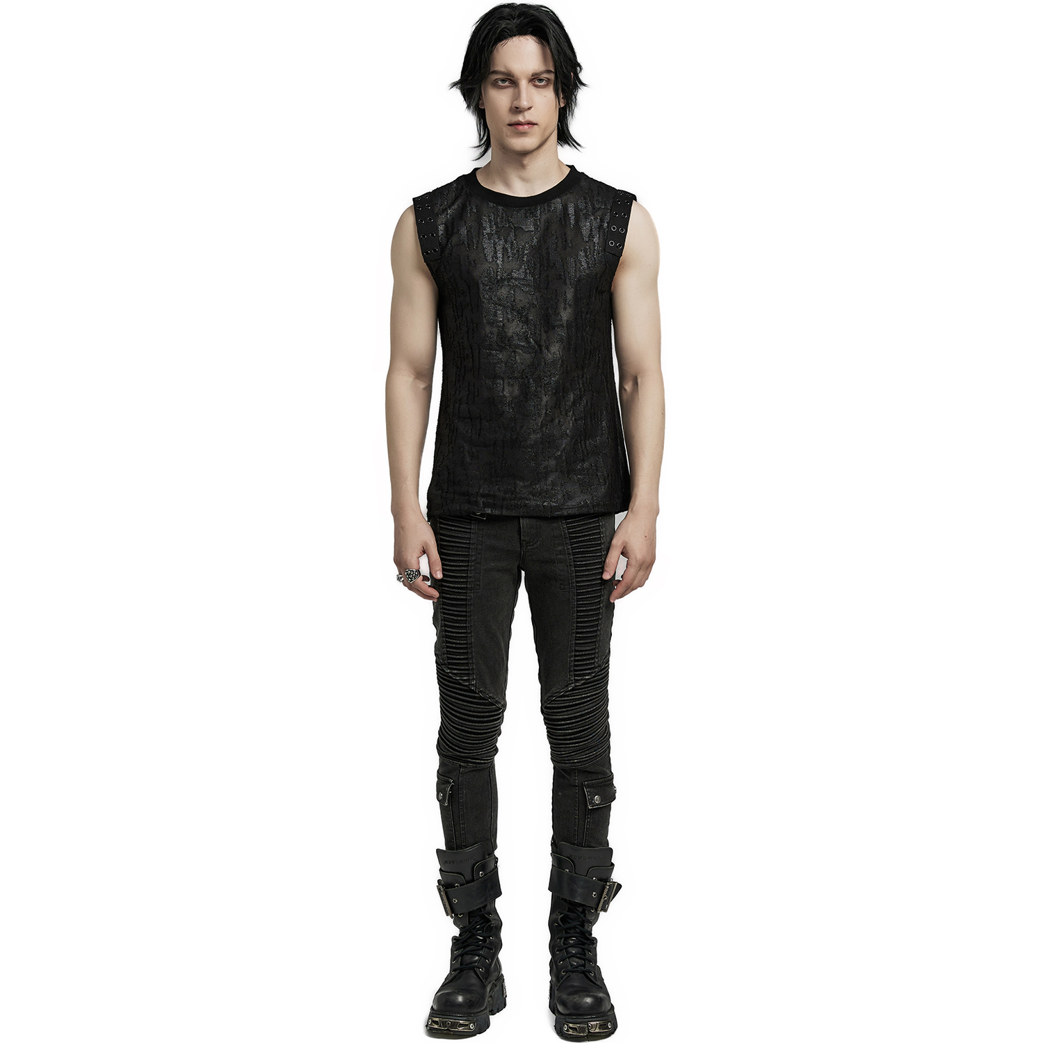 Pantalon noir gothique pour homme avec surpiqûres, patchs et zip. • Cinq poches : deux devant, deux derrière et une poche zippée à rabat sur le côté droit de la cuisse. • Fermeture à glissière...