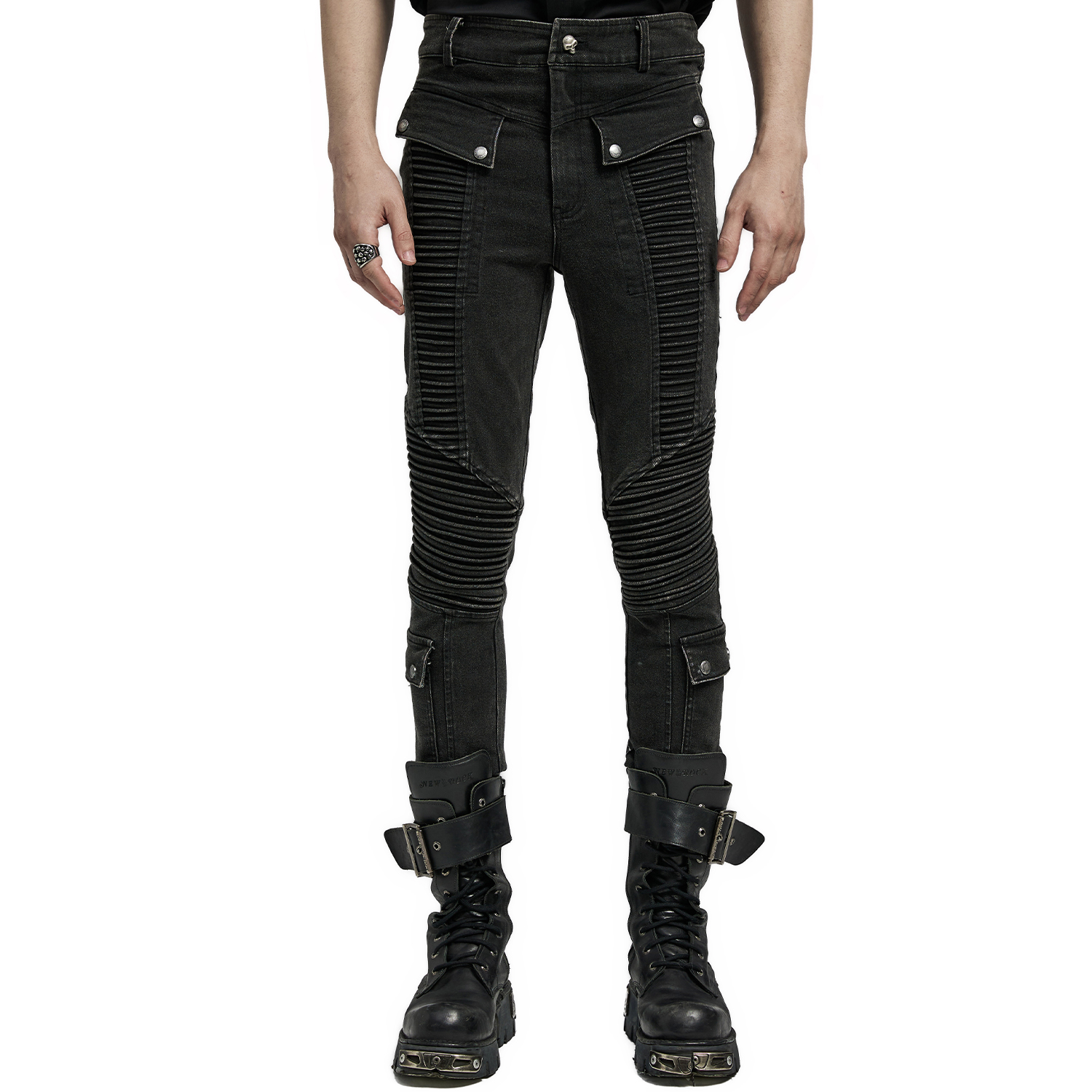 • En sergé élastique épais • Empiècements noirs 3D à l'effet cyber sur les côtés • Empiècements 3D façon armure sur les genoux • Fermeture à glissière avec bouton métallique en forme de skull sur...