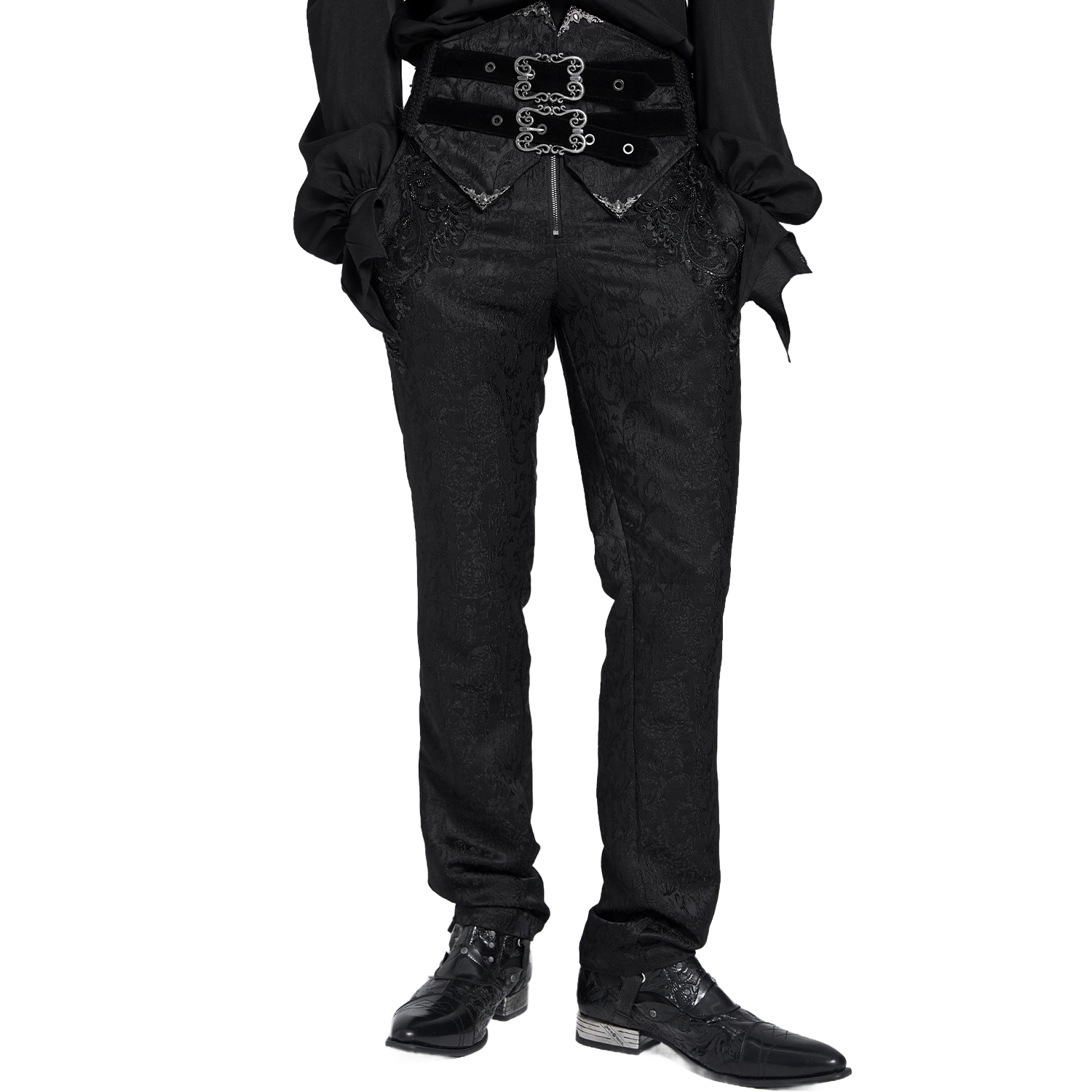 Pantalon noir gothique pour homme avec surpiqûres, patchs et zip. • Cinq poches : deux devant, deux derrière et une poche zippée à rabat sur le côté droit de la cuisse. • Fermeture à glissière...