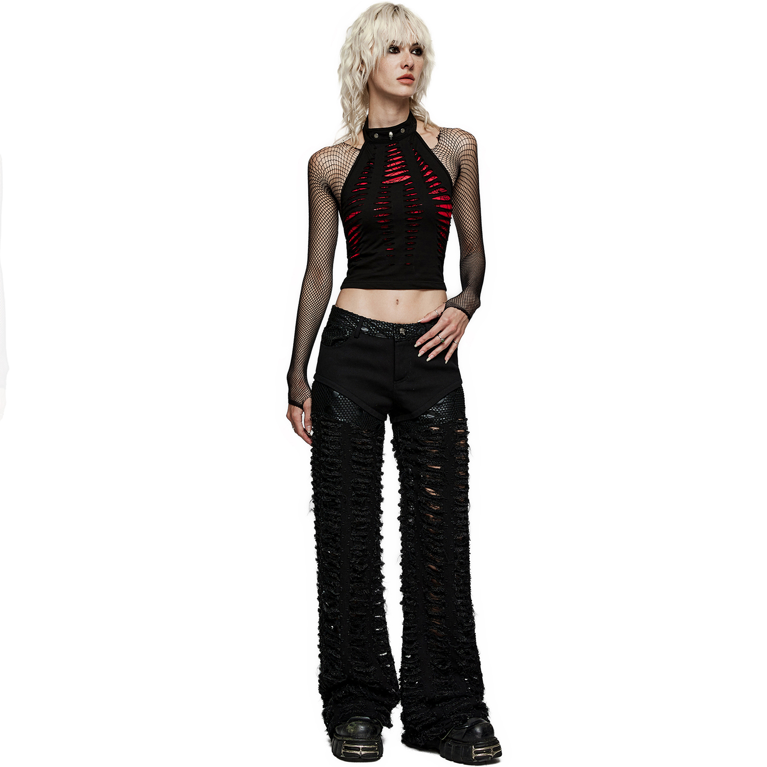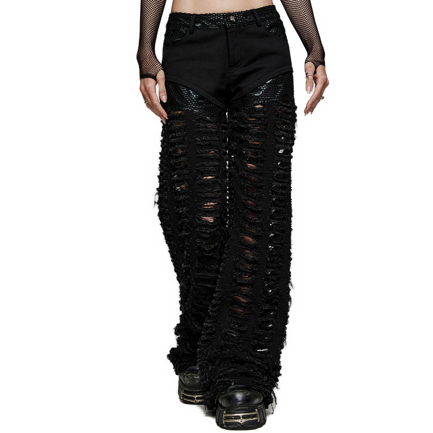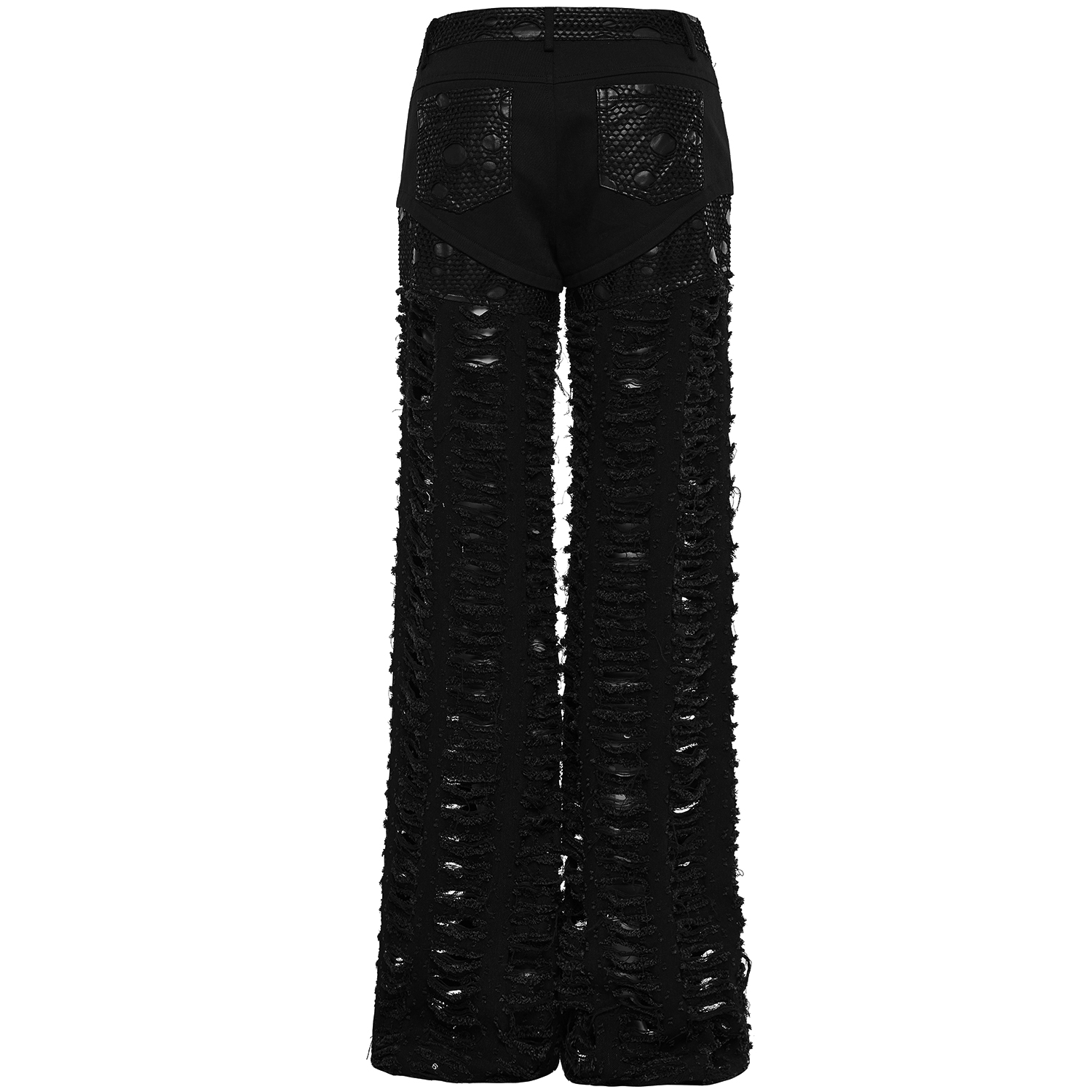 Pantalon taille basse coupe slim de style Gothic & Visual Kei. • Demi-jupe plissée amovible • Détails en cuir synthétique avec anneaux en D et rivets à clous sur les jambes et la taille •...