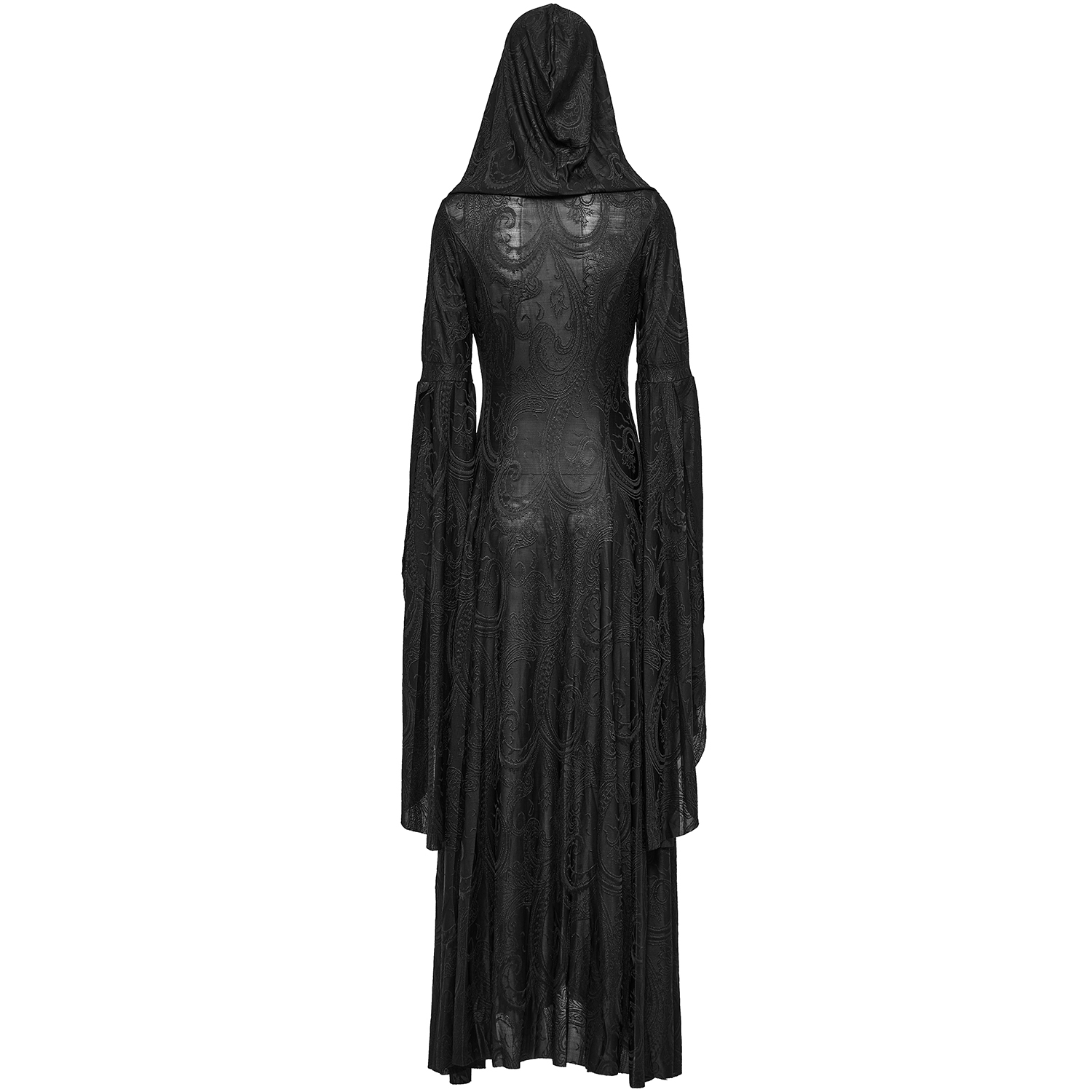 Manteau-robe gothique romantique à manches et capuche larges. • Brocart élaboré, tissu de type soie ressemblant à du damas et détails en mousseline transparente • Col en V • Capuche...