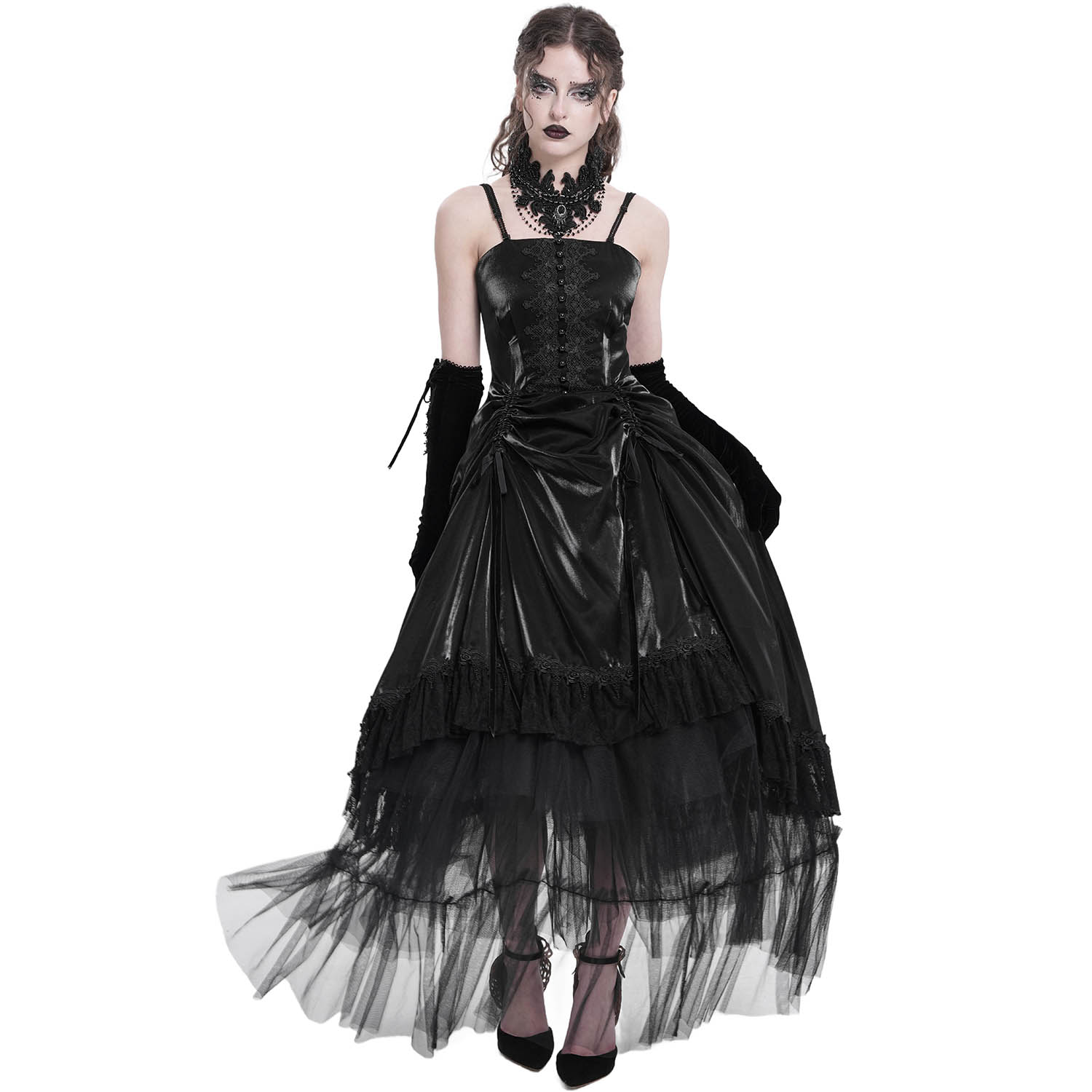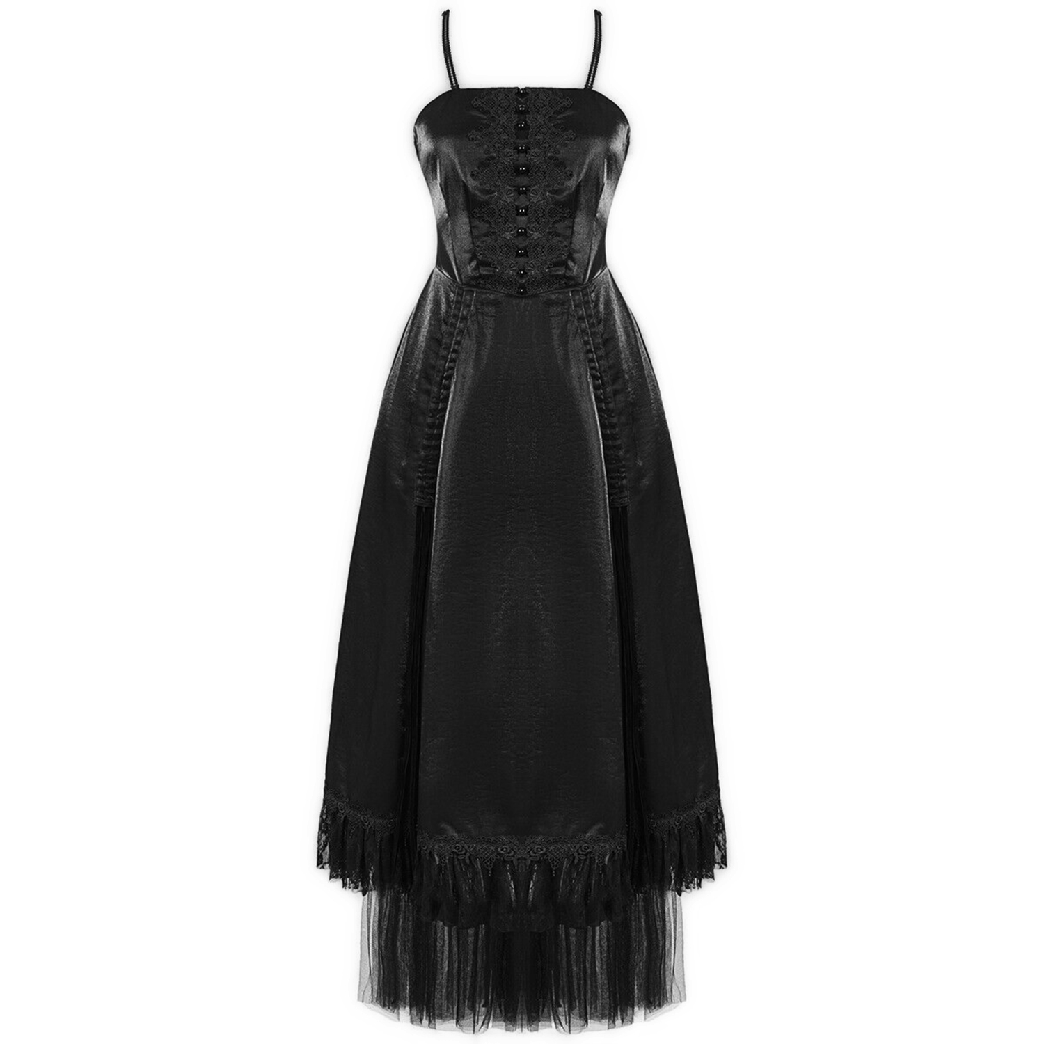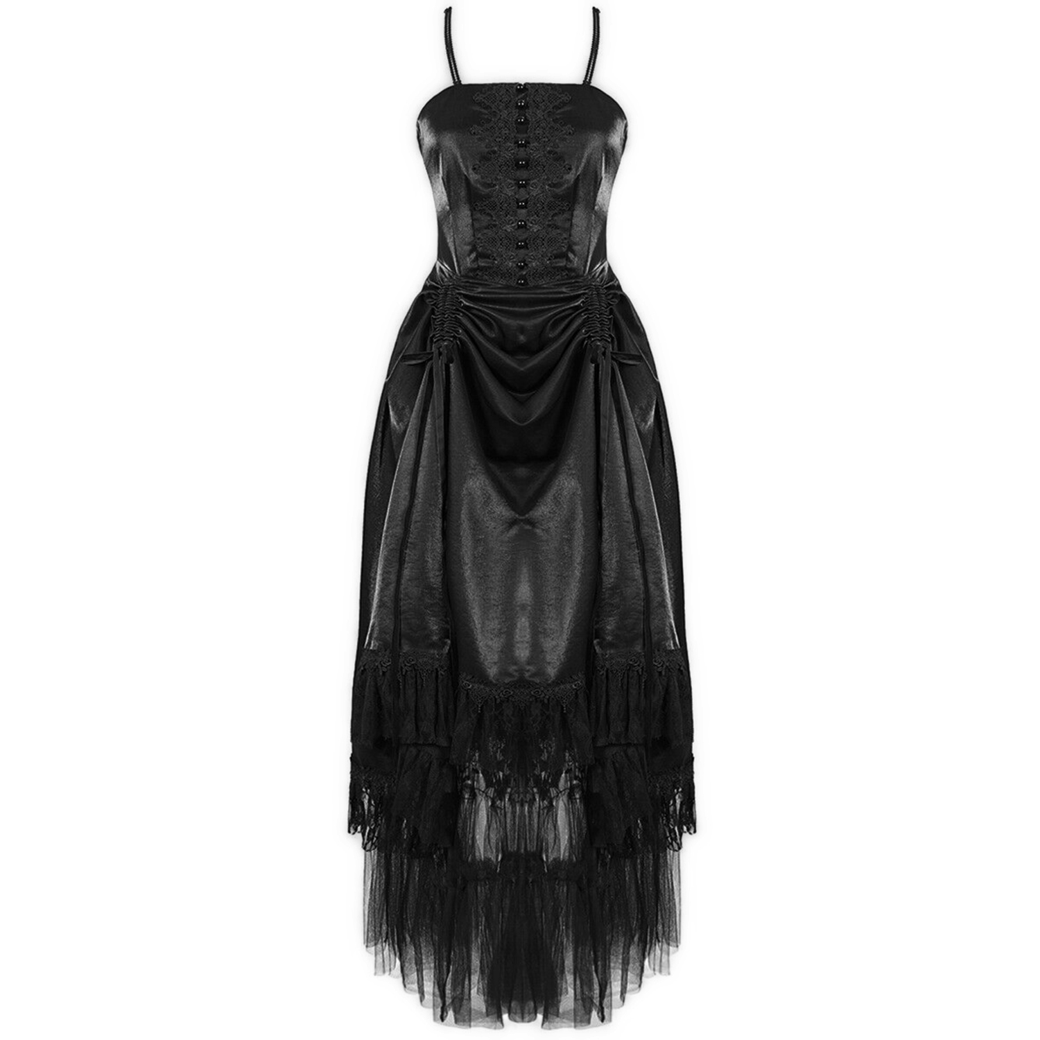 Robe bain de soleil gothique avec taille haute et buste noir. • Corps de corset sous la poitrine avec jupe à volants triple épaisseur • Bretelles non ajustables. • Les boutons argentés en forme...
