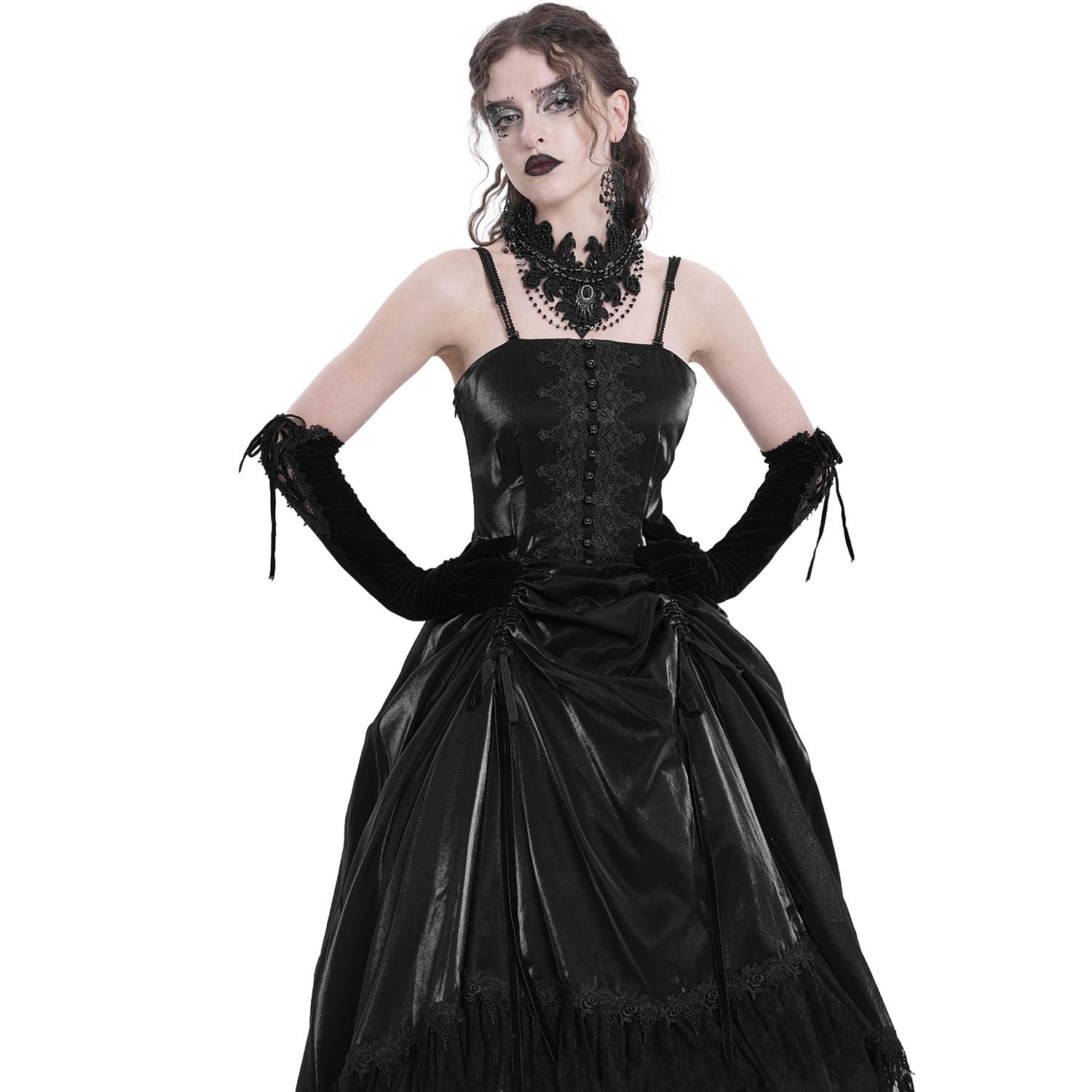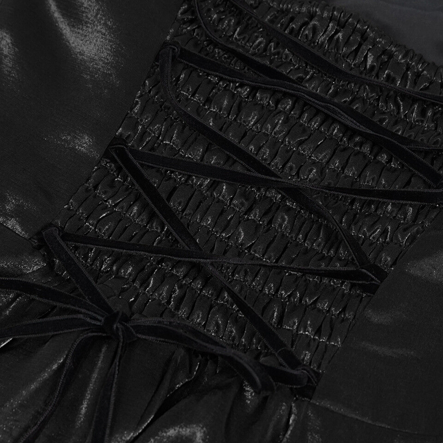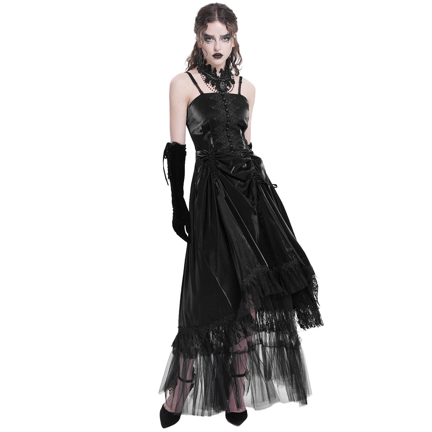 Robe bain de soleil gothique avec taille haute et buste noir. • Corps de corset sous la poitrine avec jupe à volants triple épaisseur • Bretelles non ajustables. • Les boutons argentés en forme...